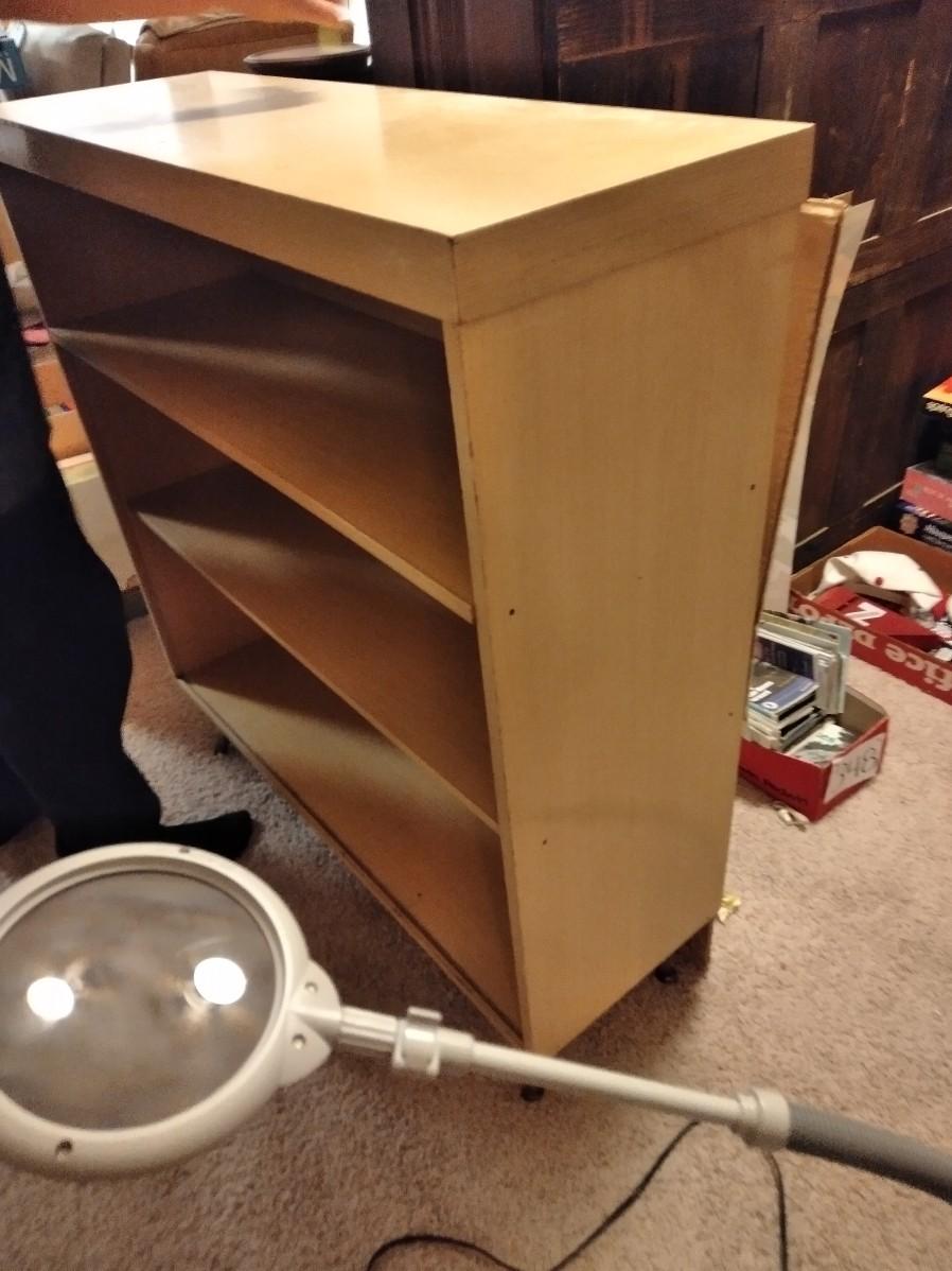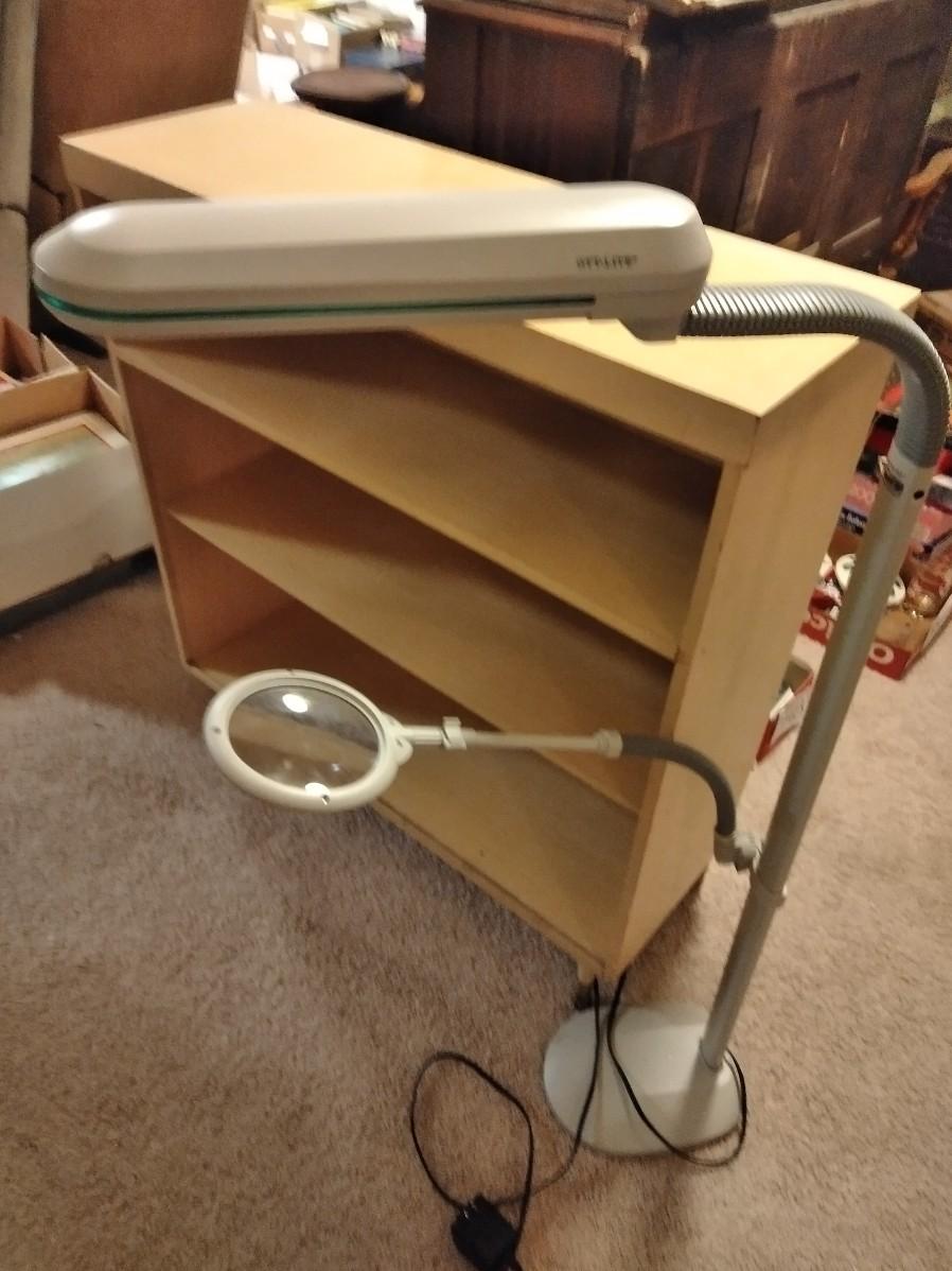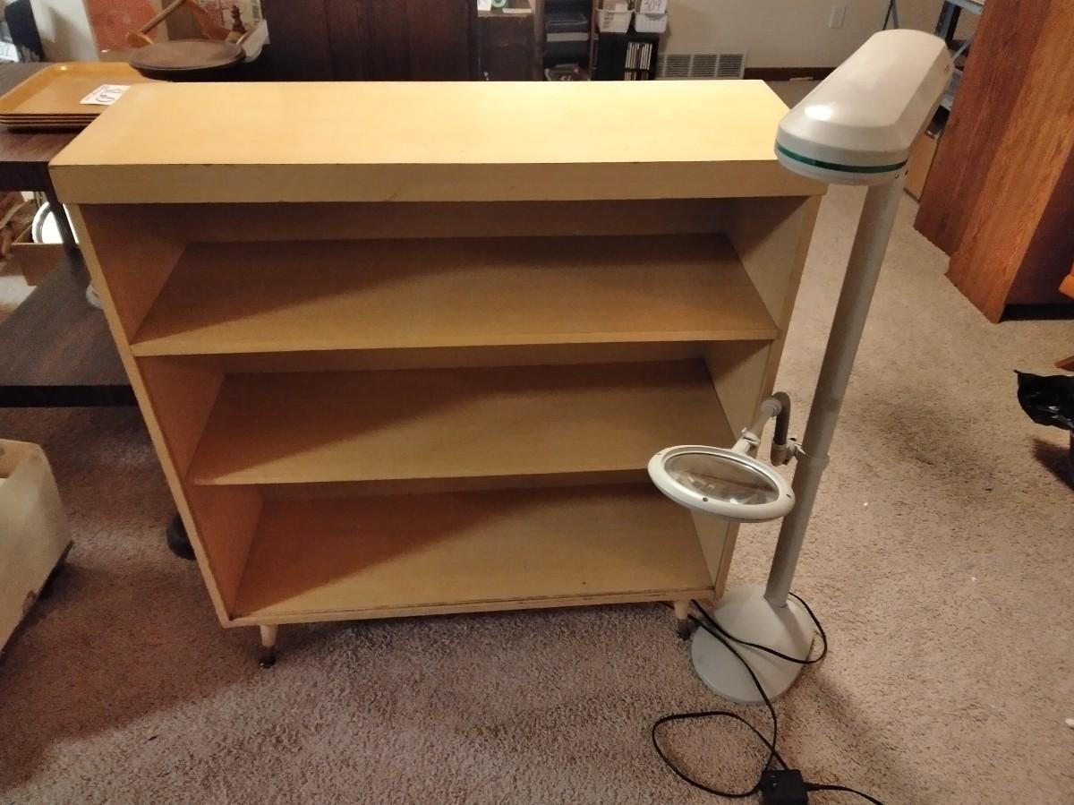 LOT 363 60'S STYLE BOOKCASE WITH MAGNIFYING CRAFT LIGHT