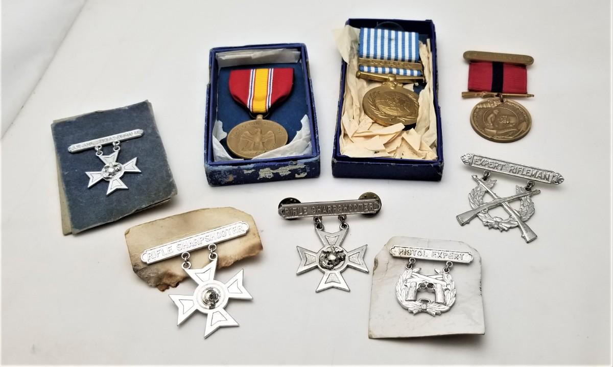 You get all you see here - Expert Rifleman, Rifle Sharpshooter (2), Pistol Expert, US Marine Corps, Pistol Sharpshooter, Korea medal, National Defense medal. All in vintage condition.