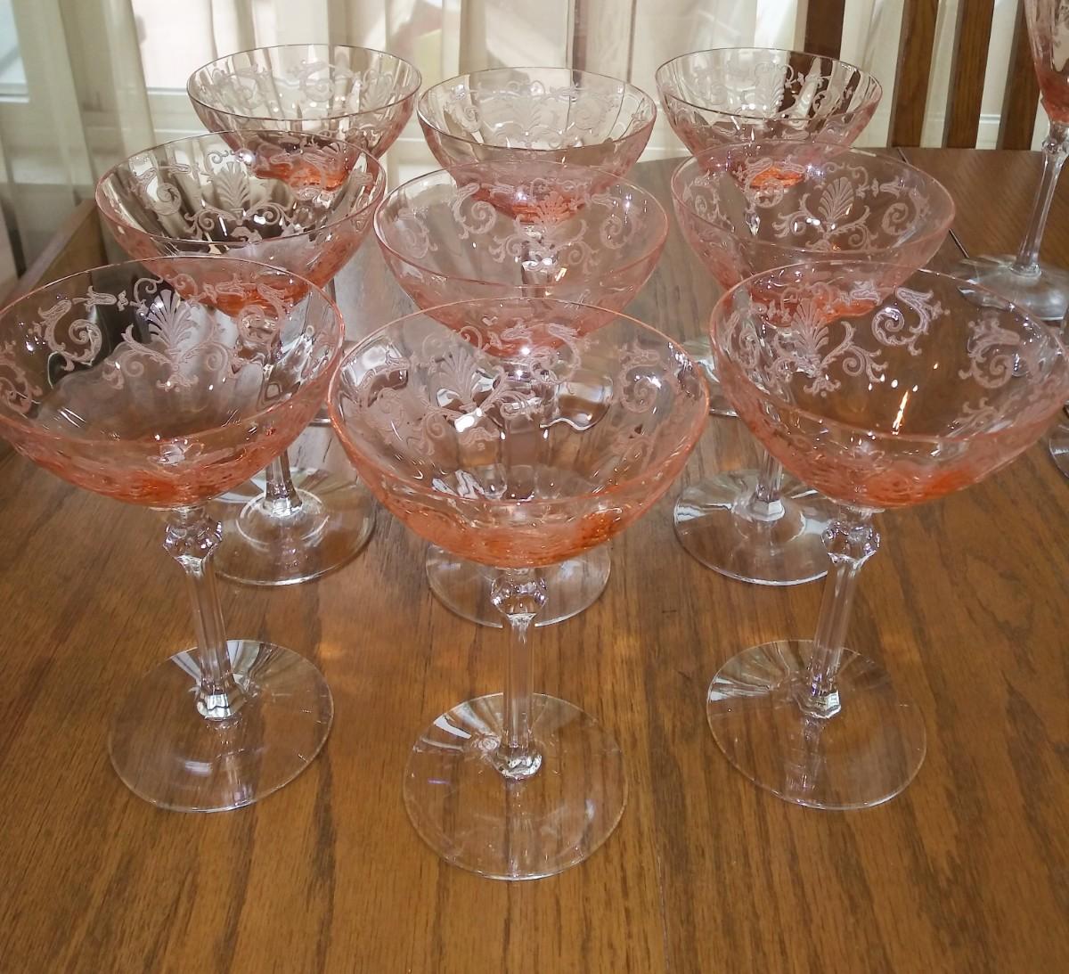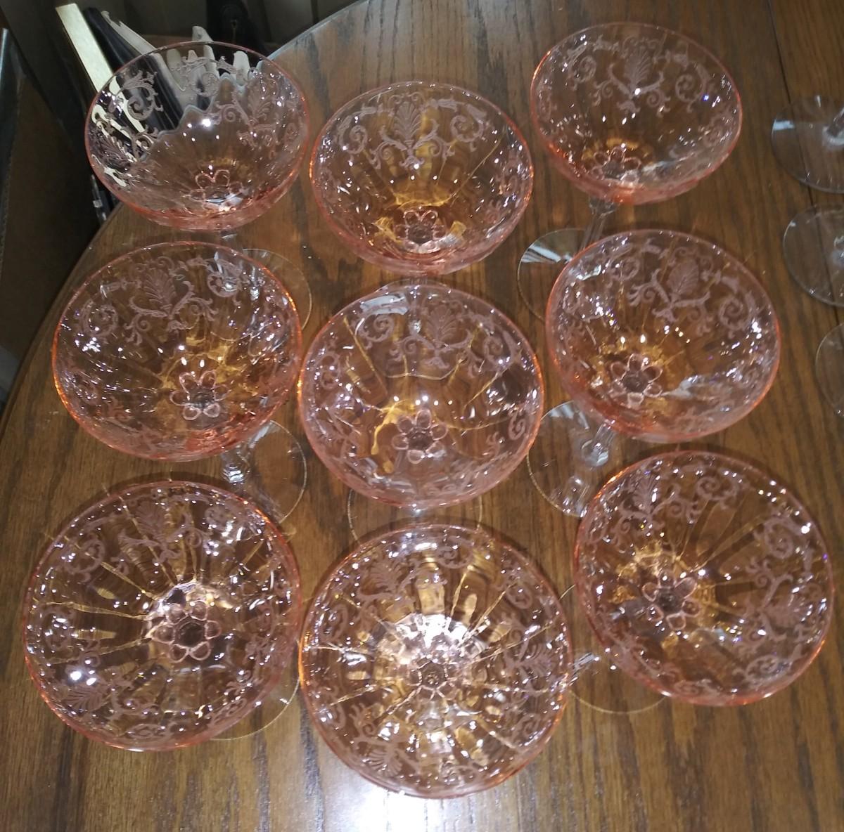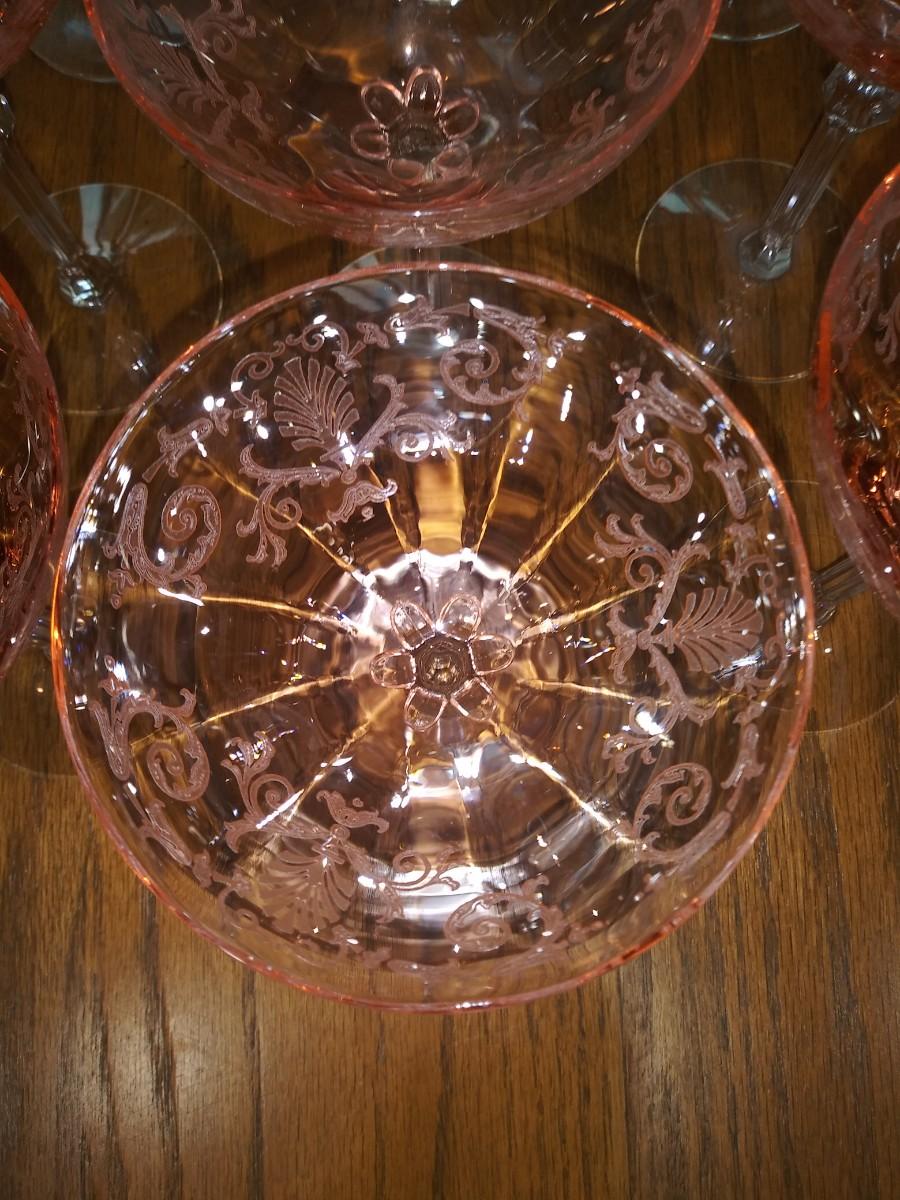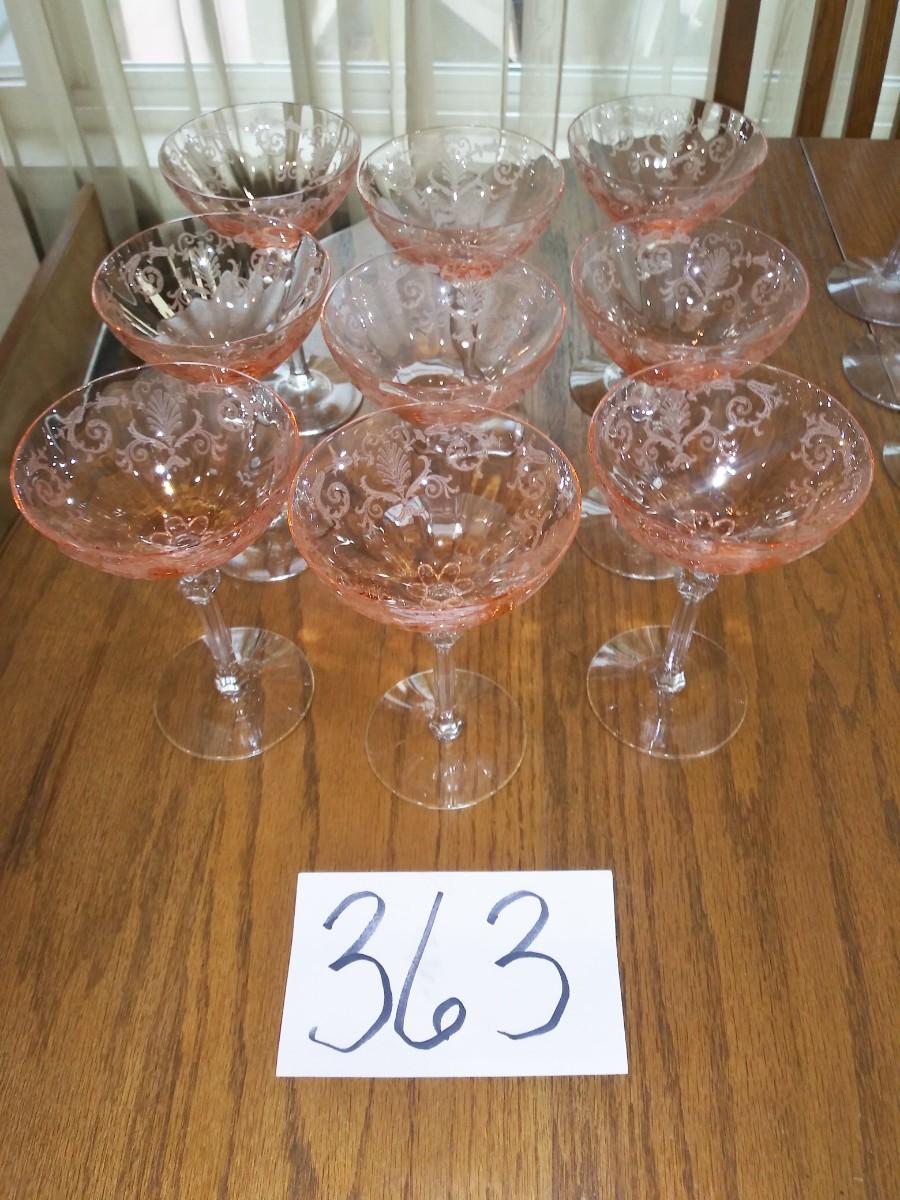 9 ETCHED PINK DEPRESSION STEMMED GLASSES