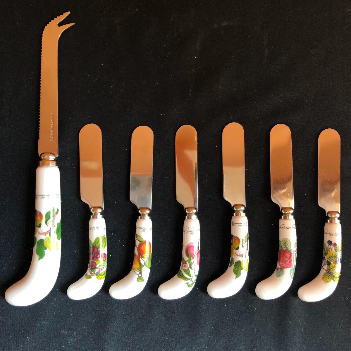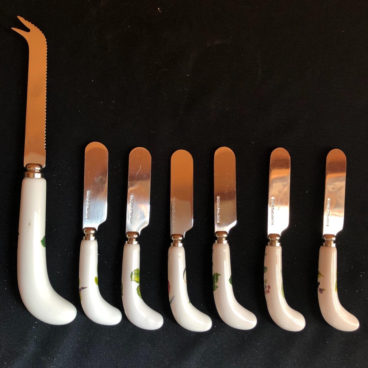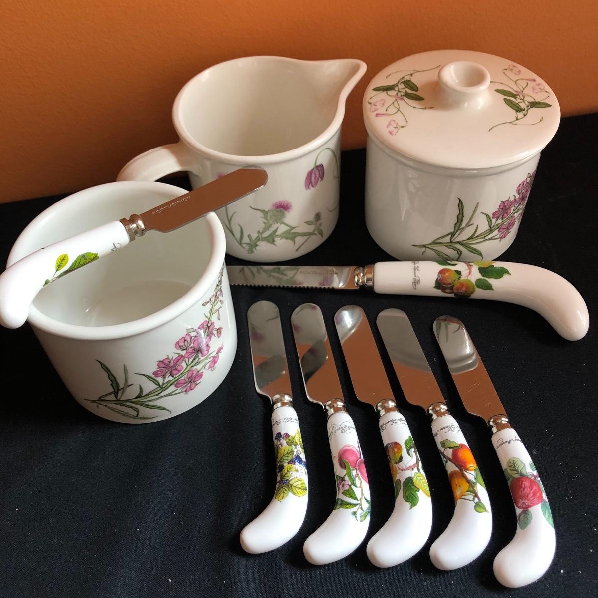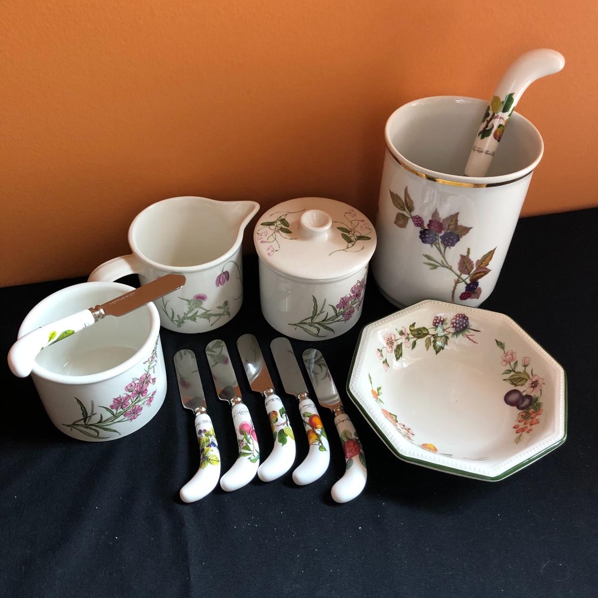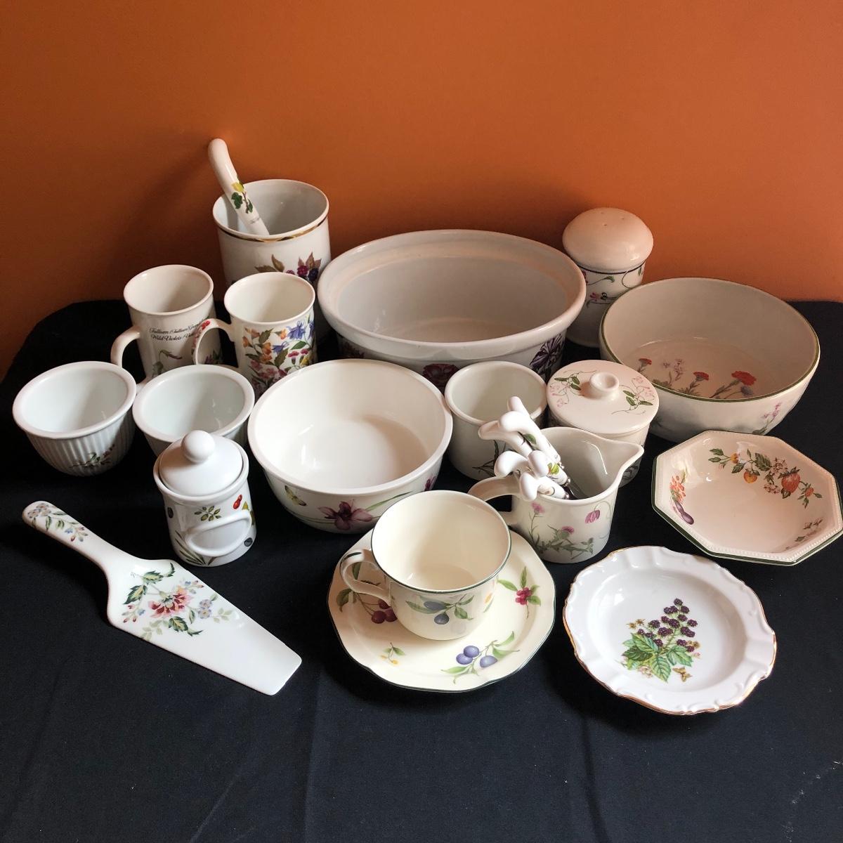 With this collection of floral Portmeirion and other ceramic-ware, you will be well prepared for any hosting occasion. The first items in this lot are a Royal Worcester Evesham cylindrical pot, a Corden Bleu ovular baking dish, two small Corden Bleu bowls, a Noritake Gala Cuisine teacup and saucer, and a Tullium mug. The Portmeirion items included are a small circular dish, matching cream and sugar dishes, six cheese knives, and a larger aerated knife. Remaining are a pepper shaker, a cake server, a small lidded jar, a floral mug by Roy Kirkham, a porcelain bowl made in France, a deep bowl, a shallow octagonal dish with fruit decor, and lastly, a shallow dish with decorative blackberries. Keep the charcuterie coming with this assortment of dishes from England, France, Japan, and China!