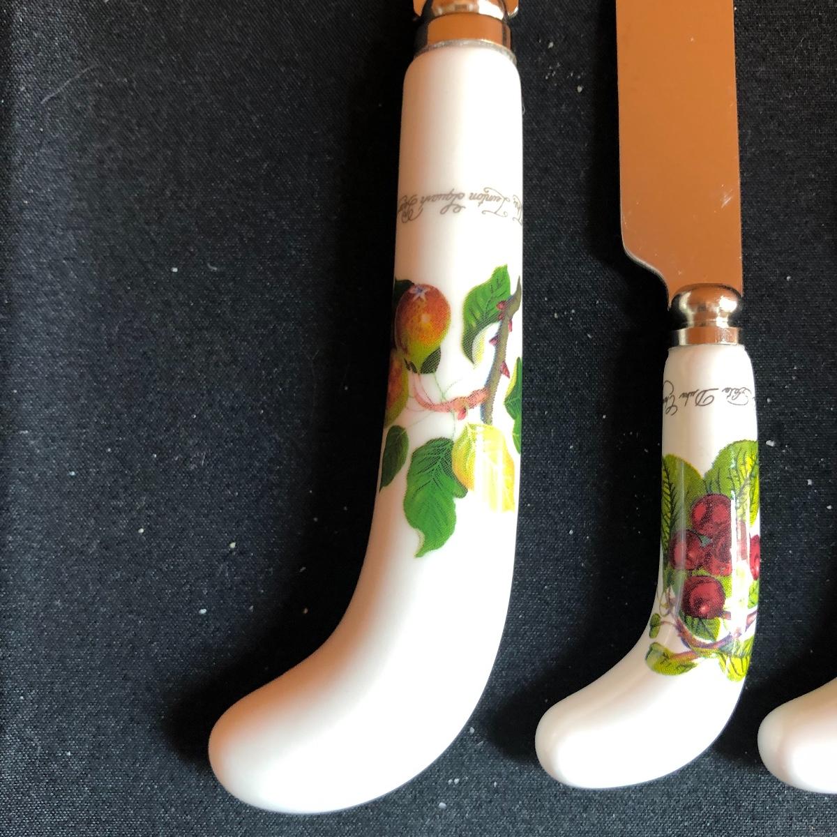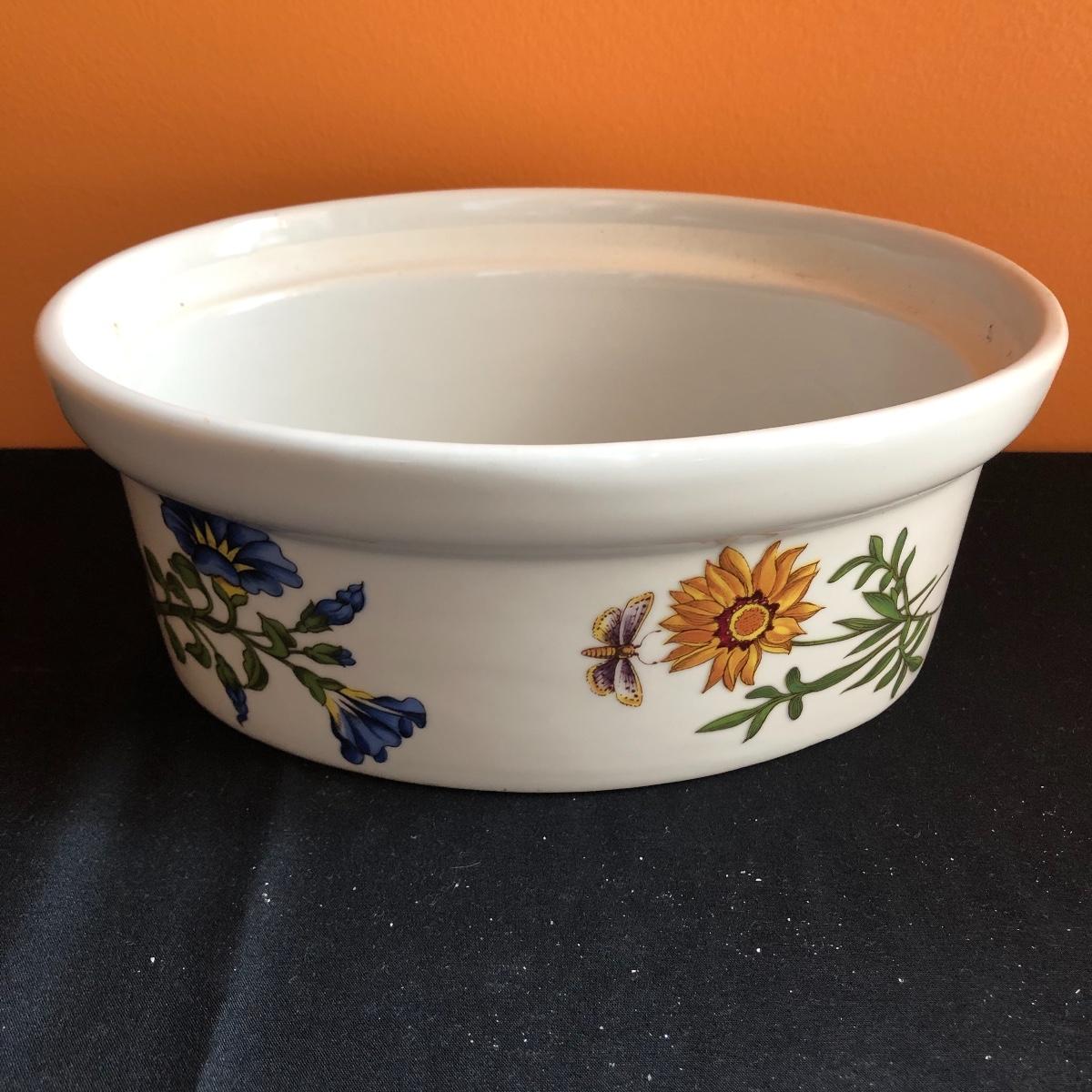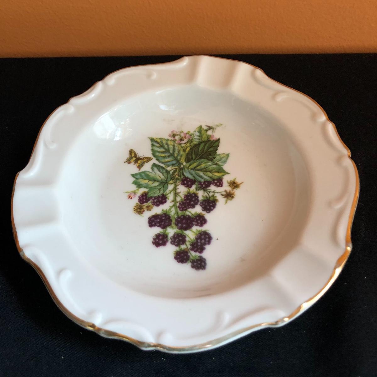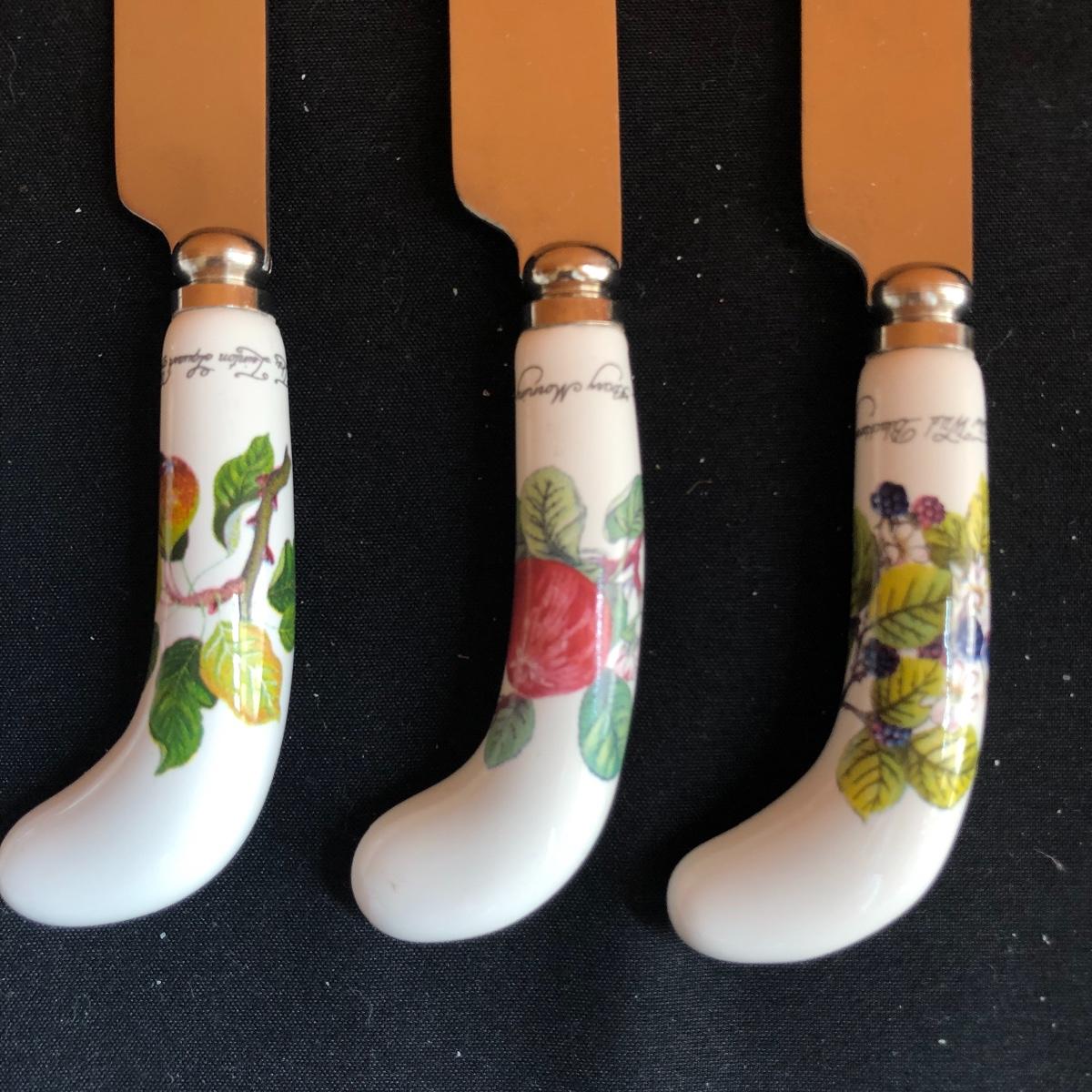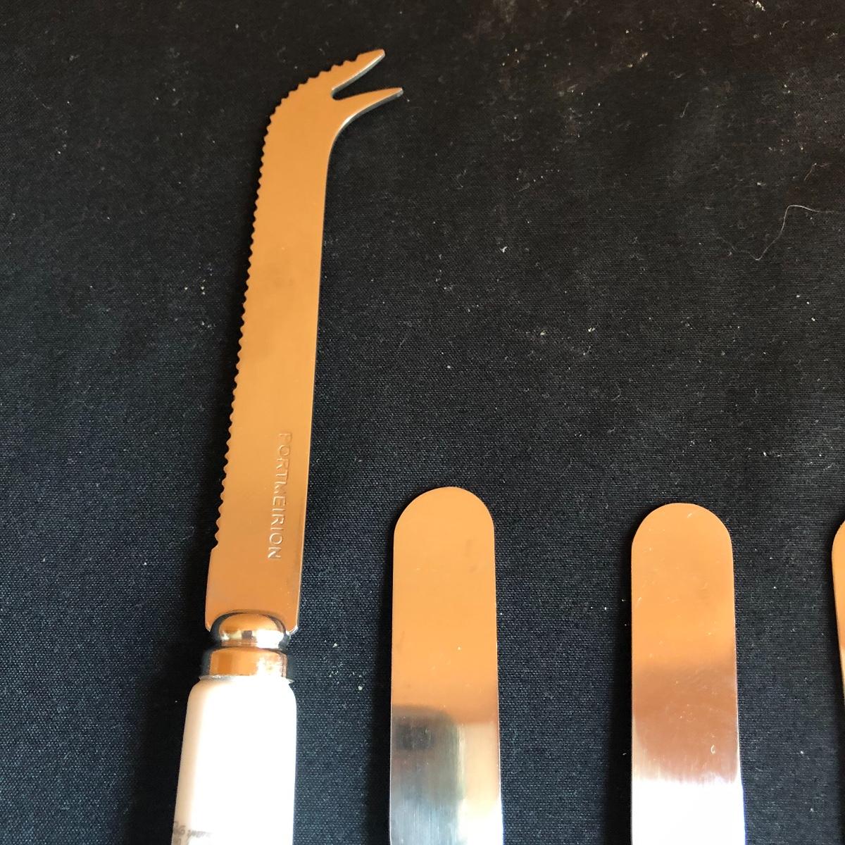 With this collection of floral Portmeirion and other ceramic-ware, you will be well prepared for any hosting occasion. The first items in this lot are a Royal Worcester Evesham cylindrical pot, a Corden Bleu ovular baking dish, two small Corden Bleu bowls, a Noritake Gala Cuisine teacup and saucer, and a Tullium mug. The Portmeirion items included are a small circular dish, matching cream and sugar dishes, six cheese knives, and a larger aerated knife. Remaining are a pepper shaker, a cake server, a small lidded jar, a floral mug by Roy Kirkham, a porcelain bowl made in France, a deep bowl, a shallow octagonal dish with fruit decor, and lastly, a shallow dish with decorative blackberries. Keep the charcuterie coming with this assortment of dishes from England, France, Japan, and China!