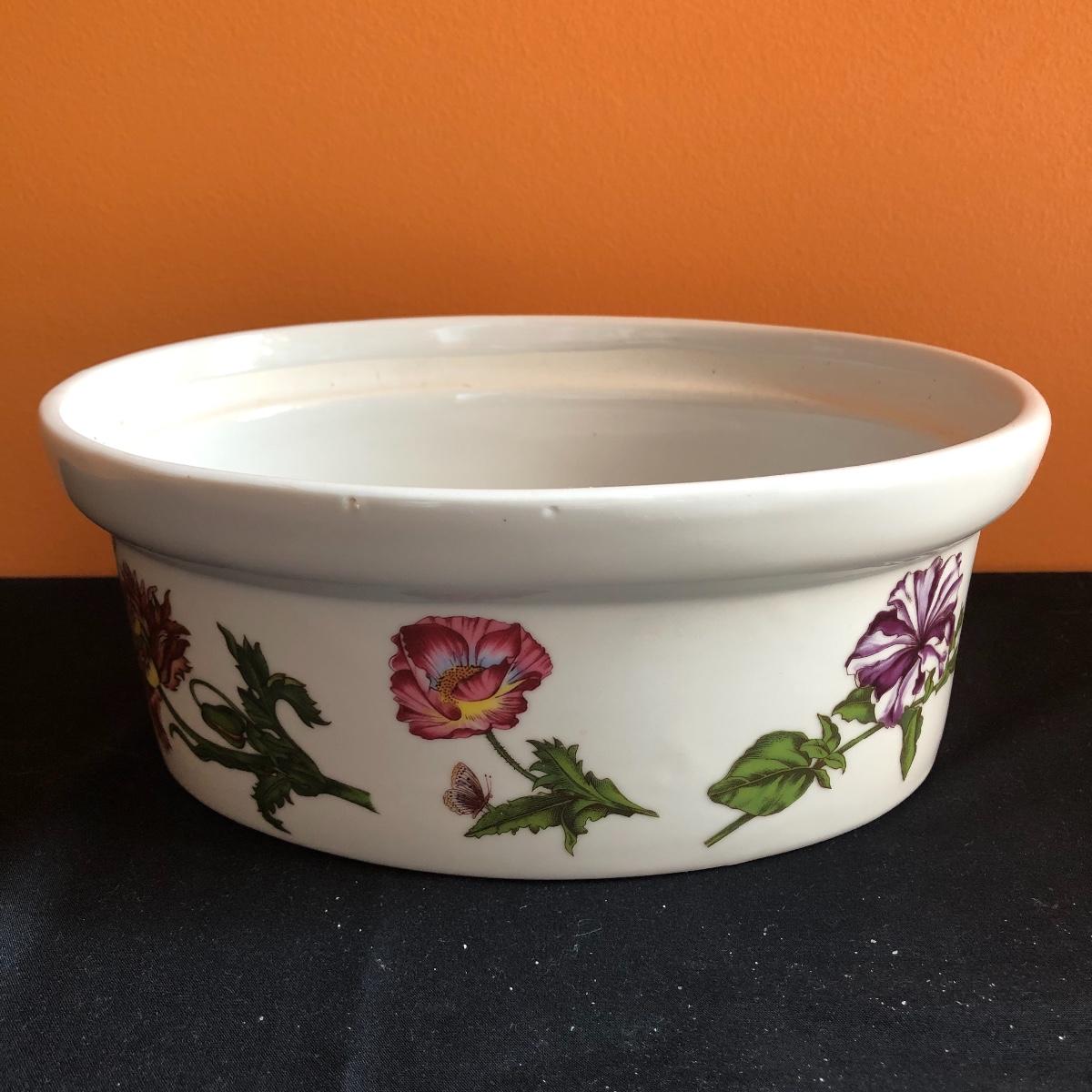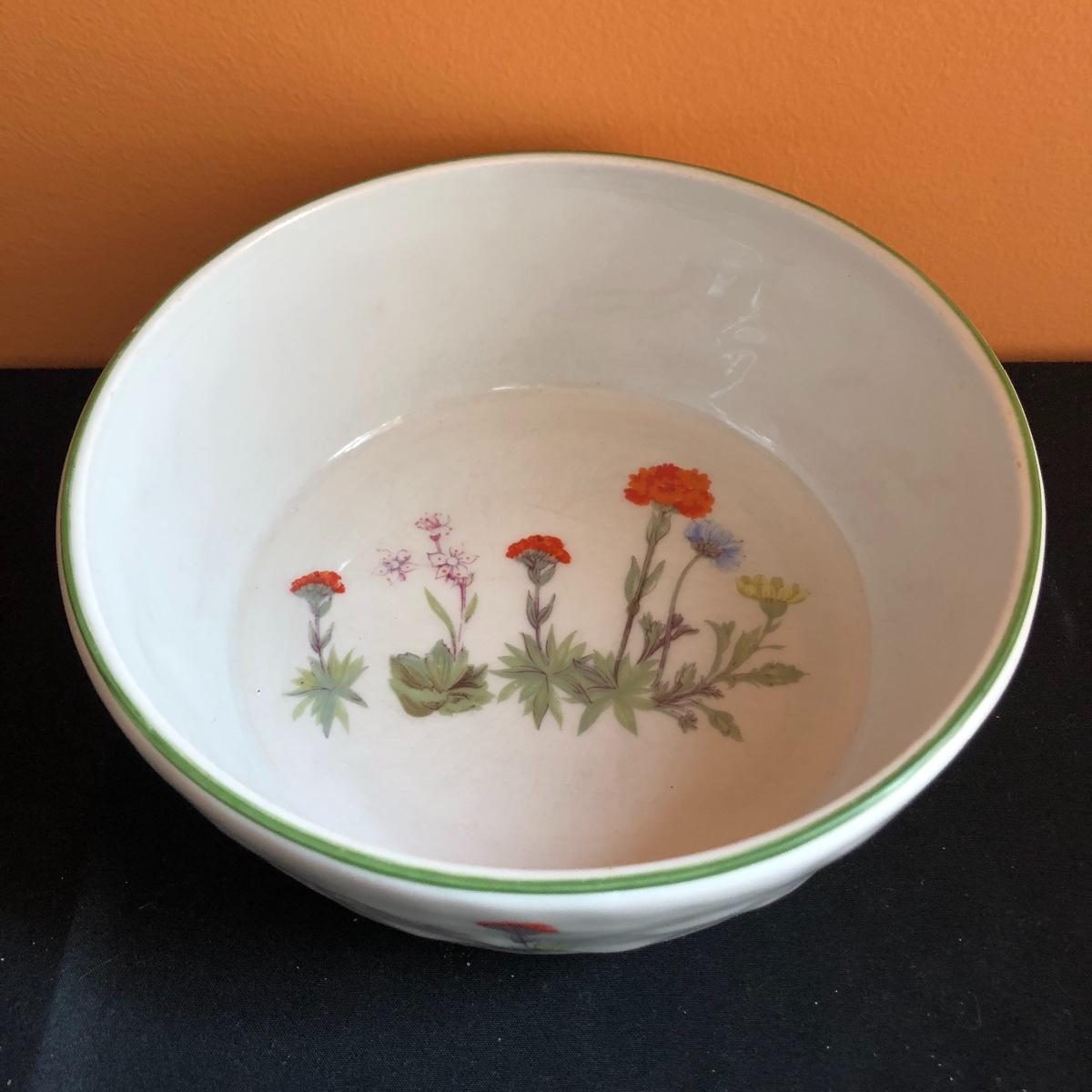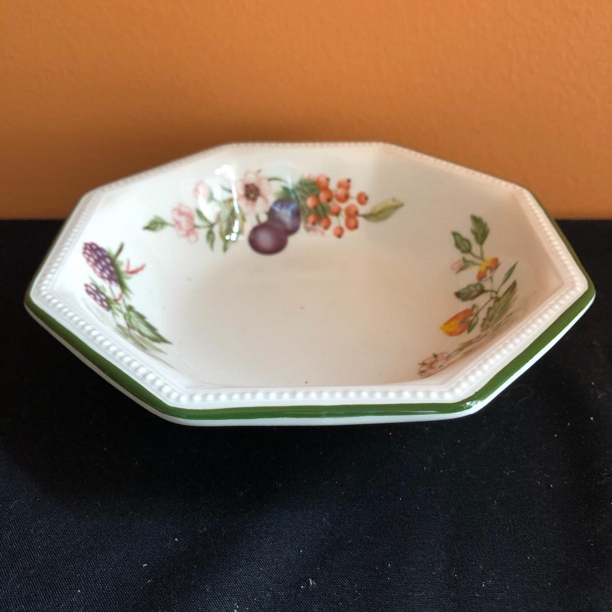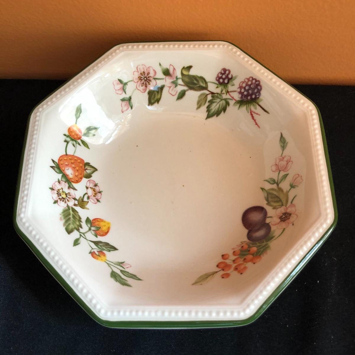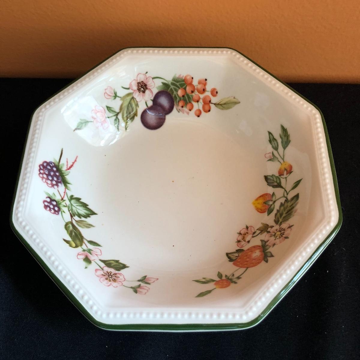 With this collection of floral Portmeirion and other ceramic-ware, you will be well prepared for any hosting occasion. The first items in this lot are a Royal Worcester Evesham cylindrical pot, a Corden Bleu ovular baking dish, two small Corden Bleu bowls, a Noritake Gala Cuisine teacup and saucer, and a Tullium mug. The Portmeirion items included are a small circular dish, matching cream and sugar dishes, six cheese knives, and a larger aerated knife. Remaining are a pepper shaker, a cake server, a small lidded jar, a floral mug by Roy Kirkham, a porcelain bowl made in France, a deep bowl, a shallow octagonal dish with fruit decor, and lastly, a shallow dish with decorative blackberries. Keep the charcuterie coming with this assortment of dishes from England, France, Japan, and China!