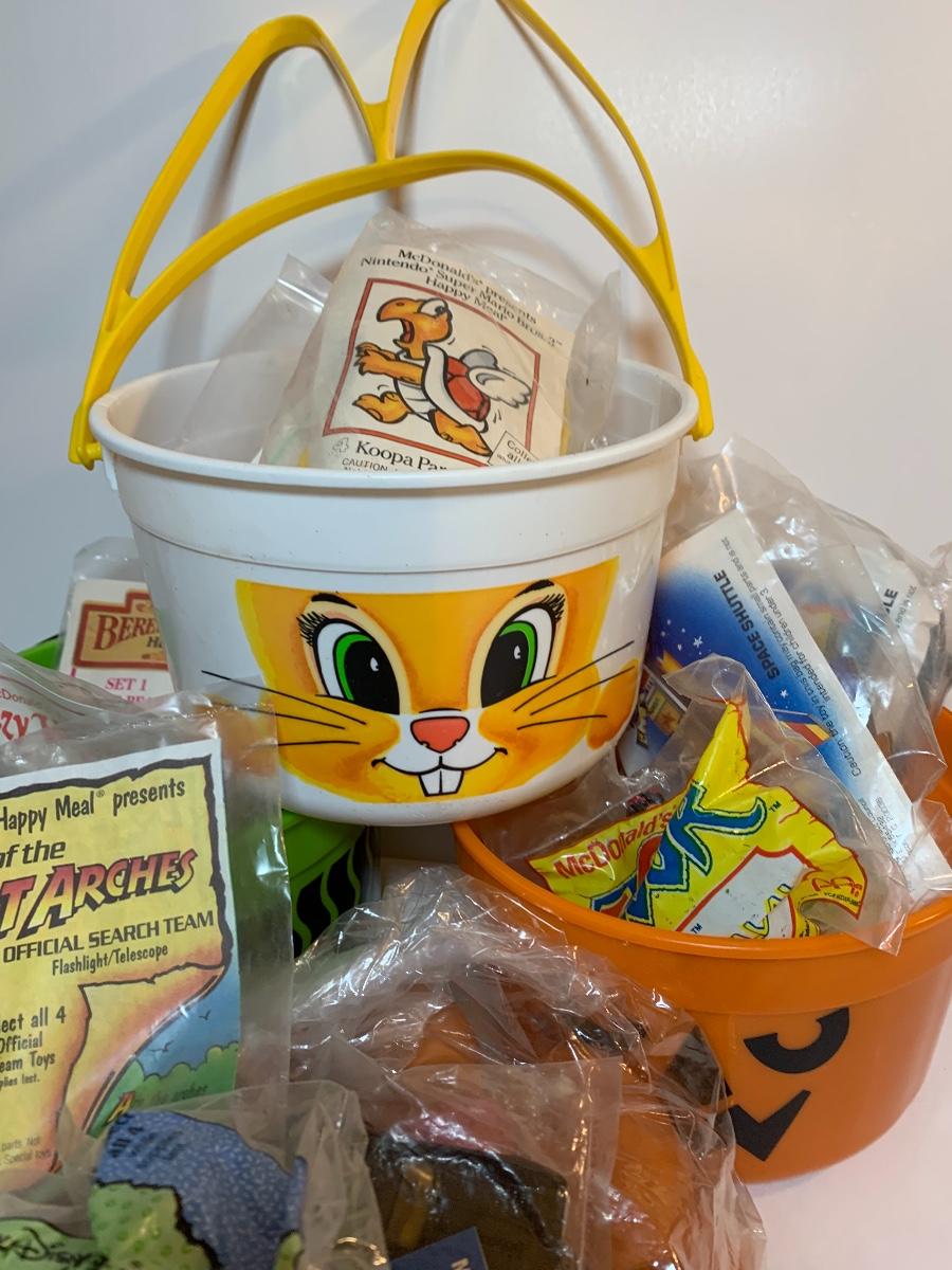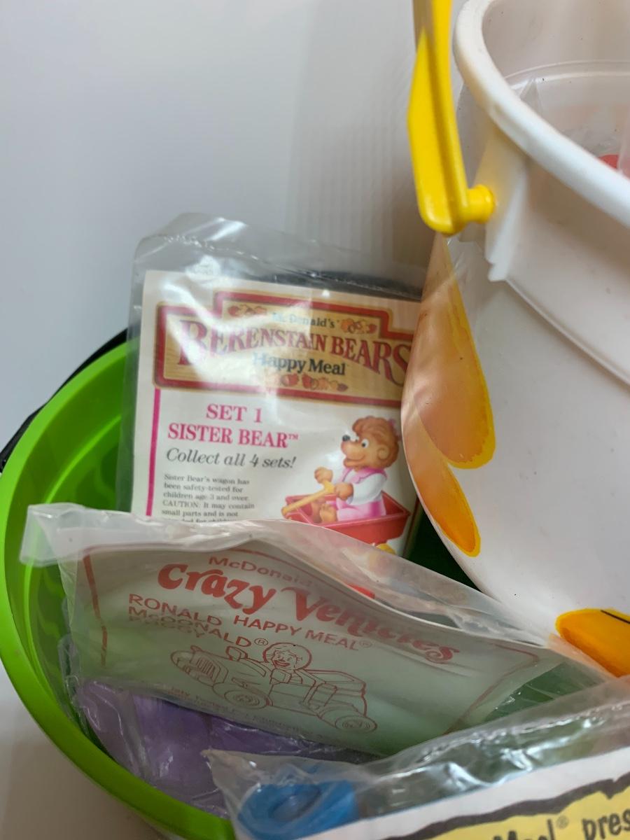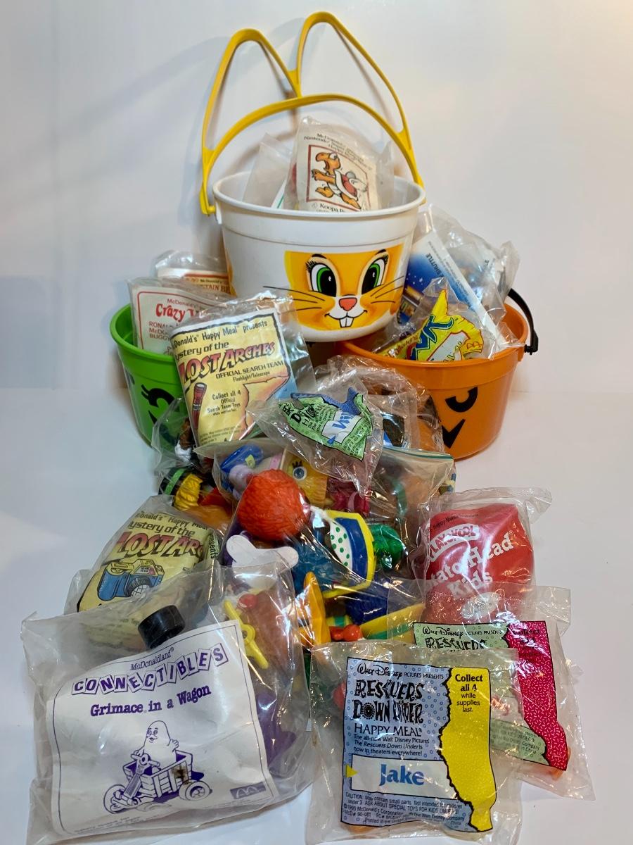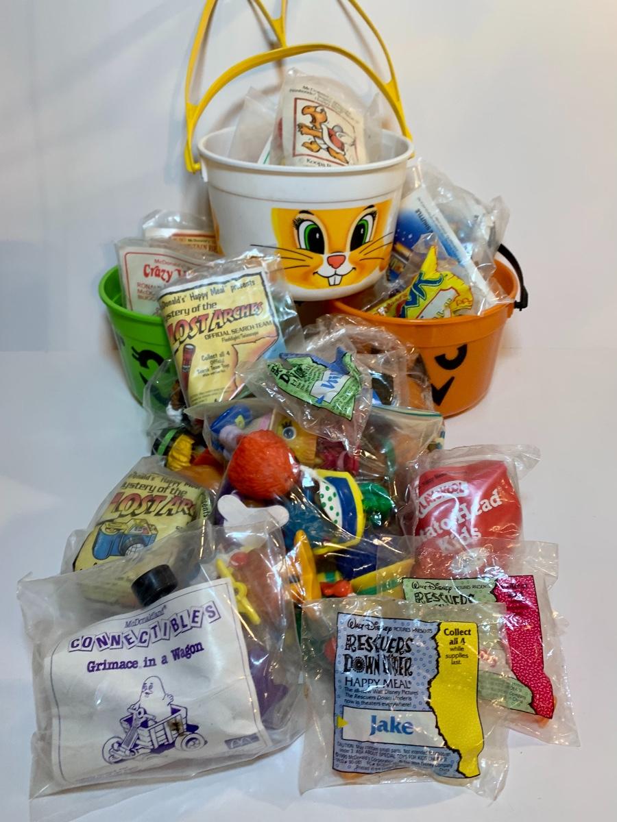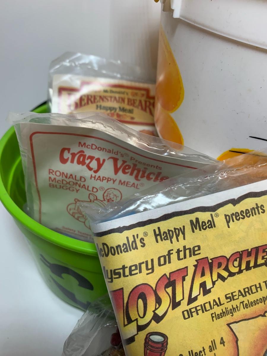Included in this lot: are opened and unopened vintage Happy Meal toys and 3 pails.