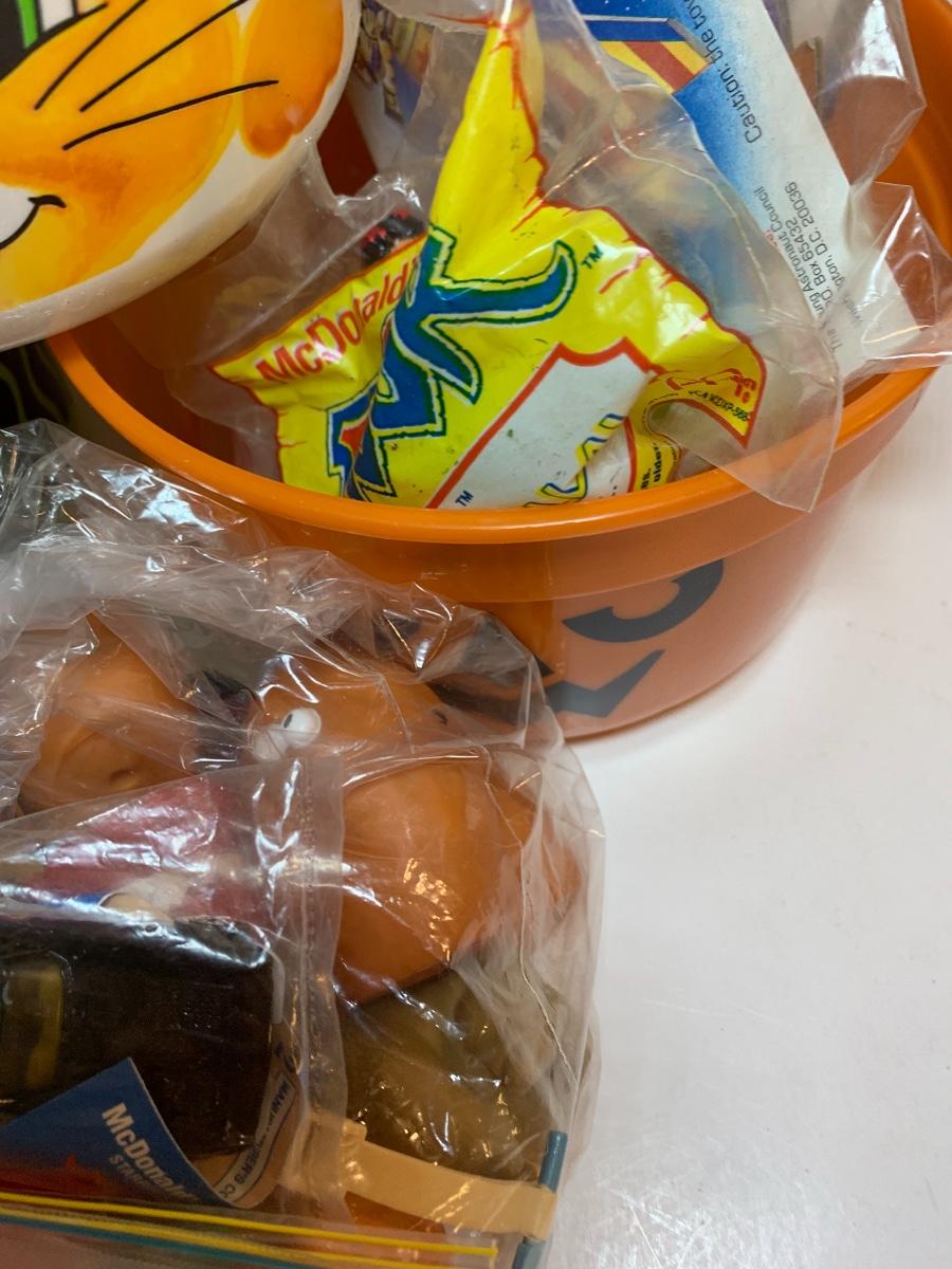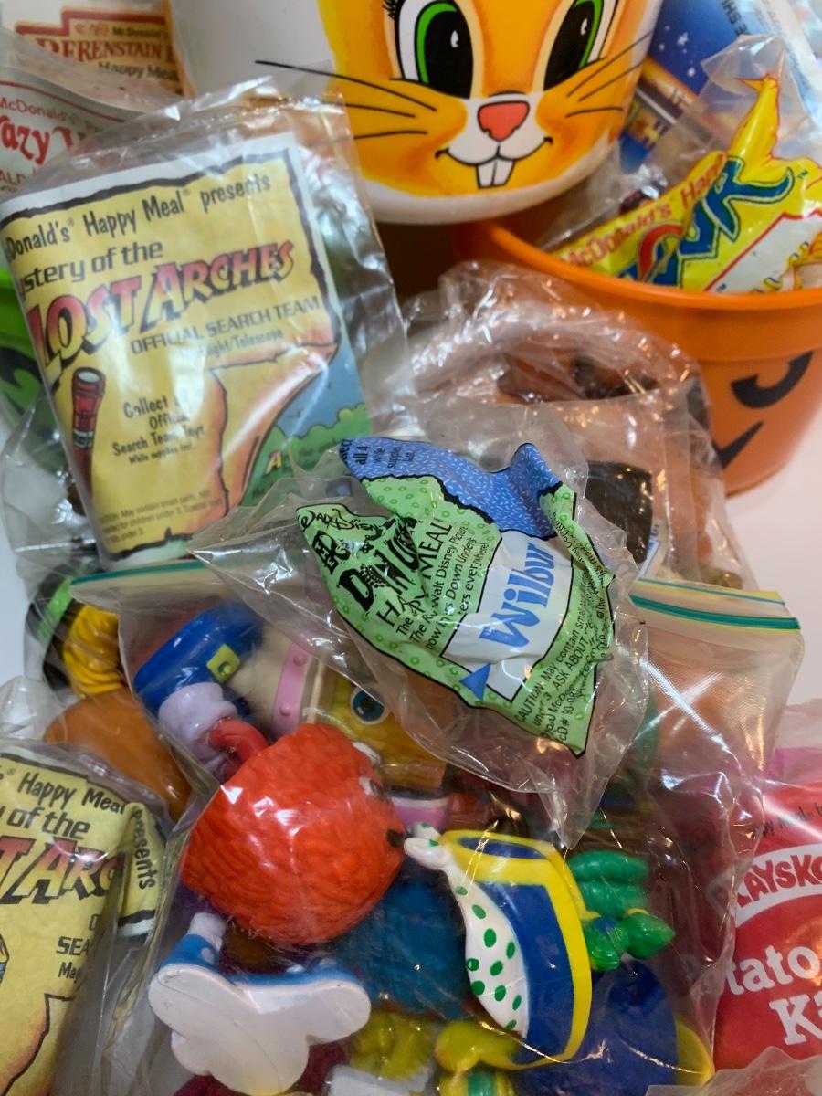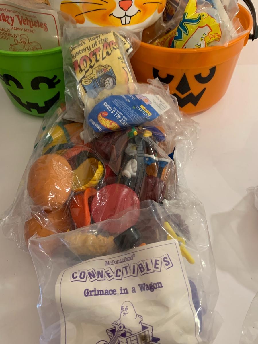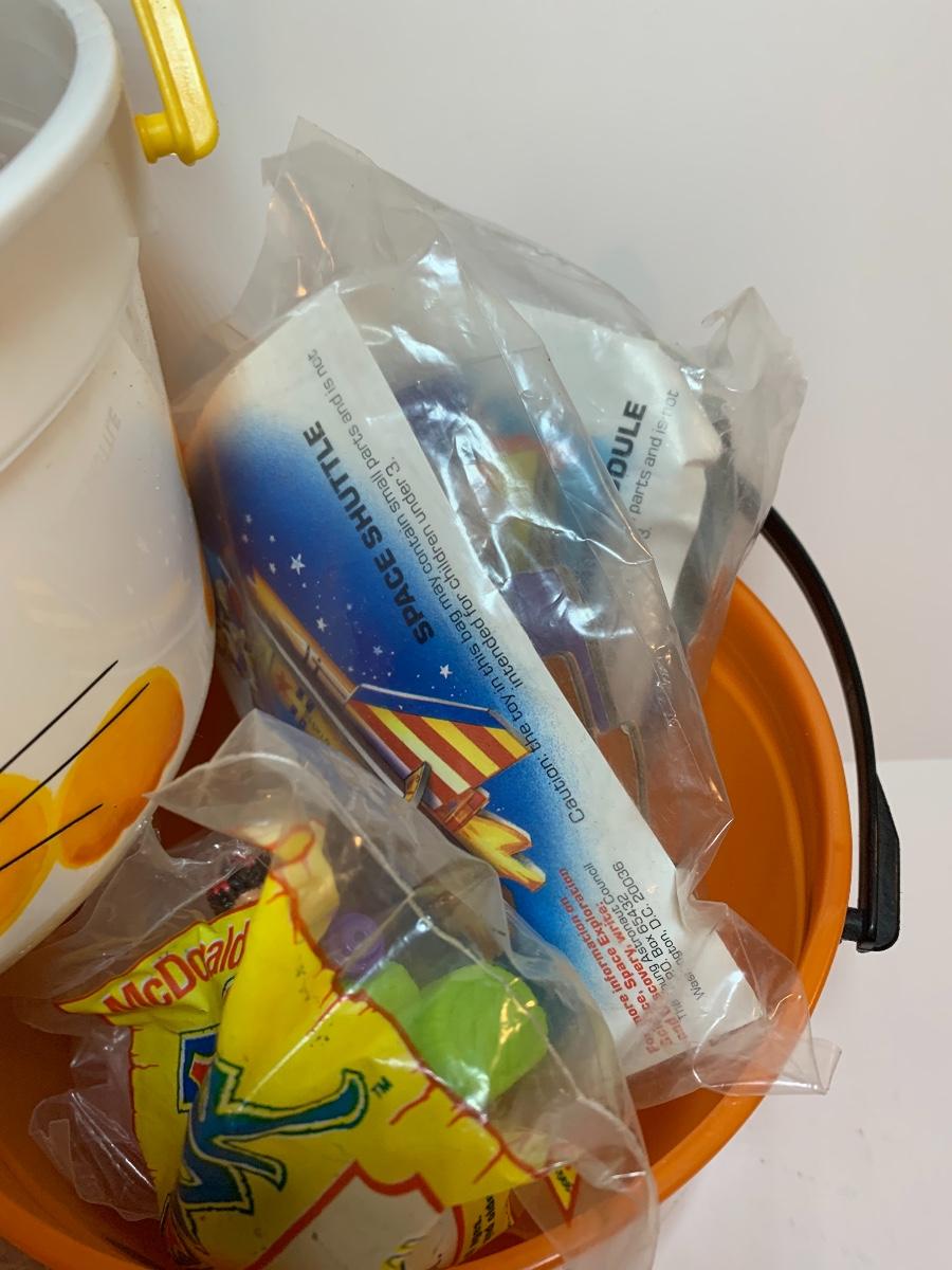 Included in this lot: are opened and unopened vintage Happy Meal toys and 3 pails.