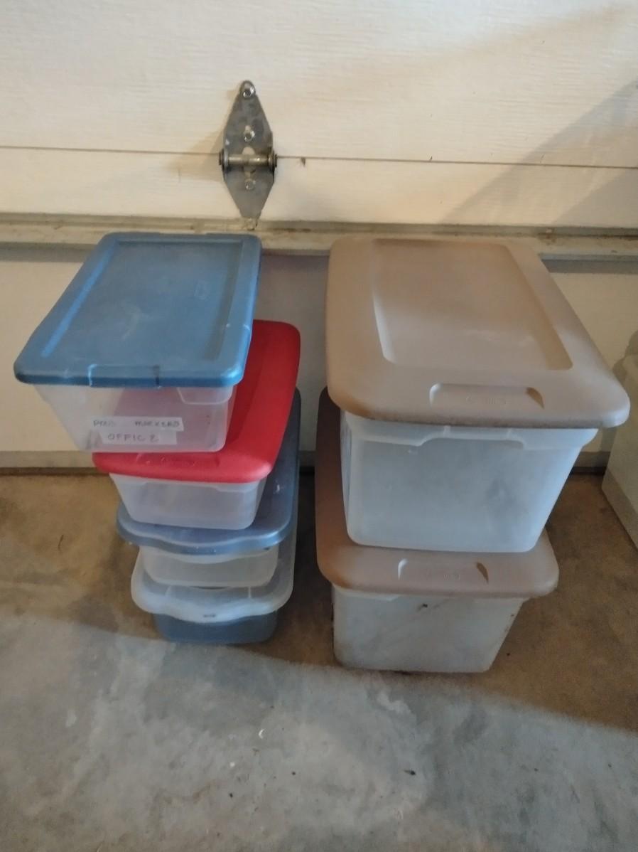 SHOE BOX SIZED, AND MEDIUM SIZED TOTES WITH LIDS. SIX TOTES TOTAL THESE NEED CLEANED