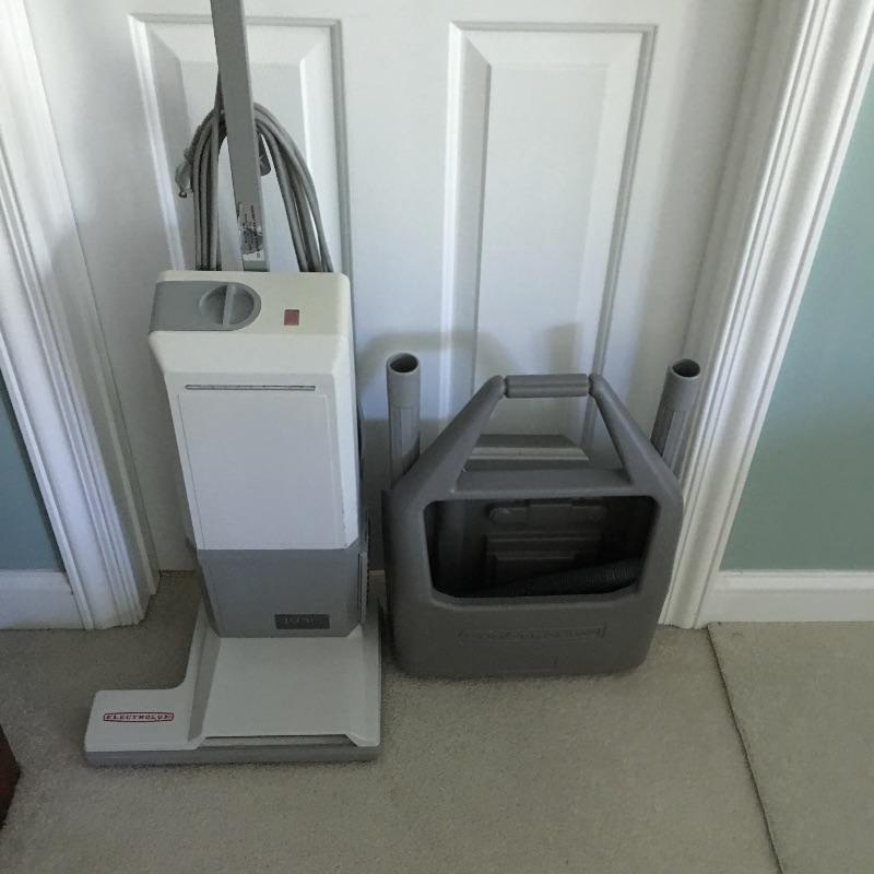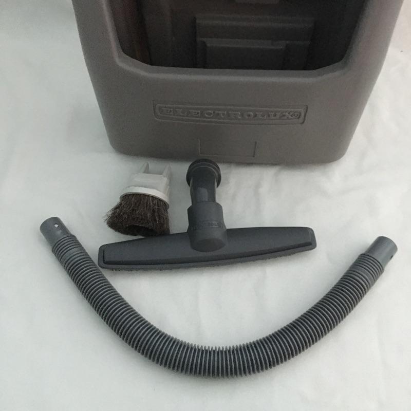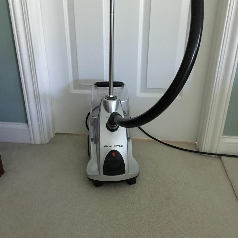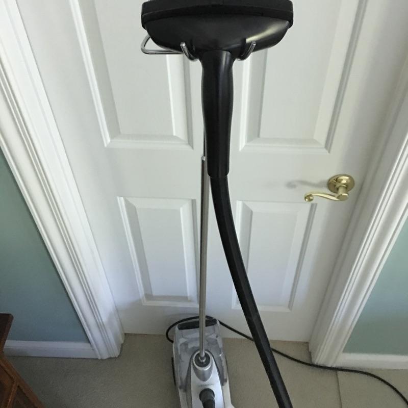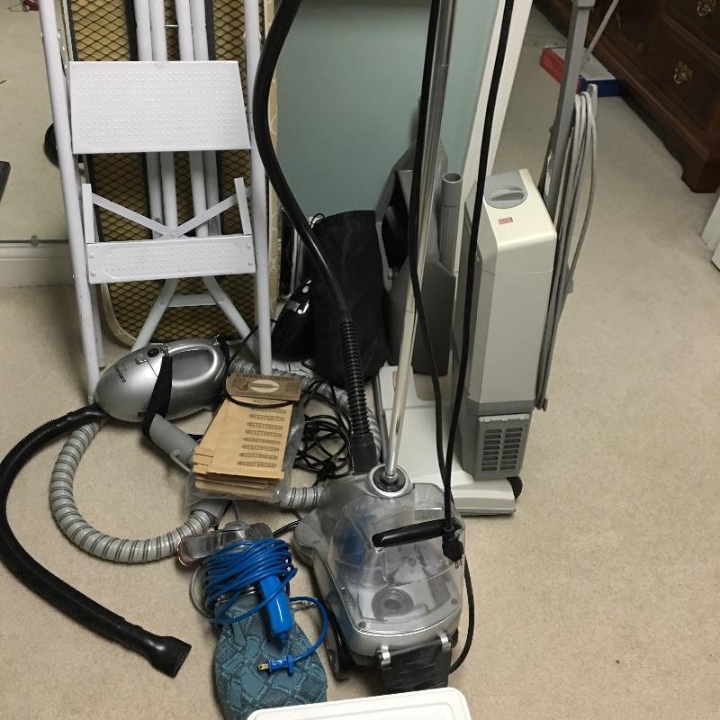 This assortment of household gadgets includes an Electrolux, Big Shark and Black and Decker vacuums, Rowenta Steamer and Iron, step stool and more.