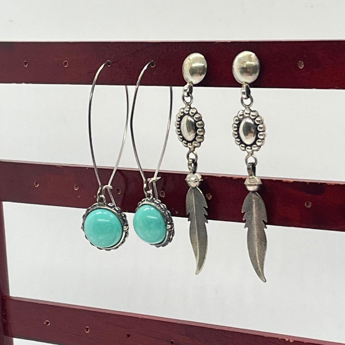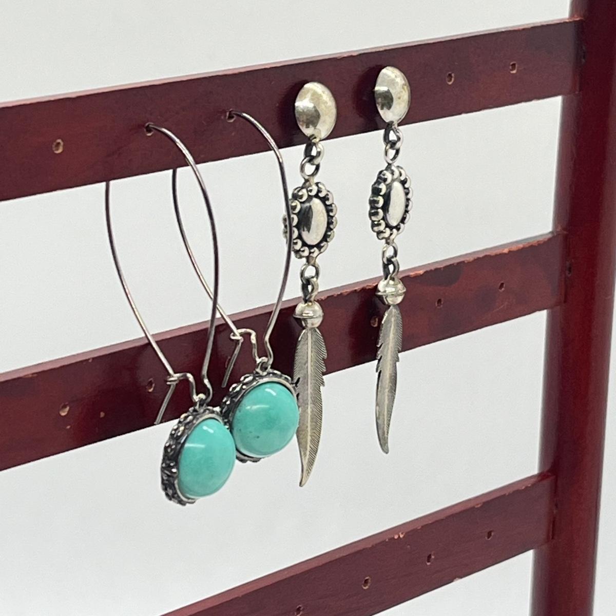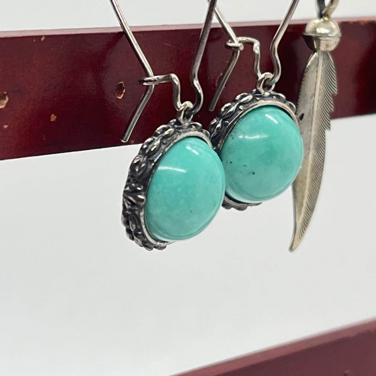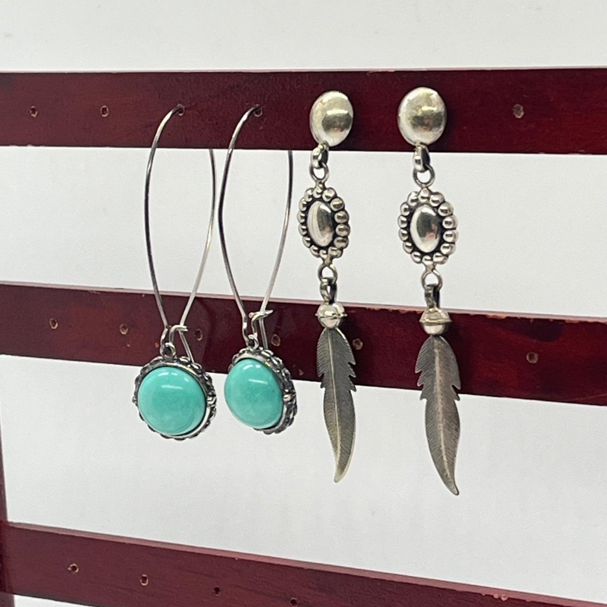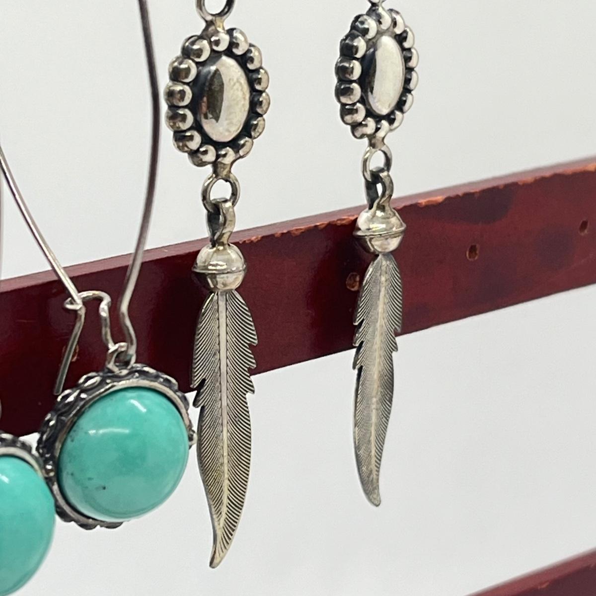 Lot 364J: Round Campitos Turquoise Long Drop Pierced Earrings and Sterling Feather Drop Earrings