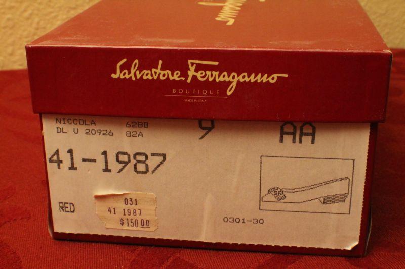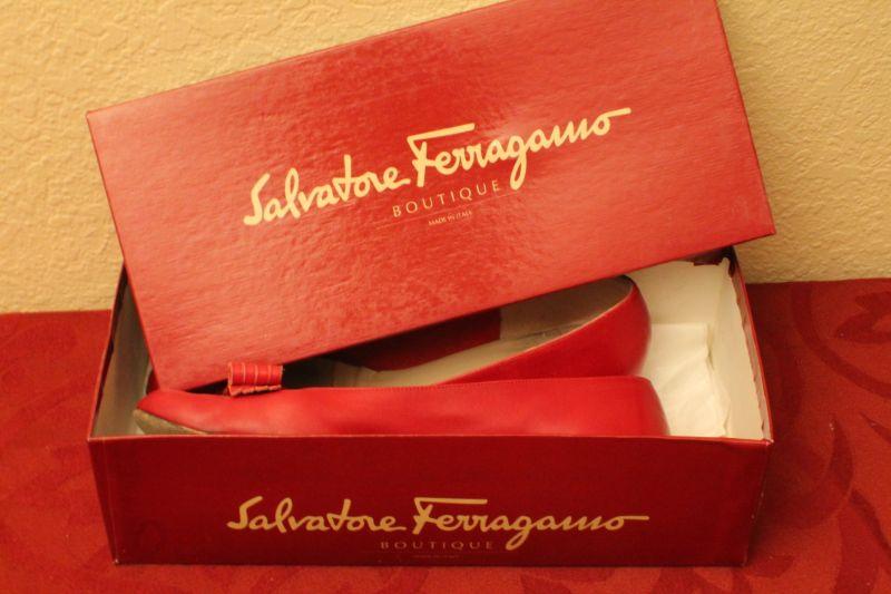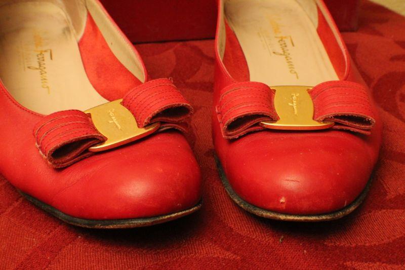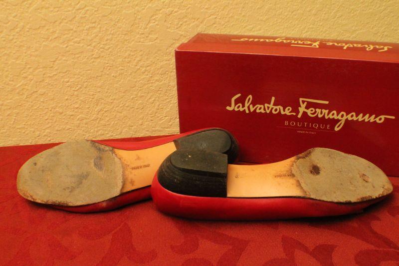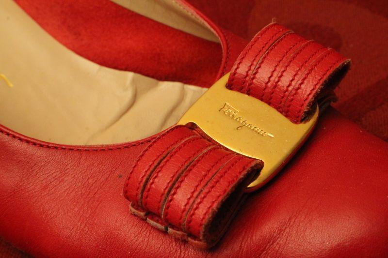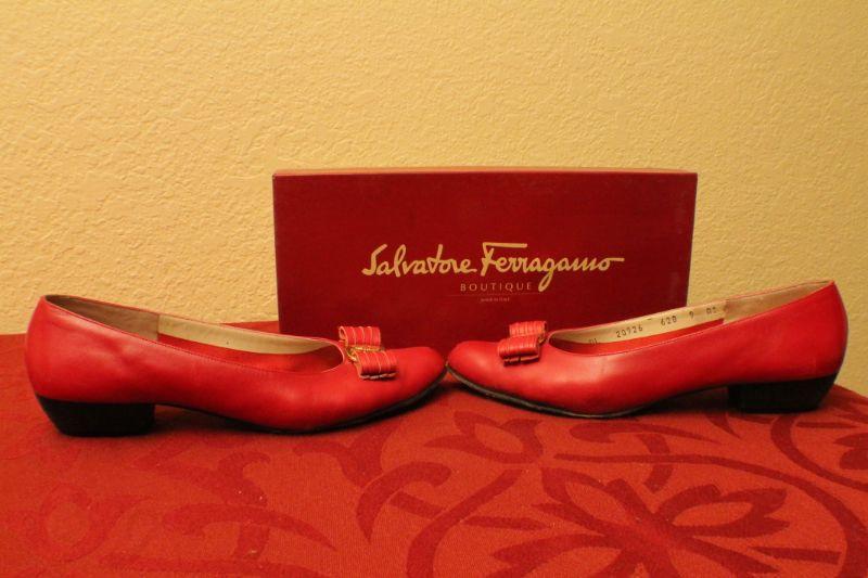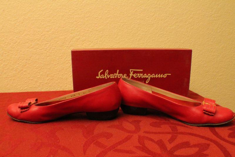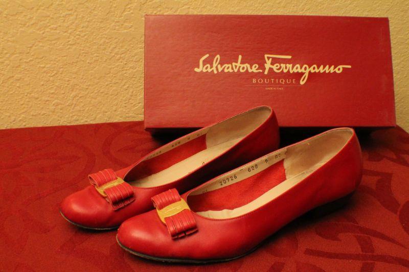 LOT #365: Salvatore Ferragamoâ„¢ Red Leather Flats w/ Gold Hardware Bow SIZE 9 AA