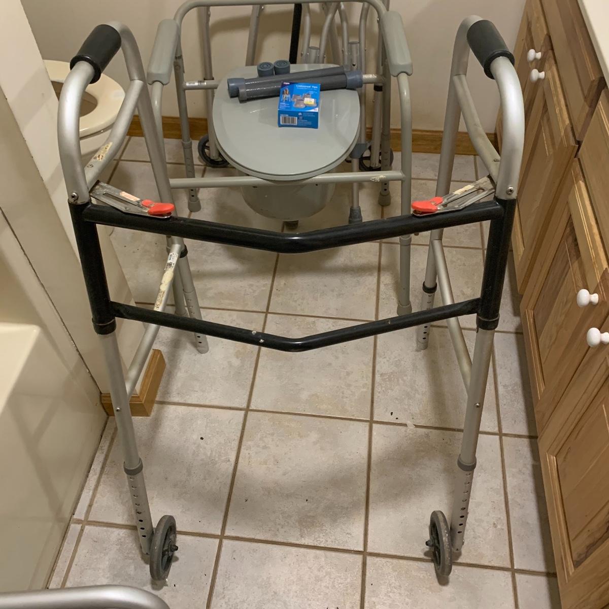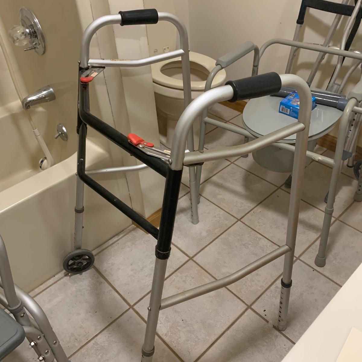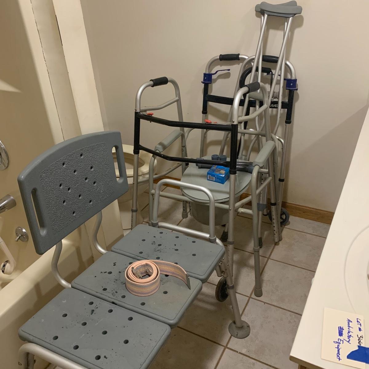 Do you or someone you know need help moving around? Here’s your answer. This lot includes a shower seat, potty seat, two walkers, a set of crutches, and a walking cane. All items are clean, and ready for service. Local pickup only.