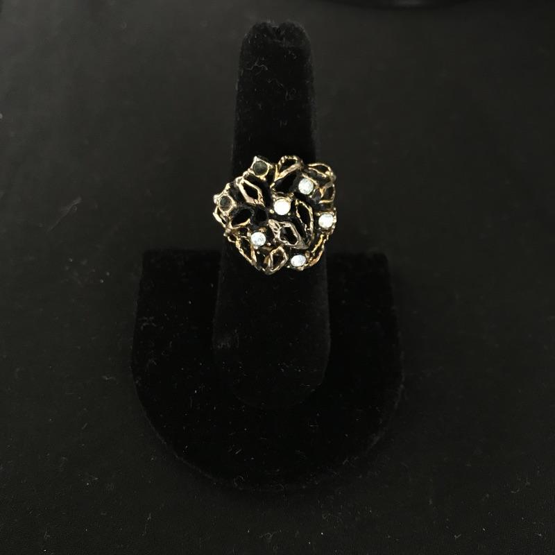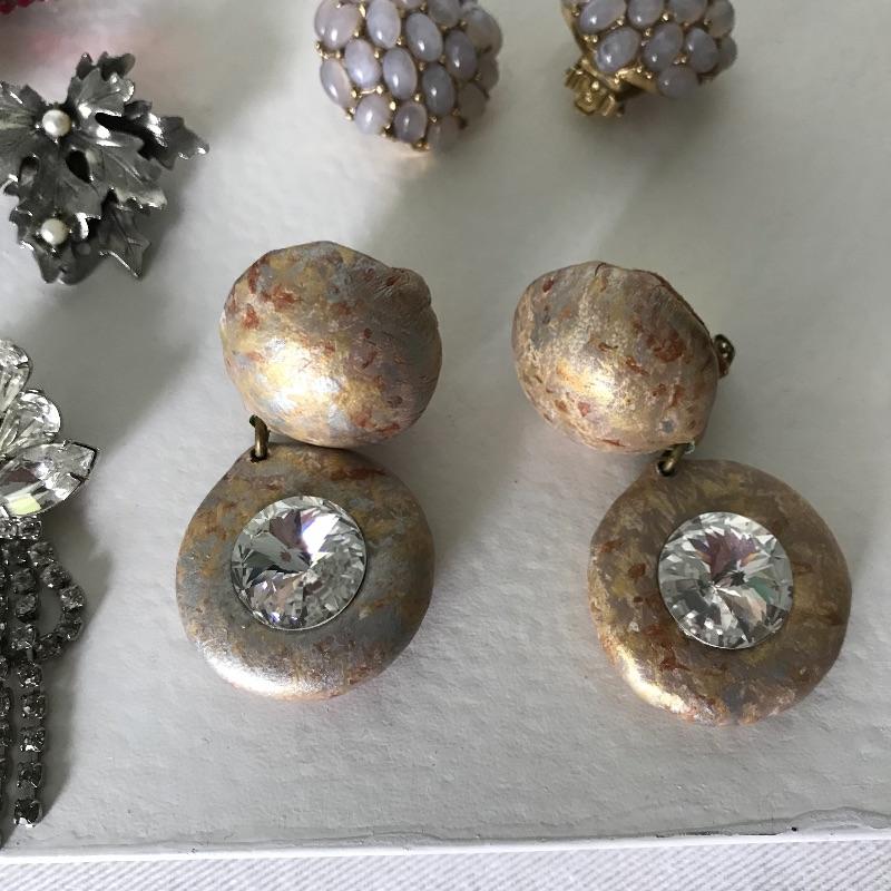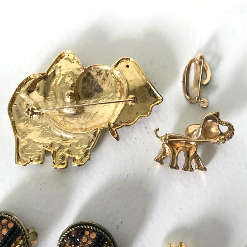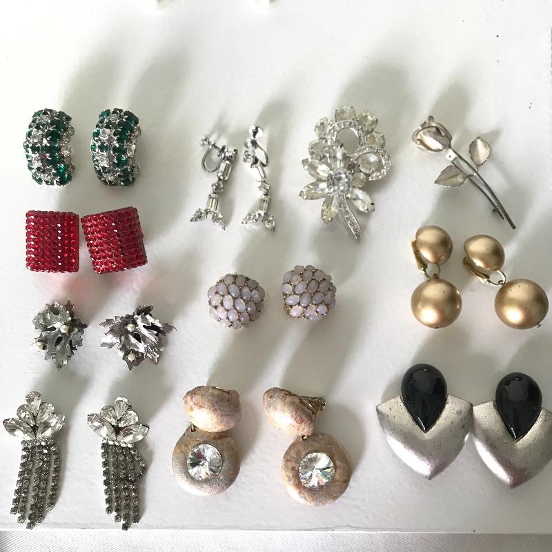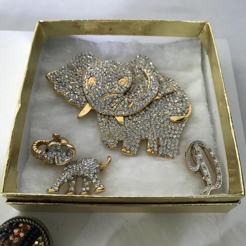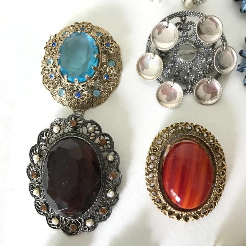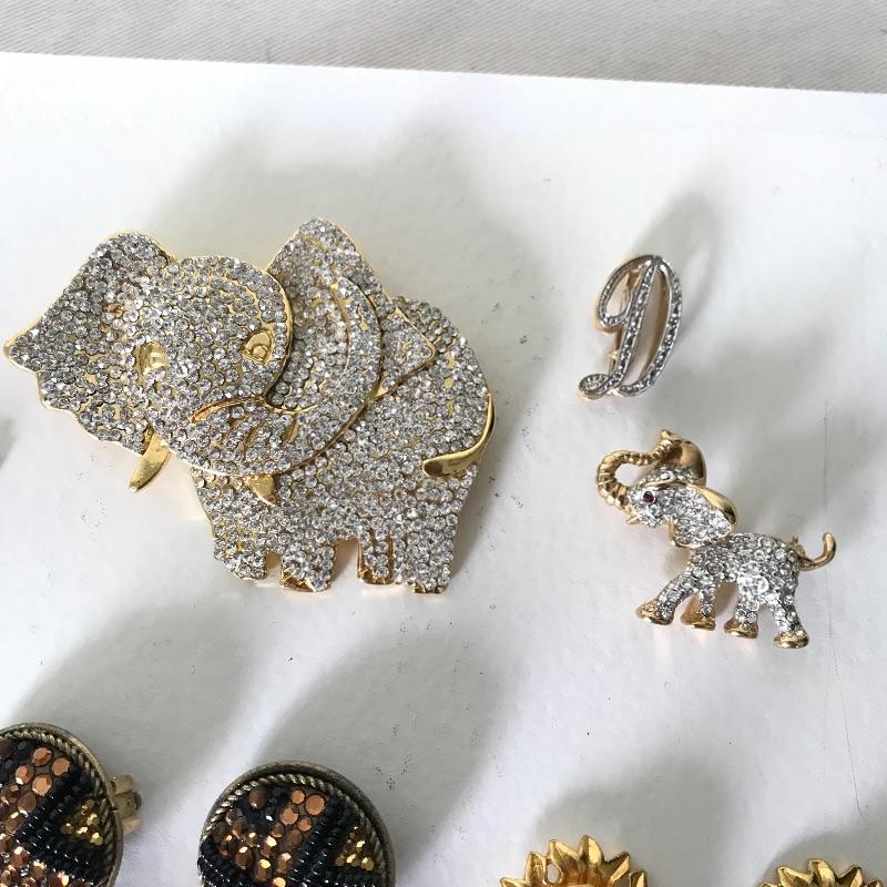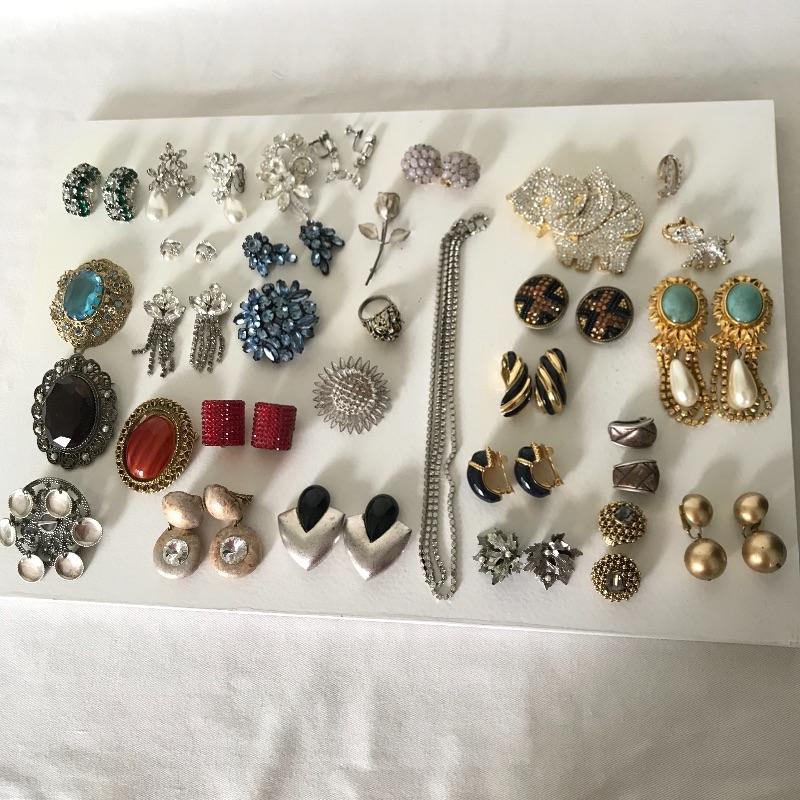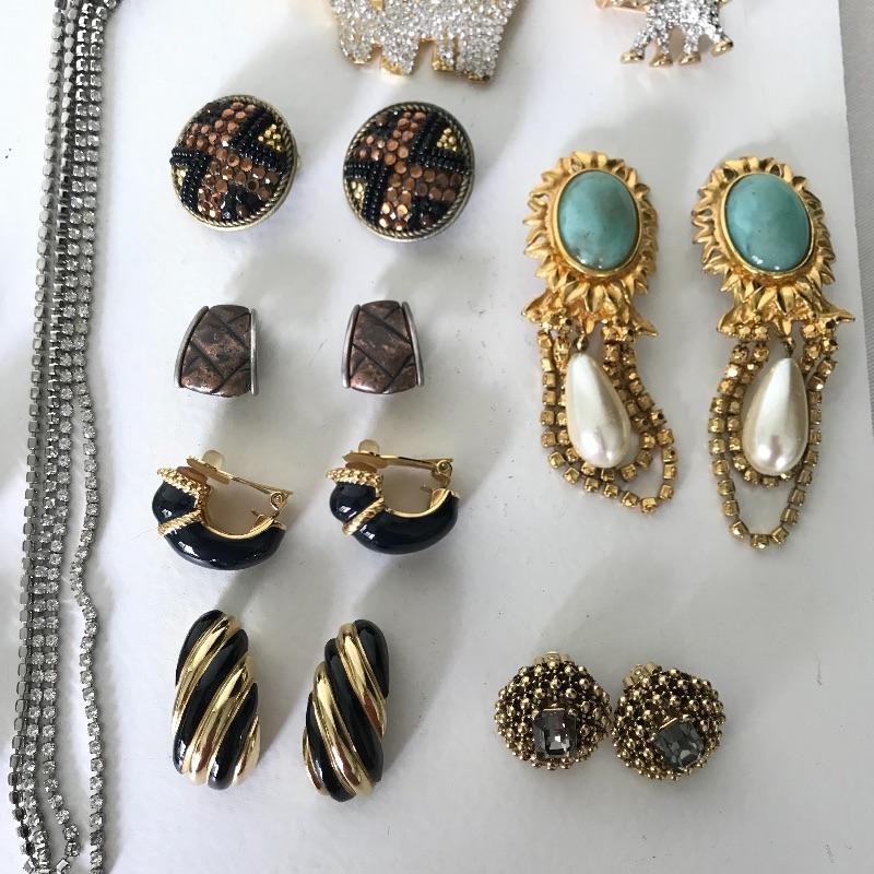 This is a fun collection of estate jewelry with some jaw-dropping pins to an assortment of dazzling gold and silver fashion jewelry. Some markings are noted in photos. With this lot you’ll find colors and themes for any occasion! See images.