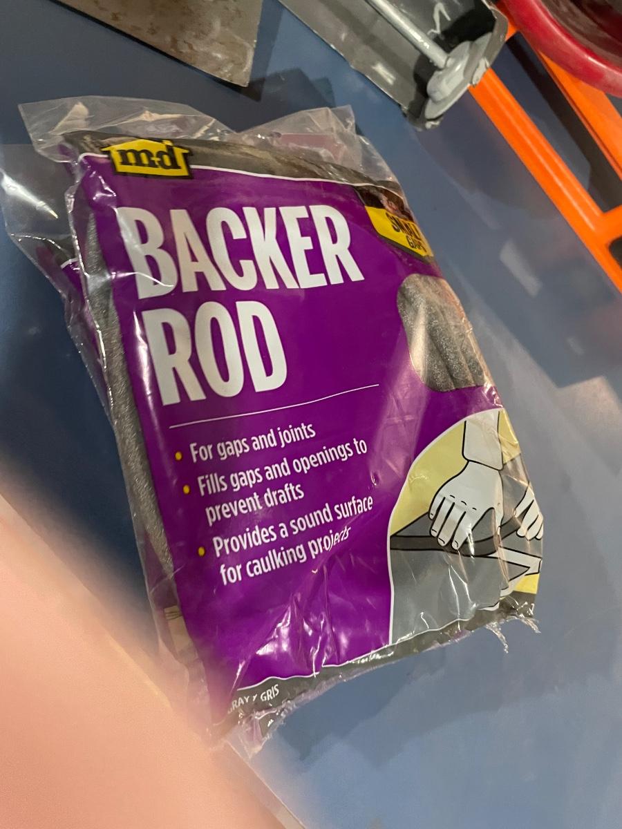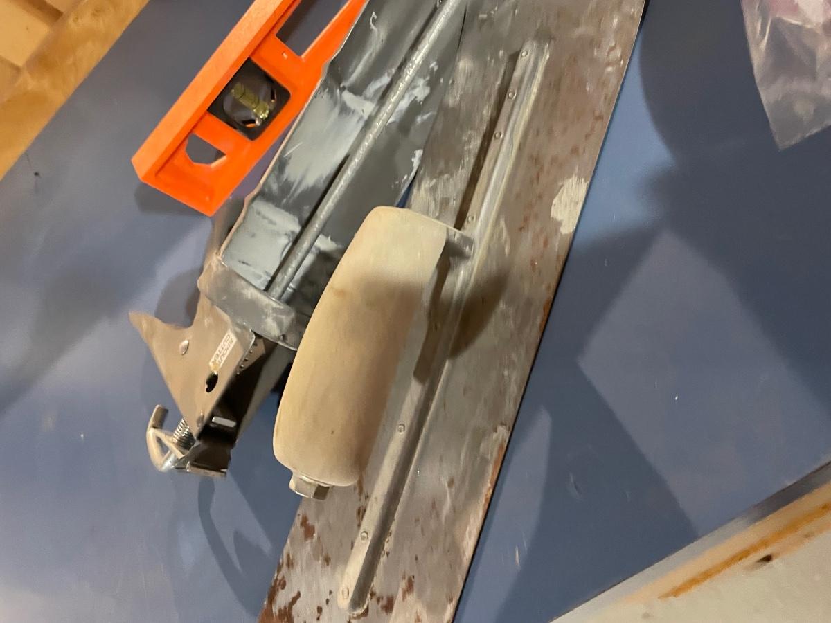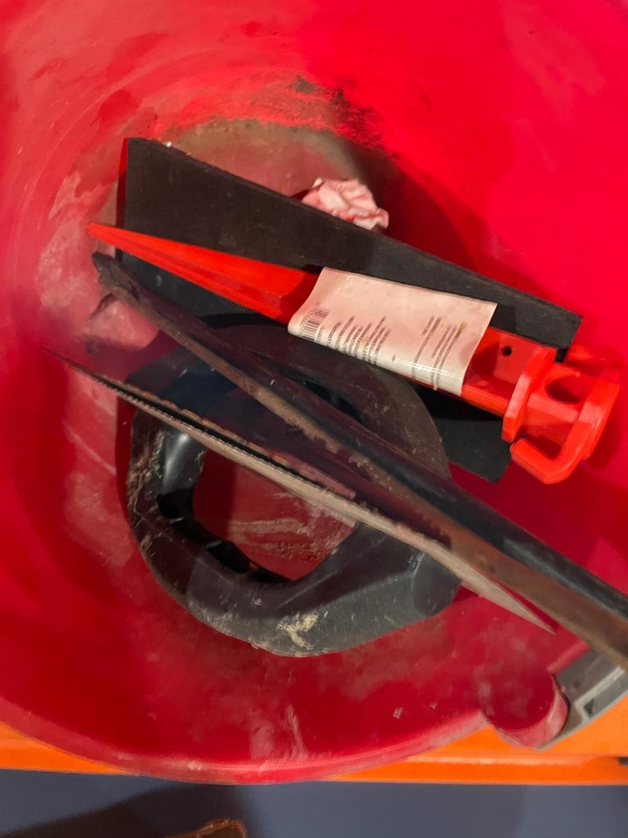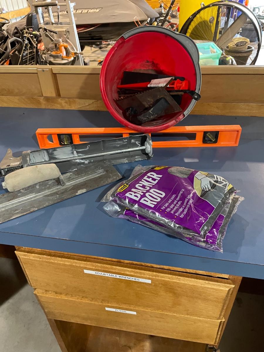 Lot 367 bucket of concrete tools, caulk gun, level, 2 backer rods