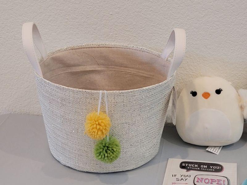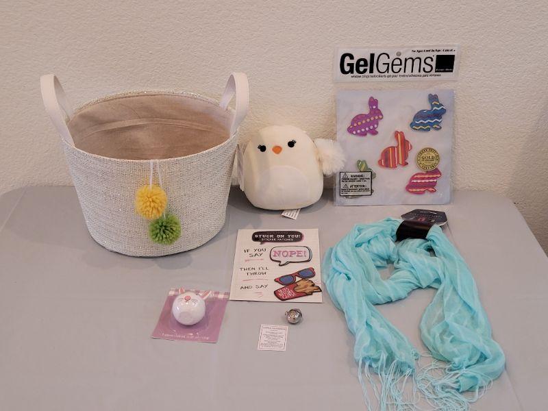 Lot 367: New Hallmark Easter Bucket with Stick On Patches, Scarf, Lip Balm, Squishmallow and Little Blessings Charm