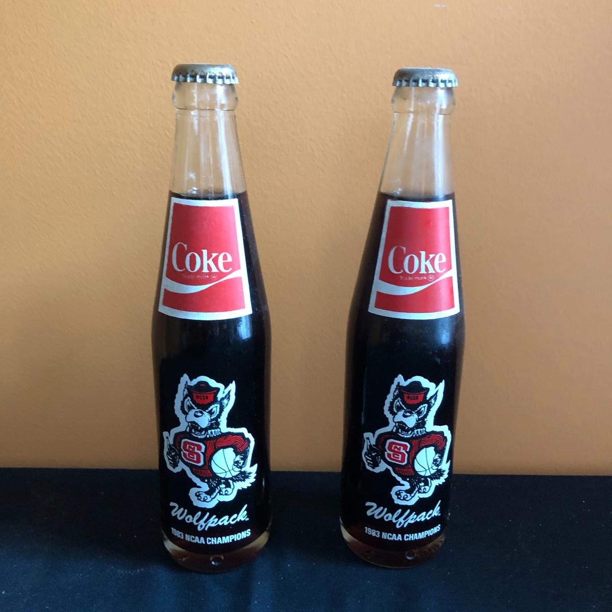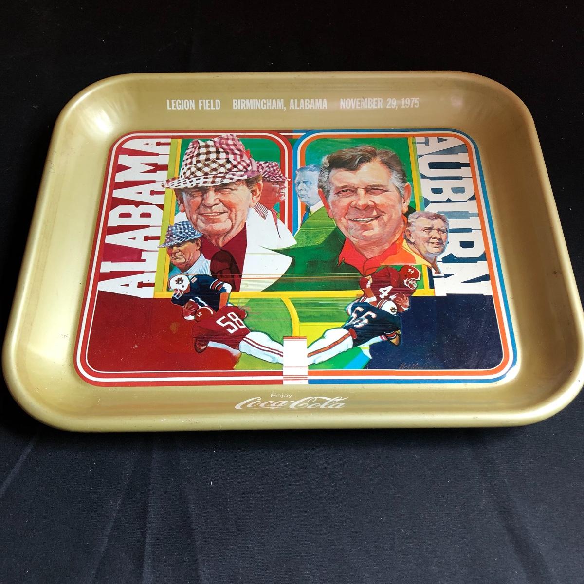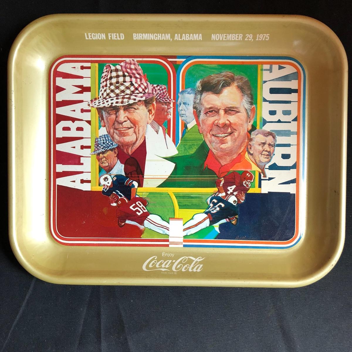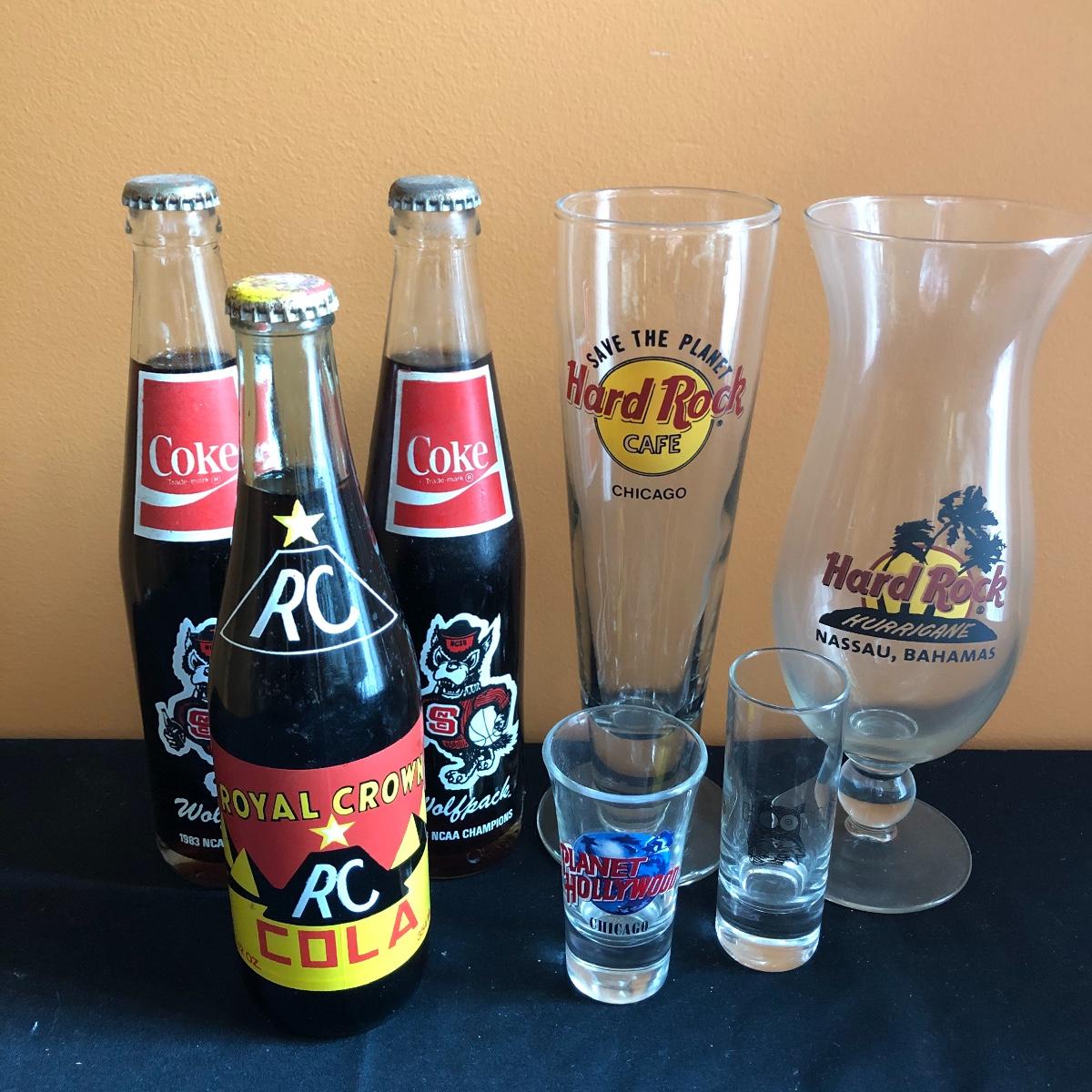 This lot of collectibles includes two Hard Rock Cafe cocktail glasses, two Wolfpack 1983 NCAA championship unopened Coke bottles, an unopened RC Cola bottle, a Myrtle Beach shot glass, a Hooters shot glass, a Planet Hollywood shot glass, two empty coke bottles, a six back of Coca-Cola, one of which has been open and is empty, two empty lidded RC bottles, two RW pint glasses, three RW mini pint glasses, and an Alabama vs Auburn Coca-Cola tray. The metal tray commemorating the Alabama and Auburn November 29, 1975 game in Birmingham, Alabama, has information about each coach on the back of the tray. If you love sports, Coca-Cola memorabilia, or collectible bar glasses, this lot has just what you need!
