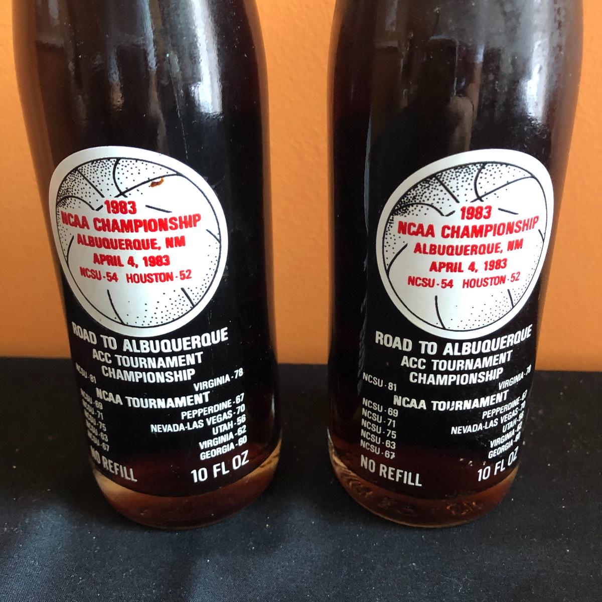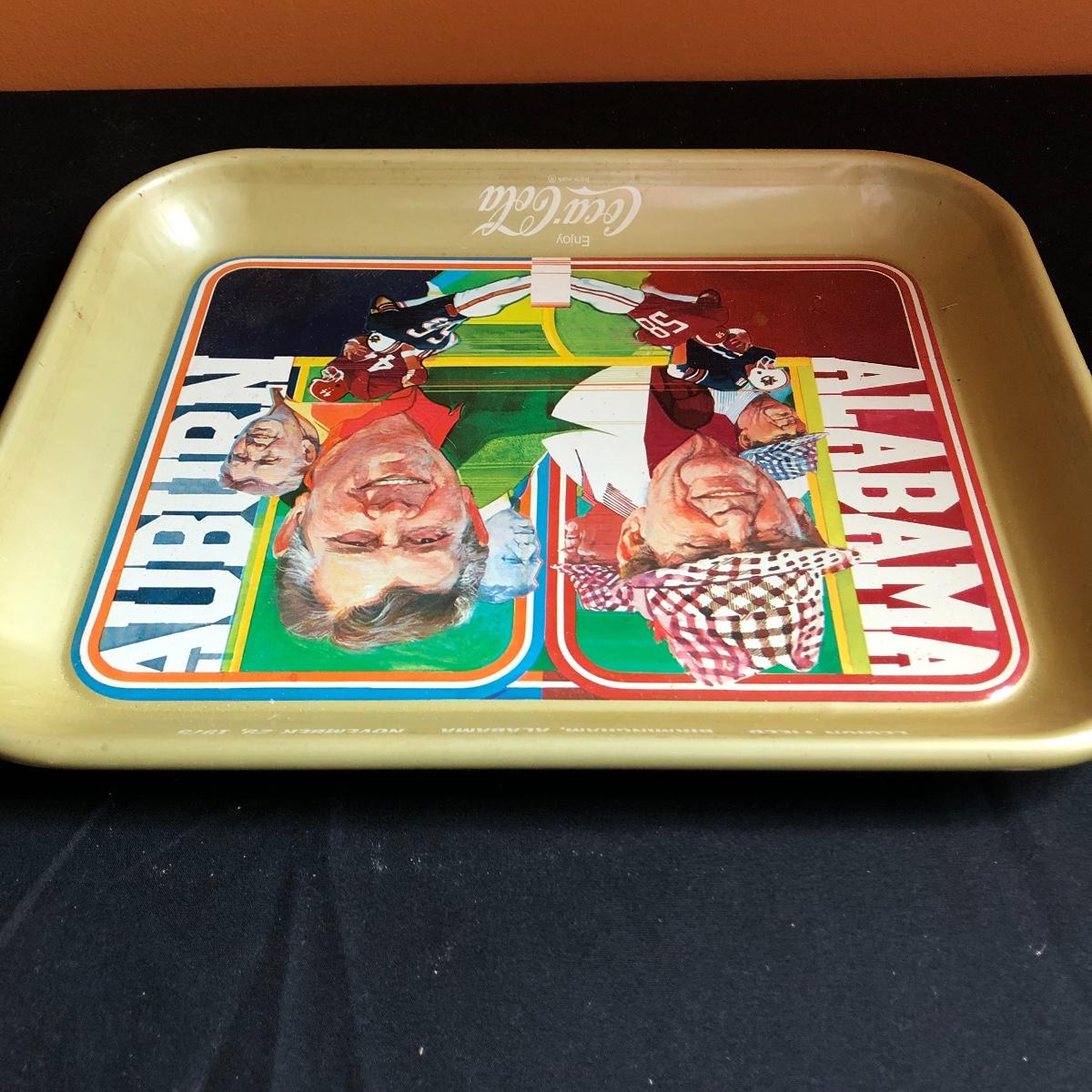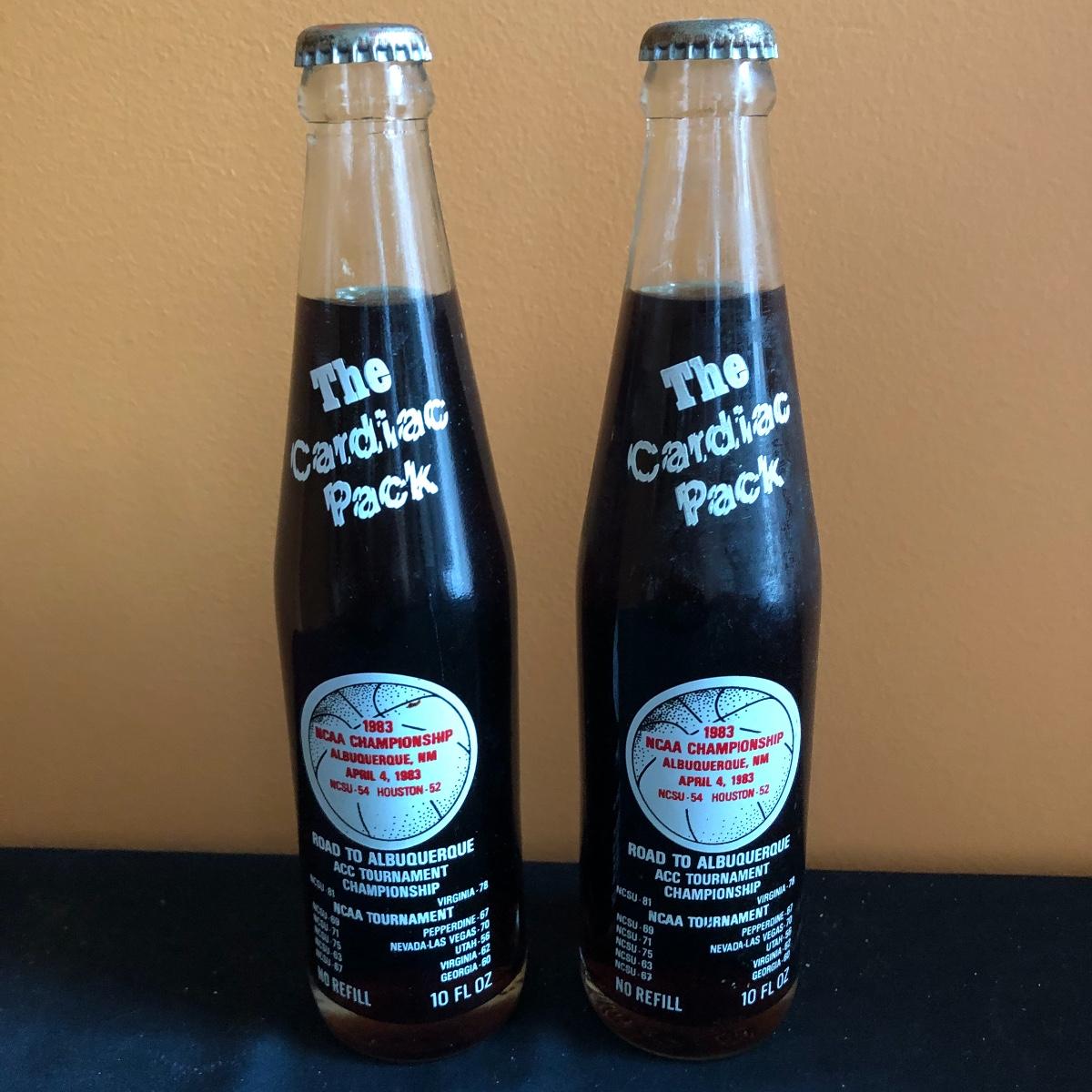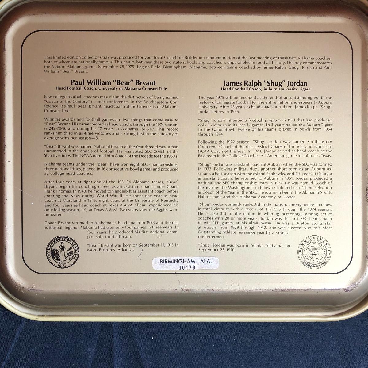 This lot of collectibles includes two Hard Rock Cafe cocktail glasses, two Wolfpack 1983 NCAA championship unopened Coke bottles, an unopened RC Cola bottle, a Myrtle Beach shot glass, a Hooters shot glass, a Planet Hollywood shot glass, two empty coke bottles, a six back of Coca-Cola, one of which has been open and is empty, two empty lidded RC bottles, two RW pint glasses, three RW mini pint glasses, and an Alabama vs Auburn Coca-Cola tray. The metal tray commemorating the Alabama and Auburn November 29, 1975 game in Birmingham, Alabama, has information about each coach on the back of the tray. If you love sports, Coca-Cola memorabilia, or collectible bar glasses, this lot has just what you need!