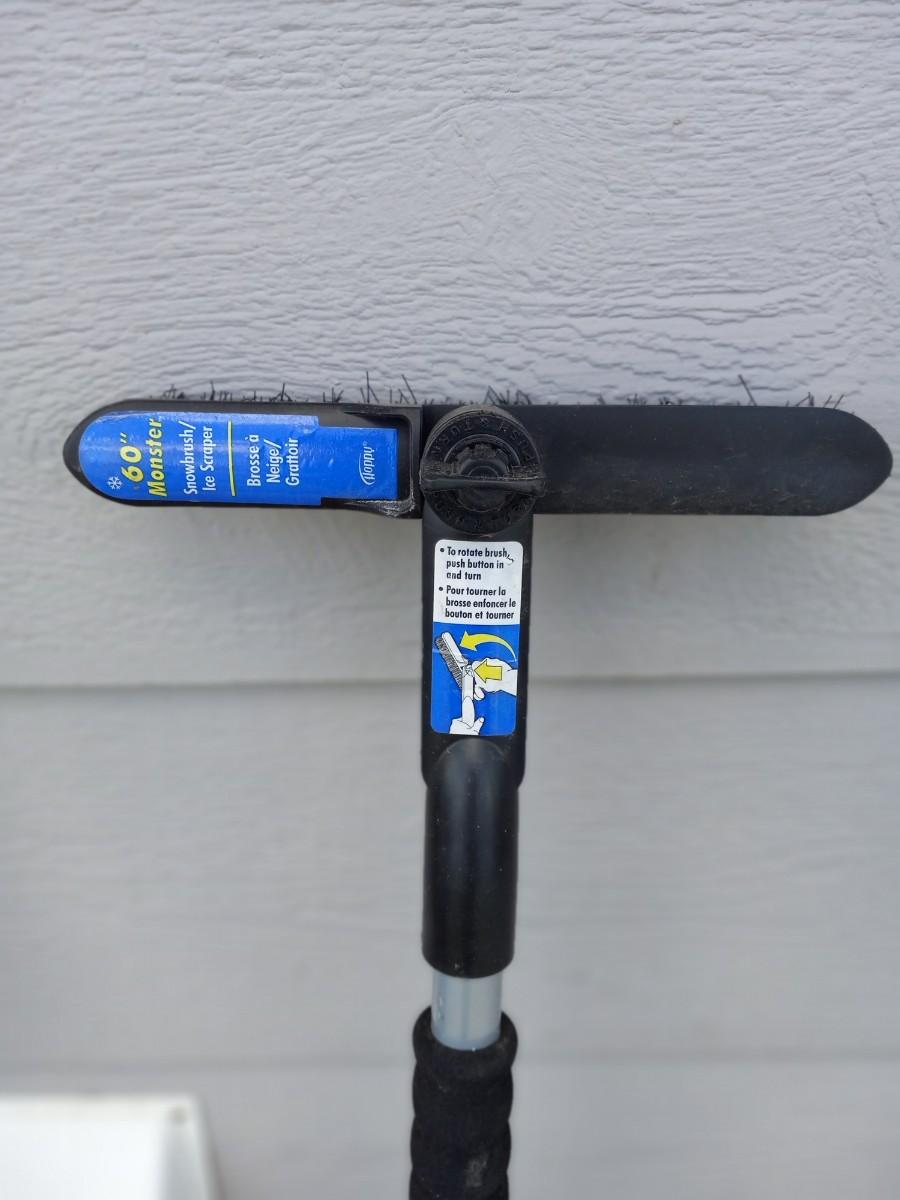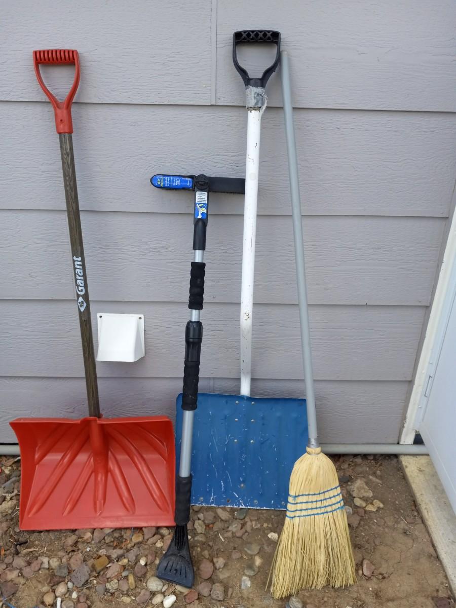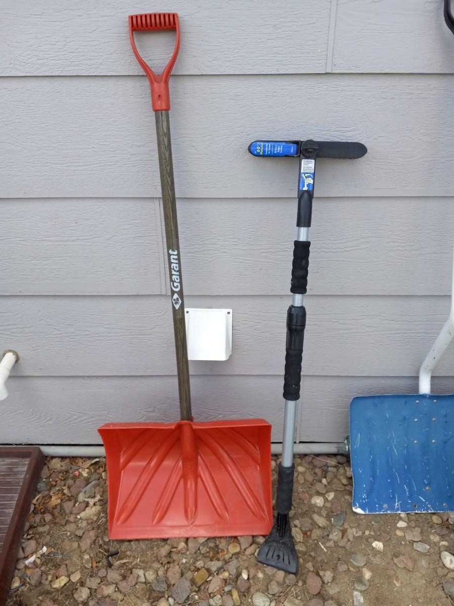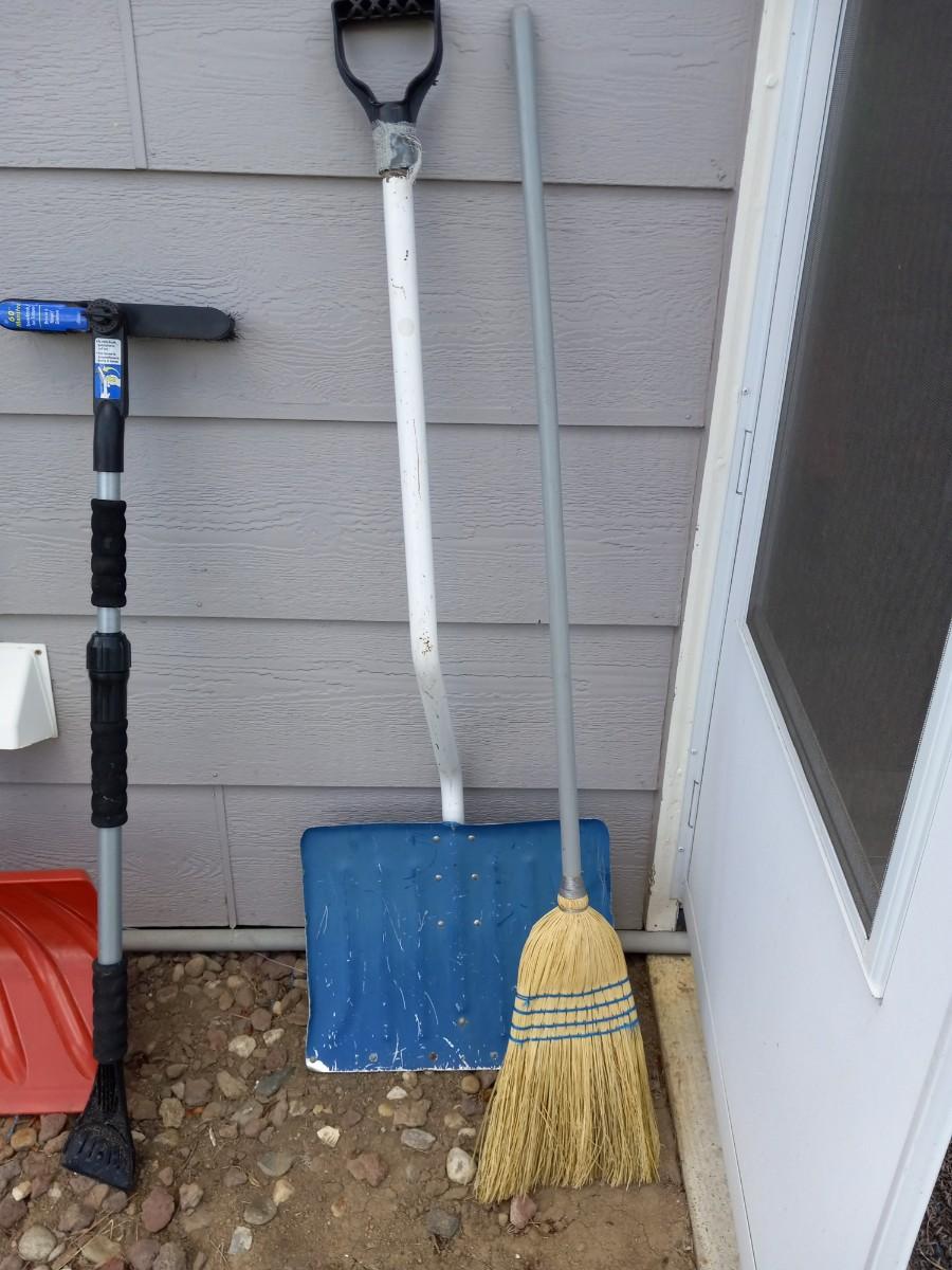TWO SNOW SHOVELS, AUTO SNOW BRUSH AND BROOM