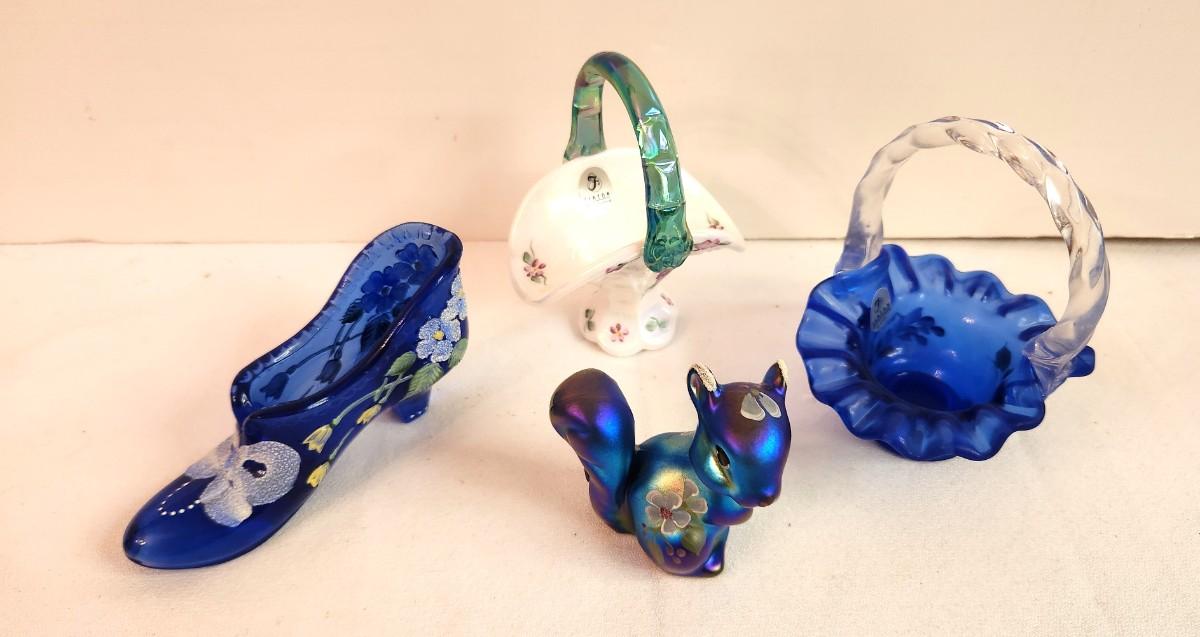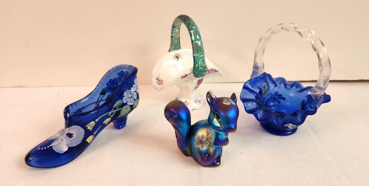 You get all you see here - Fenton Art Glass lot: 2 small baskets, 1 shoe, Figural Squirrel. All have labels and are in good condition.