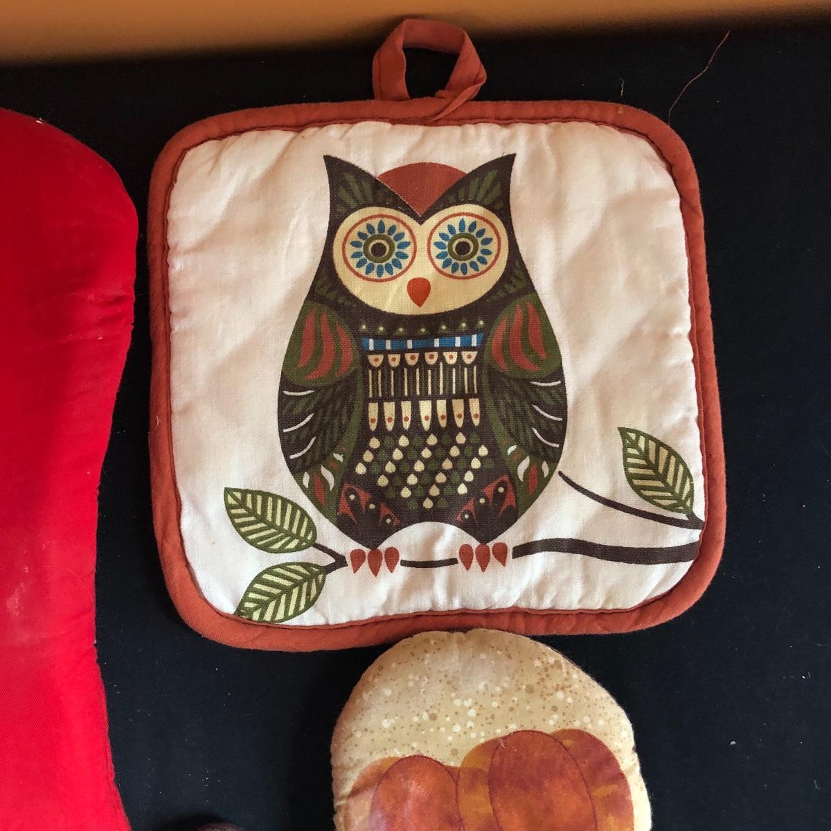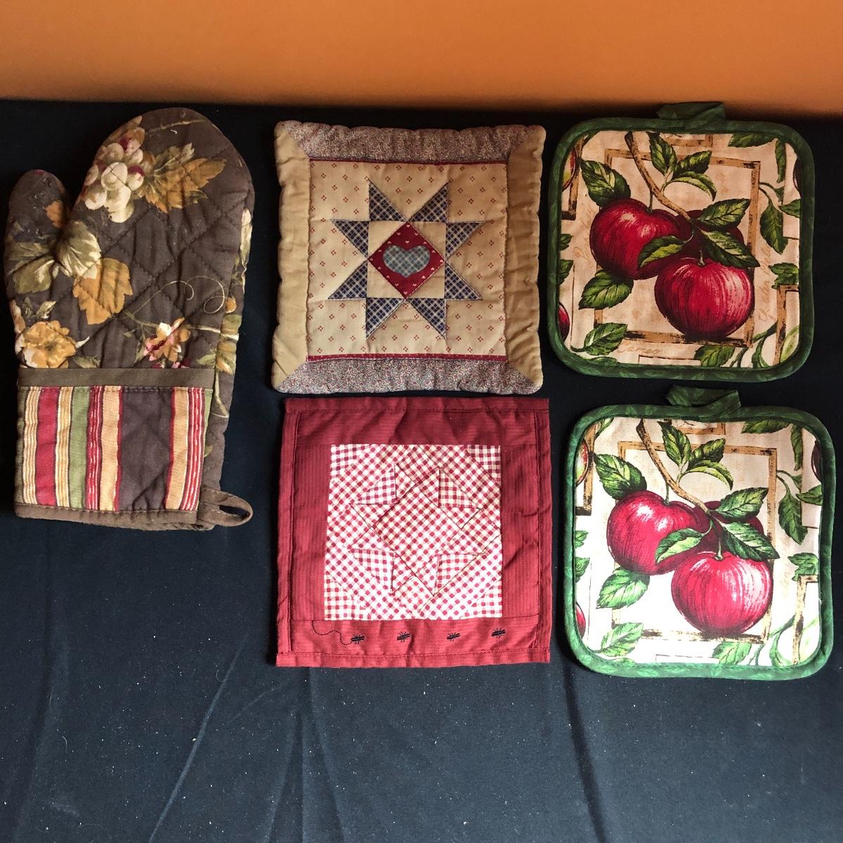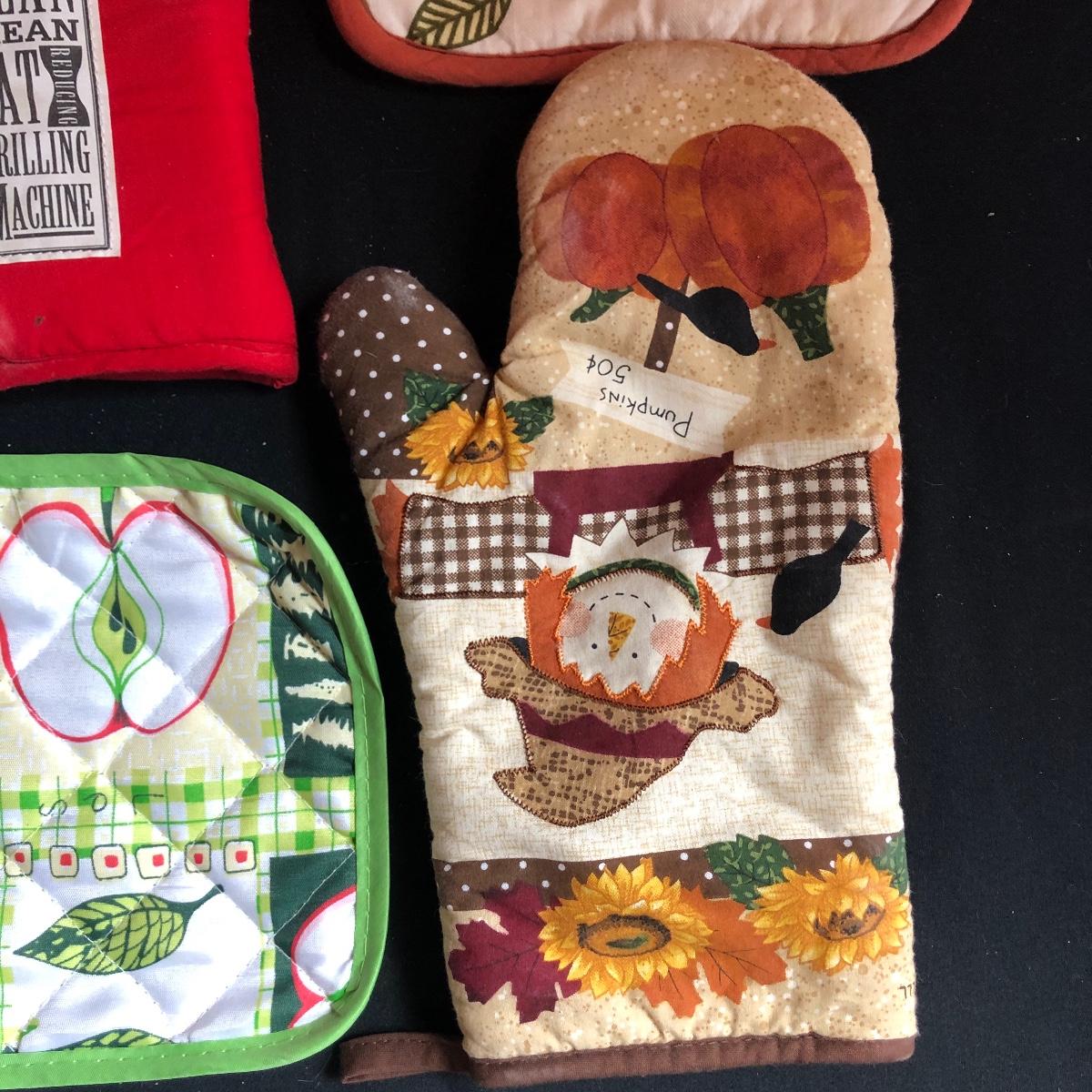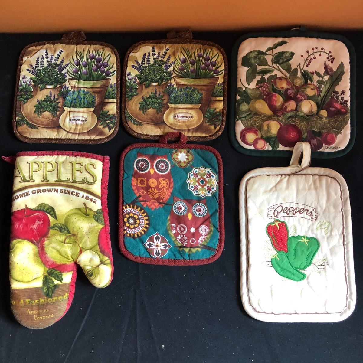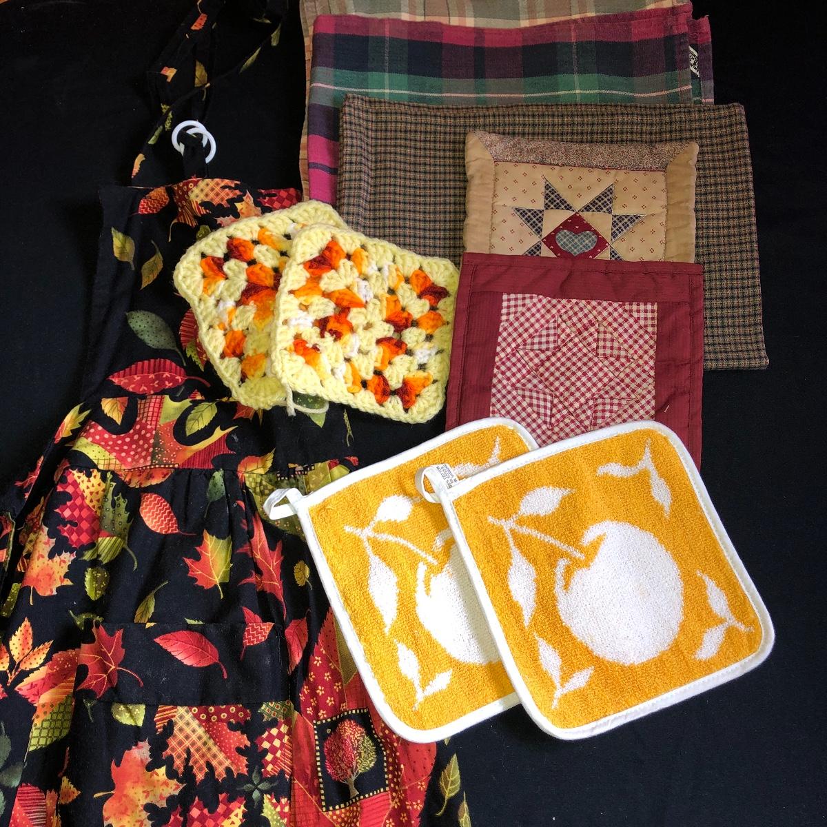 This large assortment of aprons, tea towels, oven mitts and more has just what you need to stock up on kitchen linens and share with friends! Pairs of oven mitts, single oven mitts, themed pot holders, handmade pot holders, matching pot holders, assorted aprons, tea towels, a set of four placemats, a handmade bonnet, hand towels make up this sizeable lot. Common themes amongst these items include fall, owls, herbs, and farming.