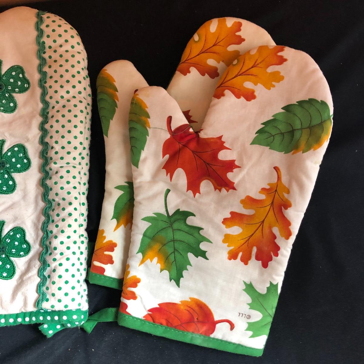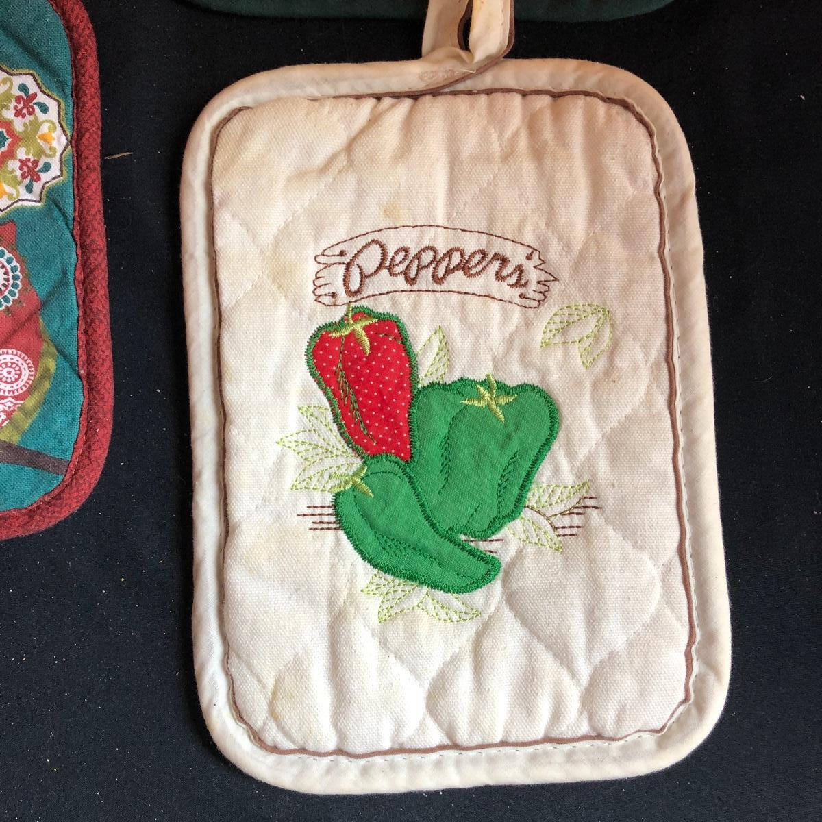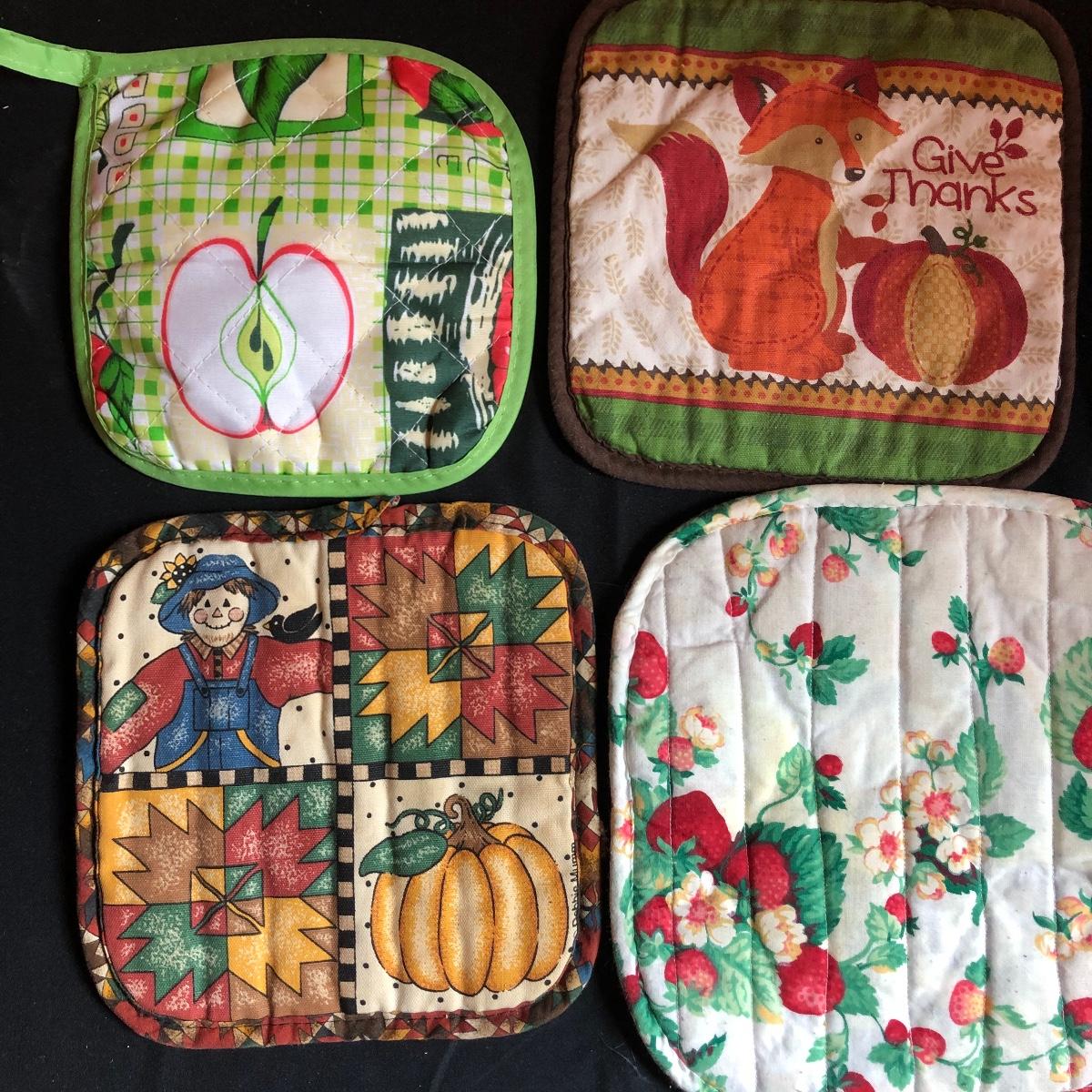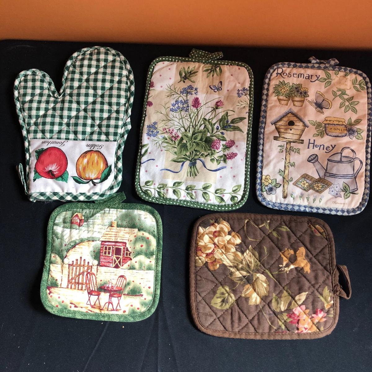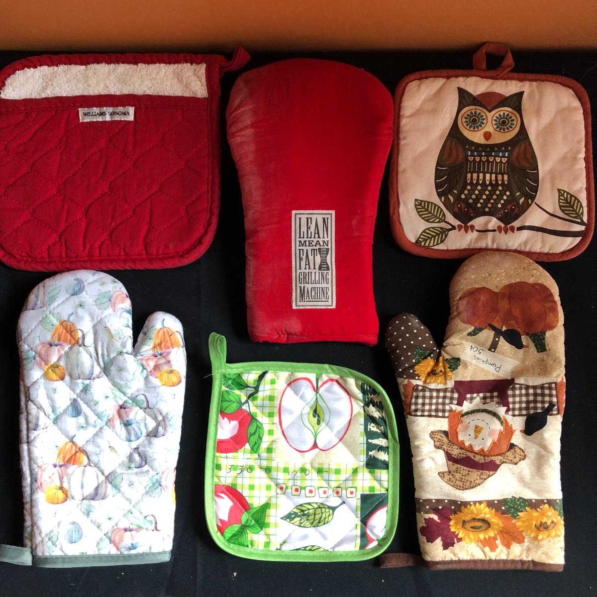 This large assortment of aprons, tea towels, oven mitts and more has just what you need to stock up on kitchen linens and share with friends! Pairs of oven mitts, single oven mitts, themed pot holders, handmade pot holders, matching pot holders, assorted aprons, tea towels, a set of four placemats, a handmade bonnet, hand towels make up this sizeable lot. Common themes amongst these items include fall, owls, herbs, and farming.