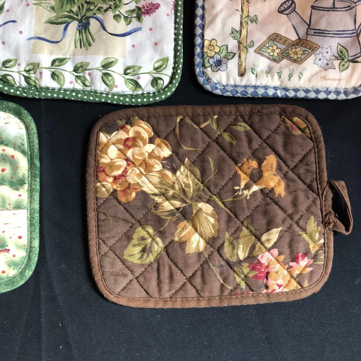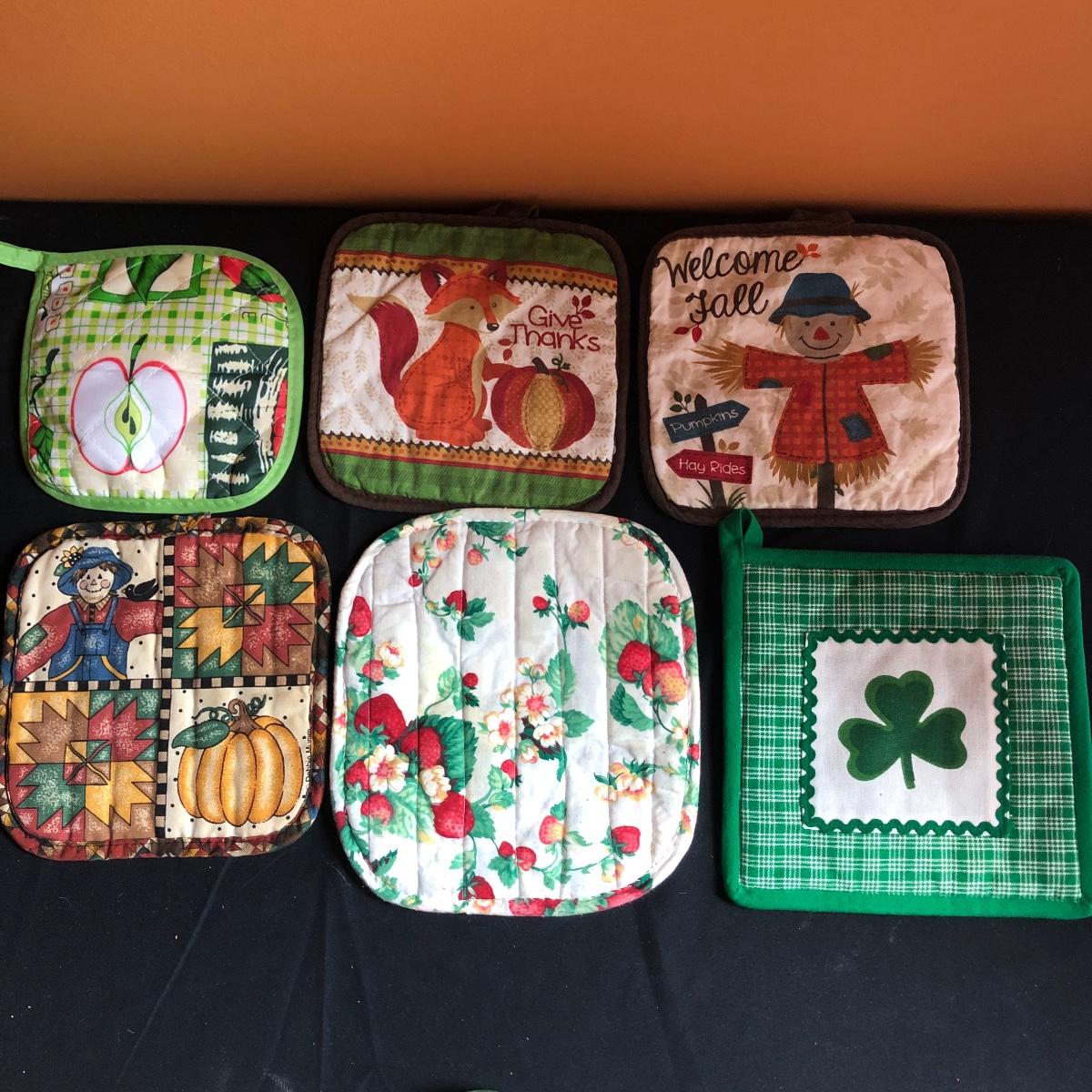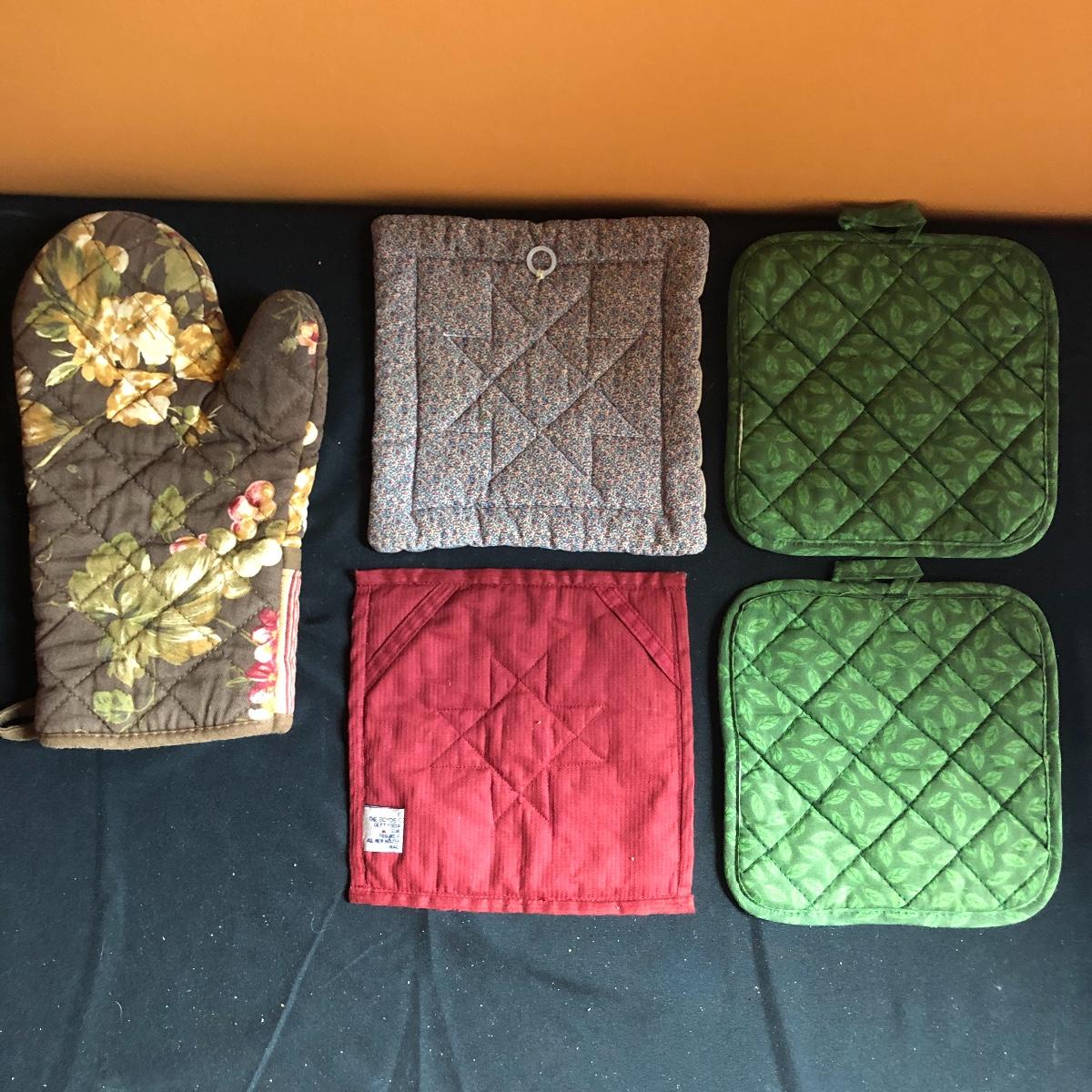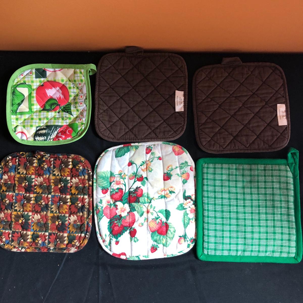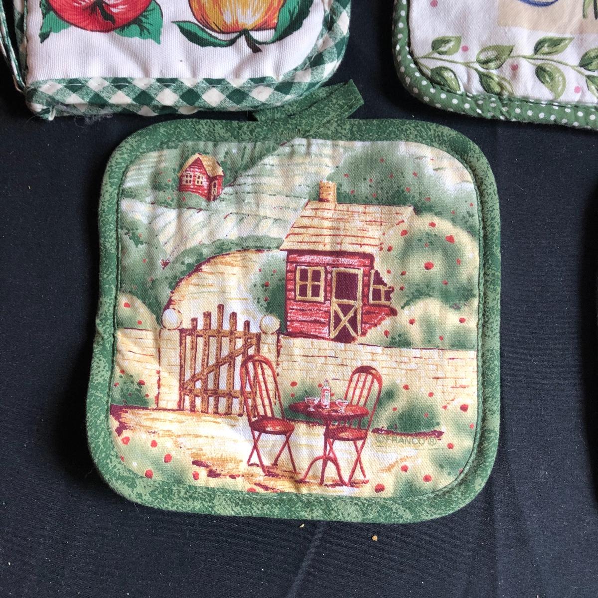 This large assortment of aprons, tea towels, oven mitts and more has just what you need to stock up on kitchen linens and share with friends! Pairs of oven mitts, single oven mitts, themed pot holders, handmade pot holders, matching pot holders, assorted aprons, tea towels, a set of four placemats, a handmade bonnet, hand towels make up this sizeable lot. Common themes amongst these items include fall, owls, herbs, and farming.