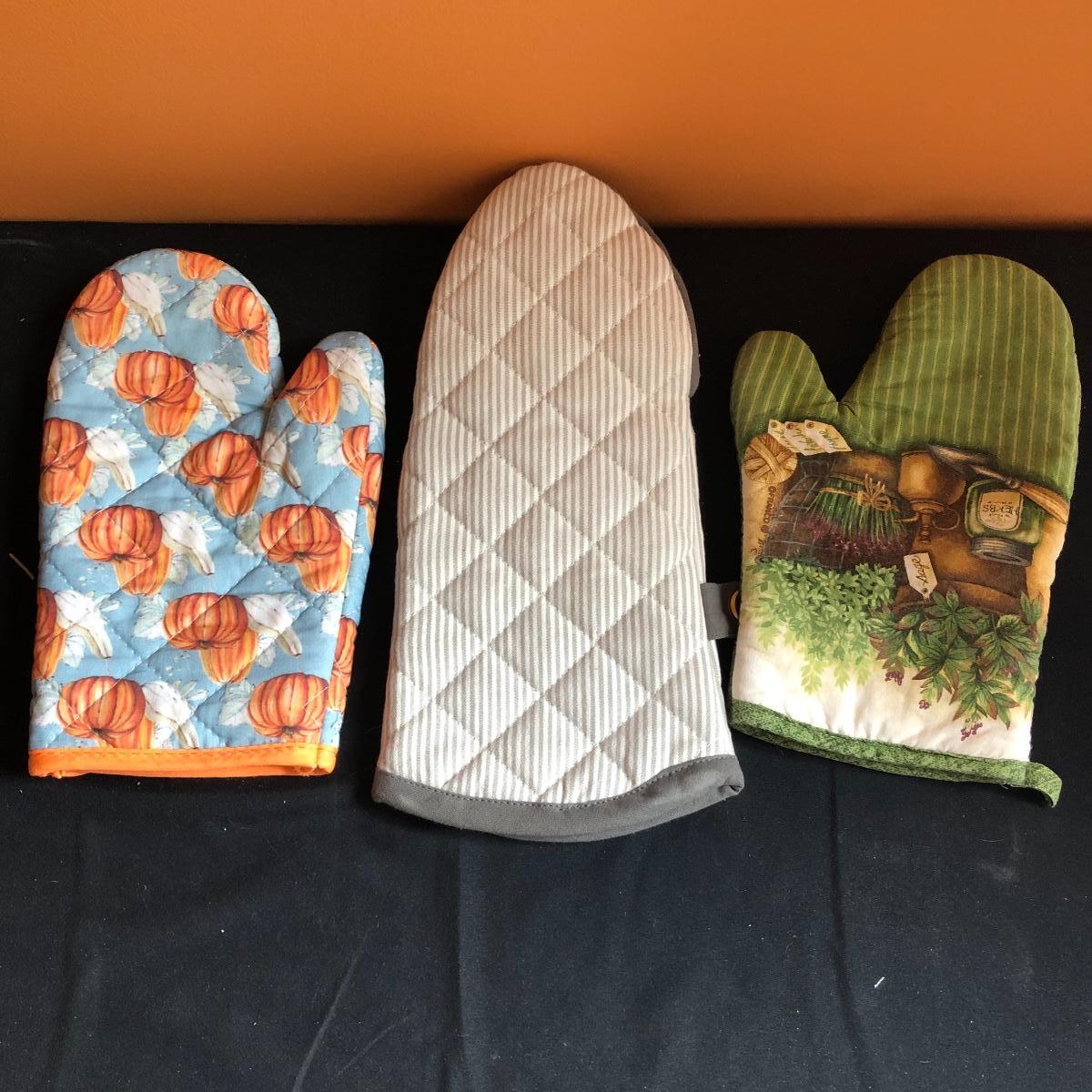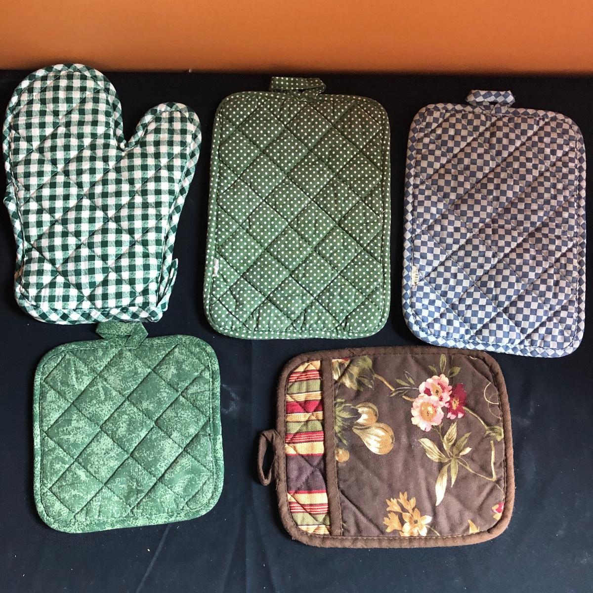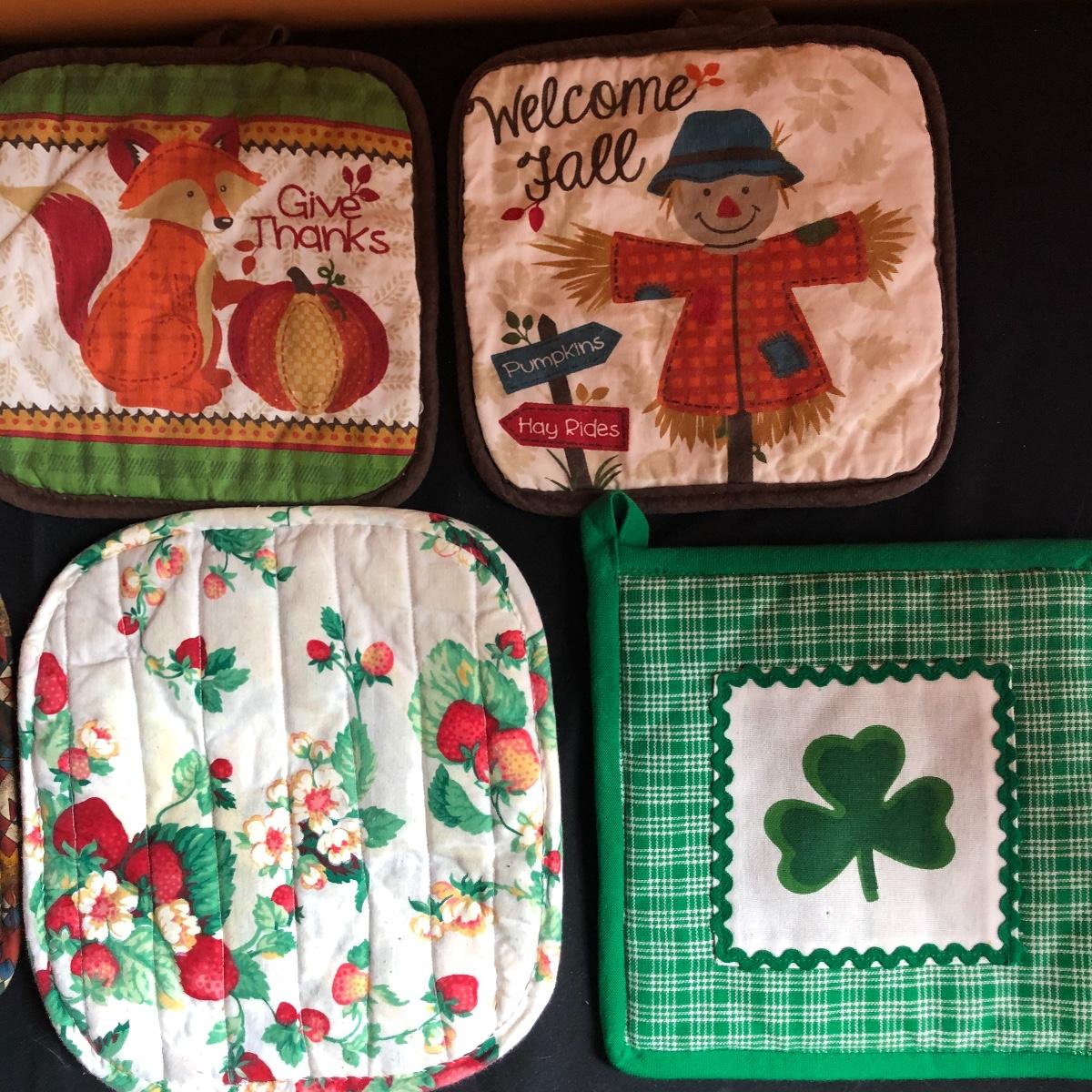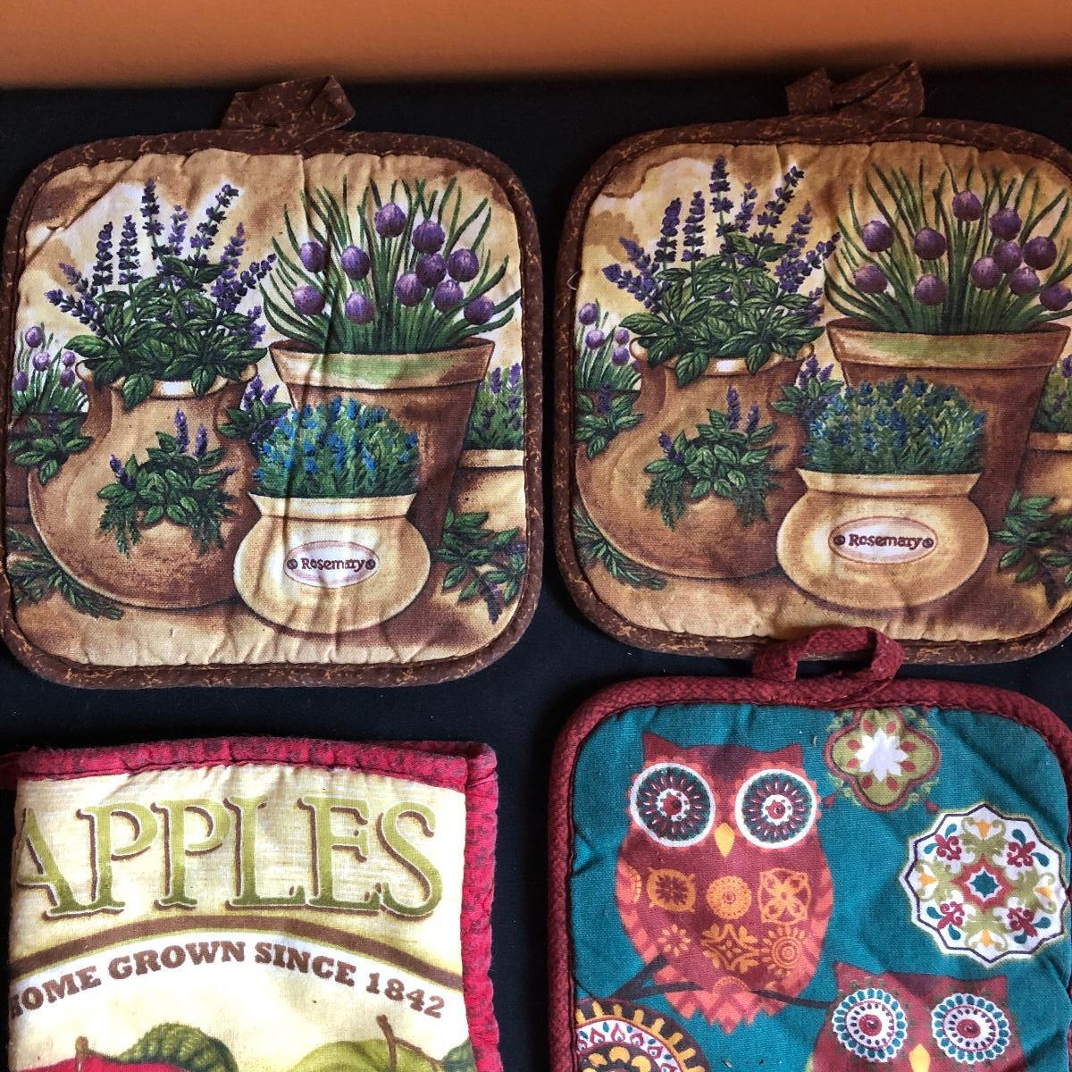 This large assortment of aprons, tea towels, oven mitts and more has just what you need to stock up on kitchen linens and share with friends! Pairs of oven mitts, single oven mitts, themed pot holders, handmade pot holders, matching pot holders, assorted aprons, tea towels, a set of four placemats, a handmade bonnet, hand towels make up this sizeable lot. Common themes amongst these items include fall, owls, herbs, and farming.