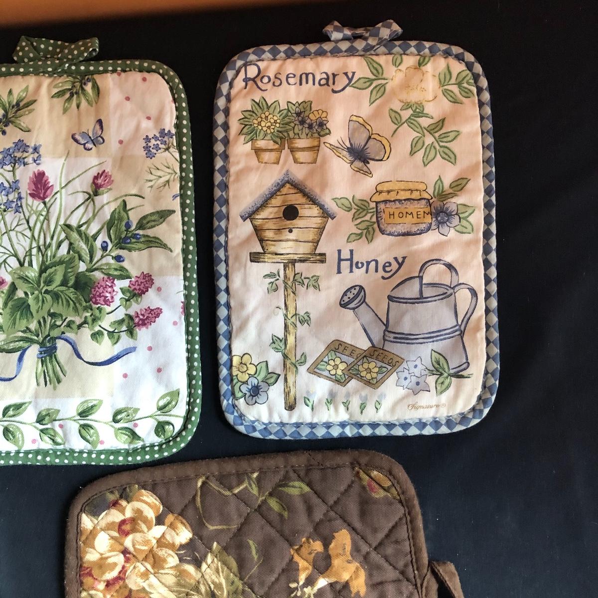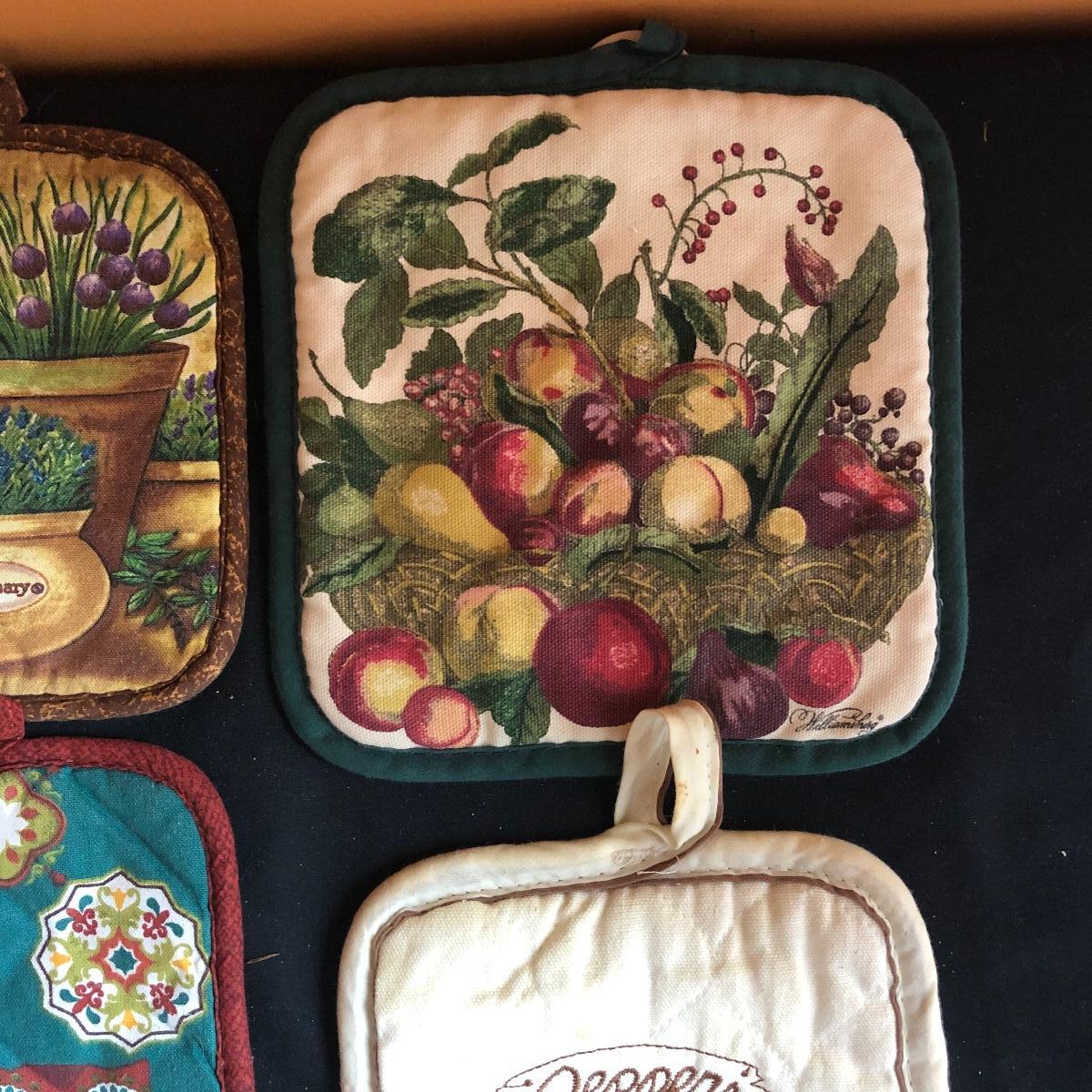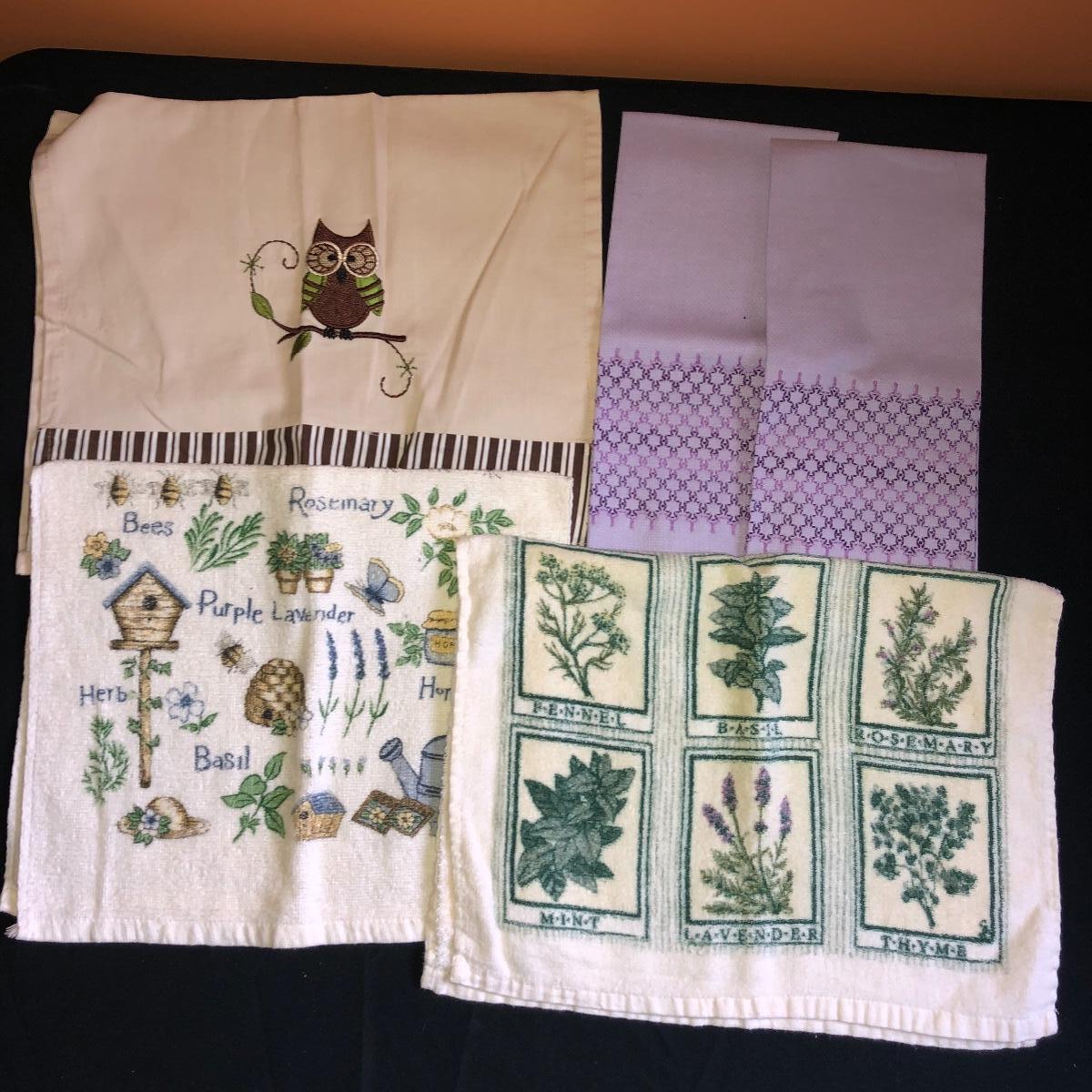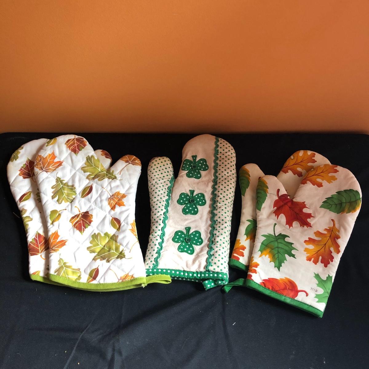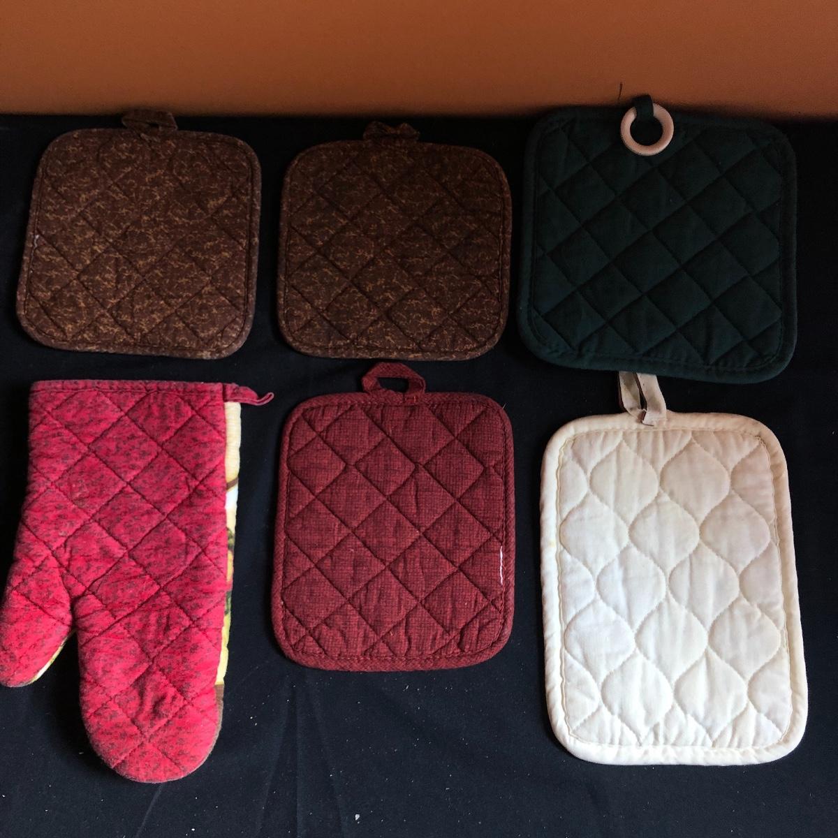 This large assortment of aprons, tea towels, oven mitts and more has just what you need to stock up on kitchen linens and share with friends! Pairs of oven mitts, single oven mitts, themed pot holders, handmade pot holders, matching pot holders, assorted aprons, tea towels, a set of four placemats, a handmade bonnet, hand towels make up this sizeable lot. Common themes amongst these items include fall, owls, herbs, and farming.