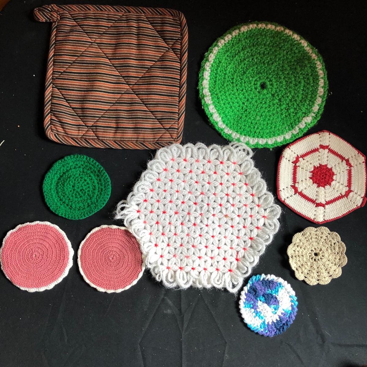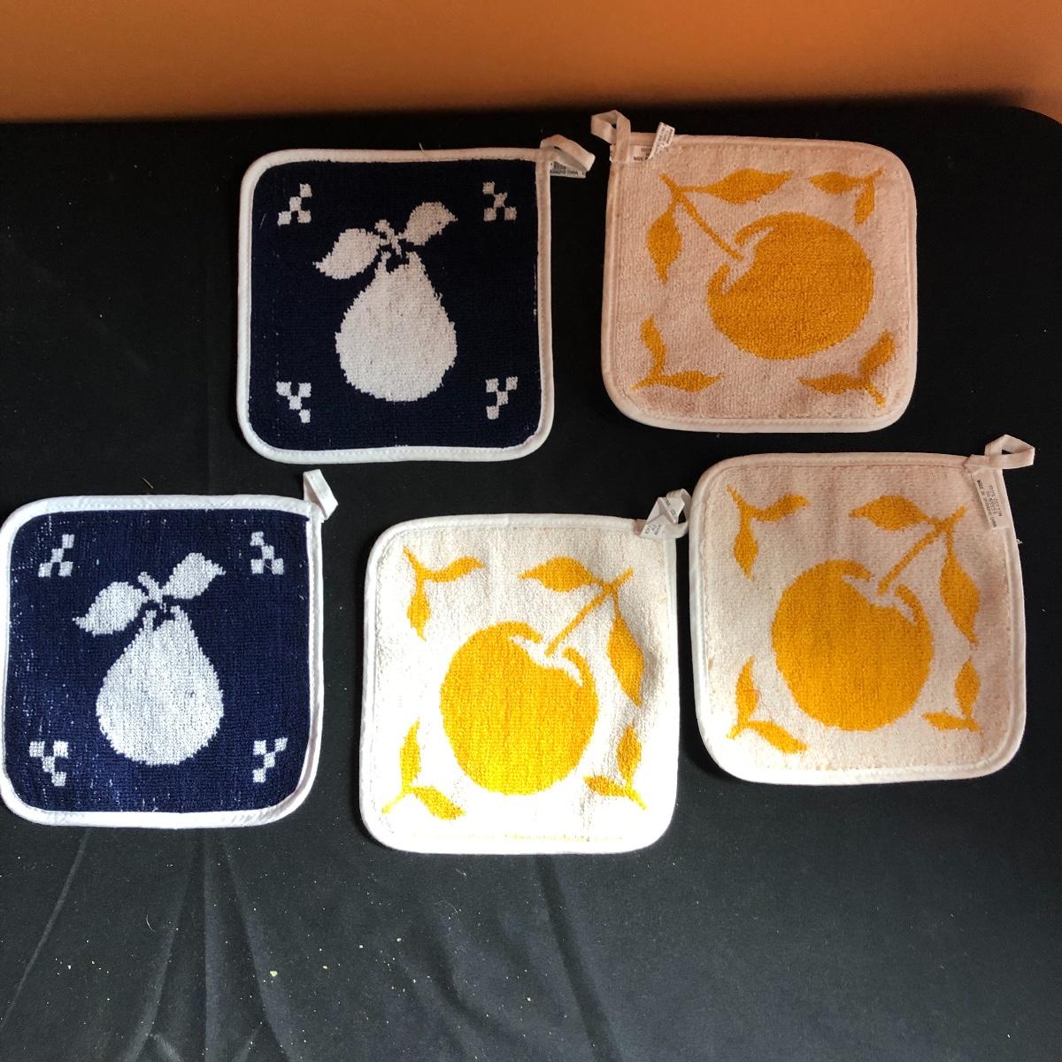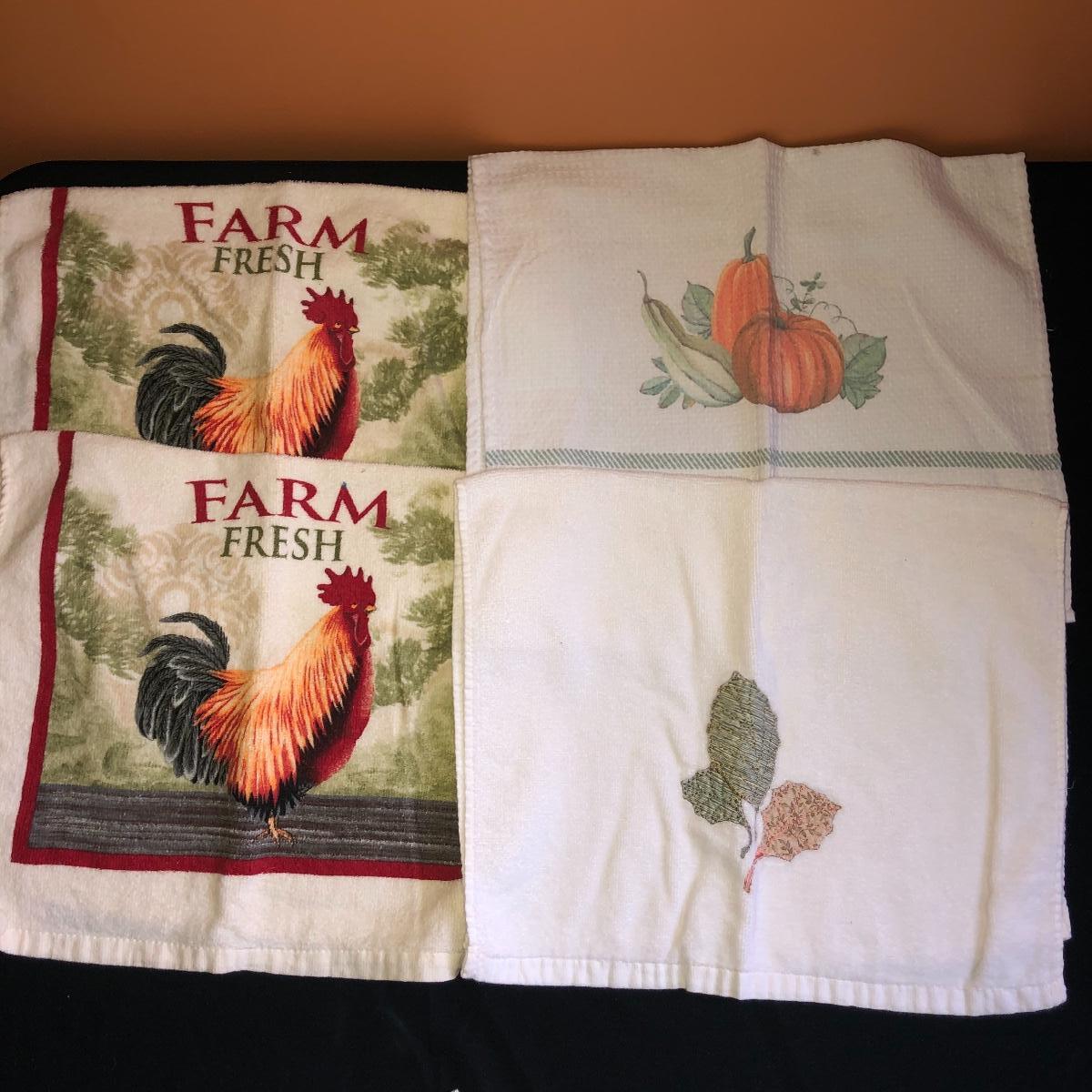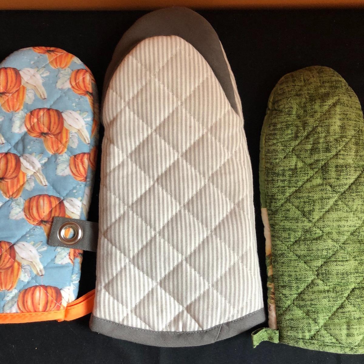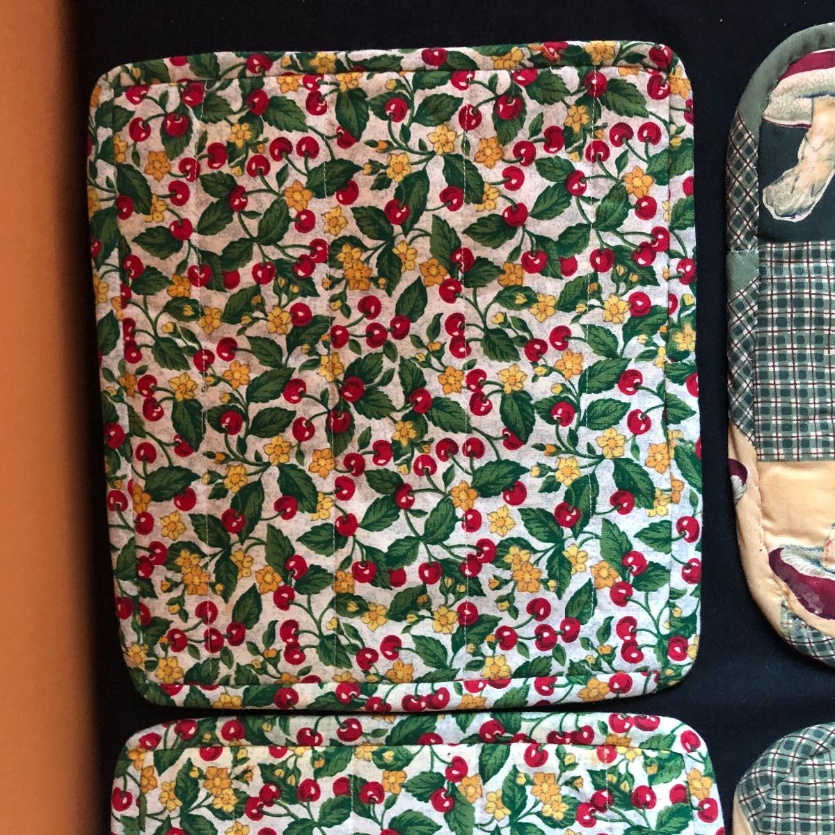 This large assortment of aprons, tea towels, oven mitts and more has just what you need to stock up on kitchen linens and share with friends! Pairs of oven mitts, single oven mitts, themed pot holders, handmade pot holders, matching pot holders, assorted aprons, tea towels, a set of four placemats, a handmade bonnet, hand towels make up this sizeable lot. Common themes amongst these items include fall, owls, herbs, and farming.