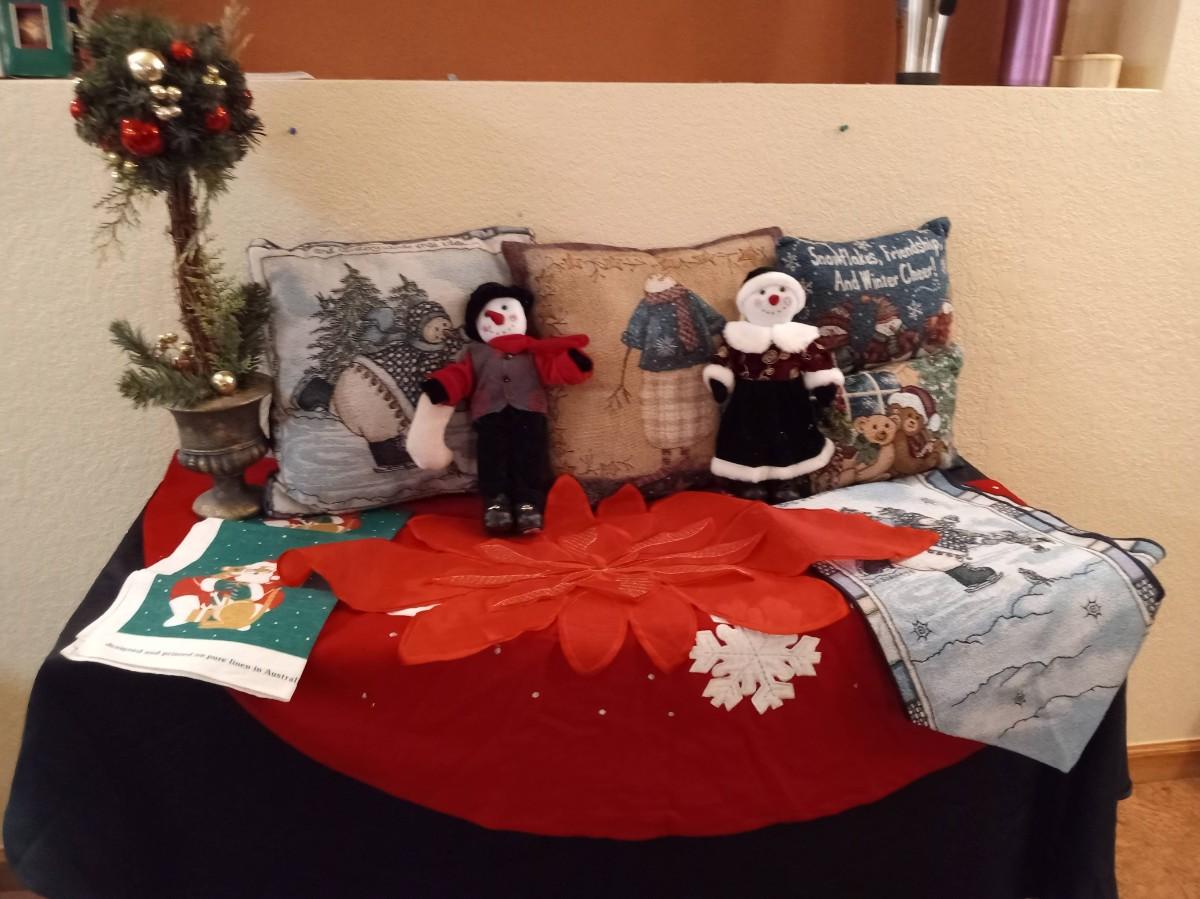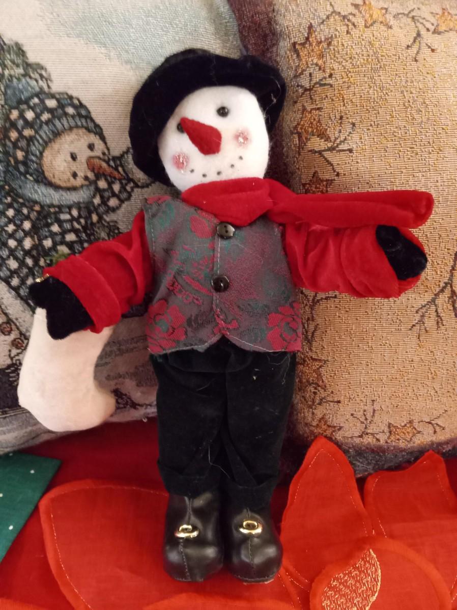 MR AND MRS PLUSH SNOWMAN, TABLE RUNNER, SMALL TABLECLOTH, POINTSETTIA DOILY, FAUX TREE