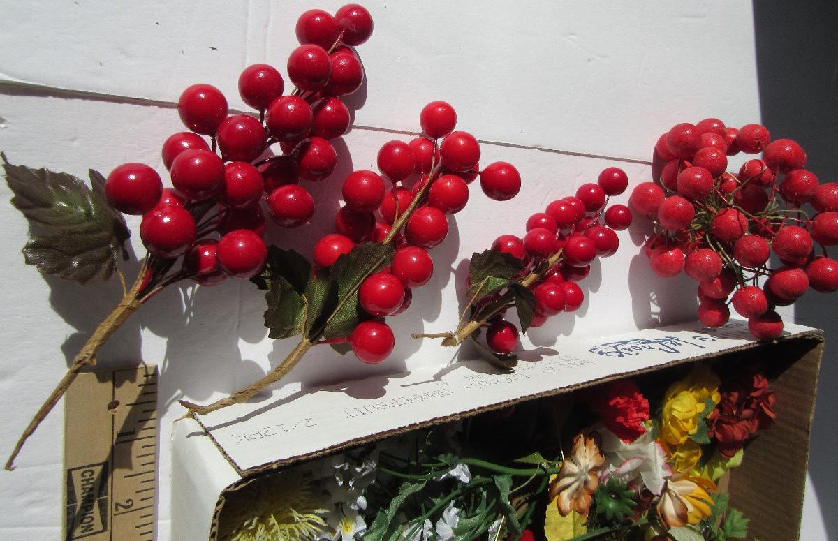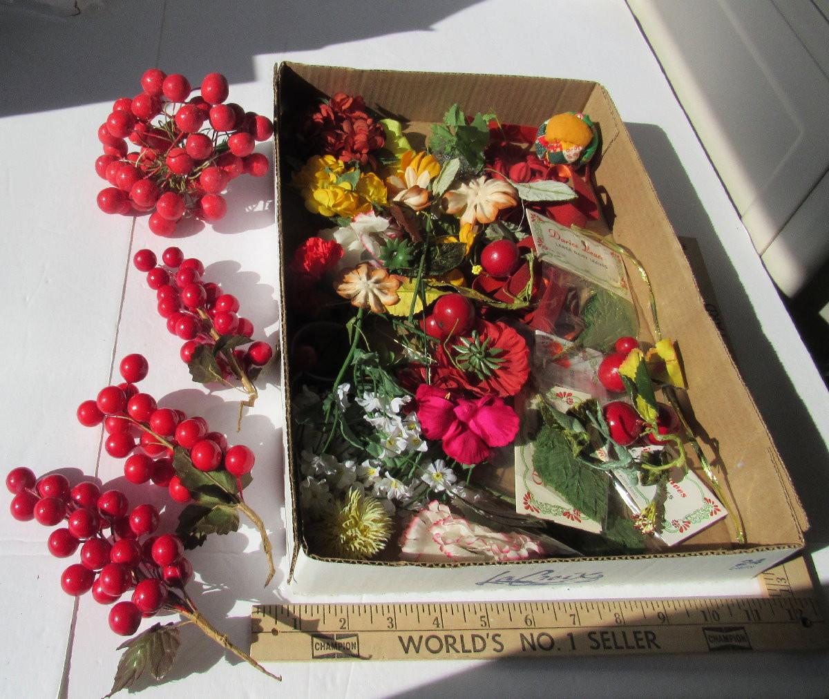 Some older floral and fruit crafting pieces, fabric, plastic, paper flower making parts, candle holders, lots of crafts stuff. Shipping available at shipping cost plus $5 handling fee per box. All sales final, no refunds. See our terms for details.