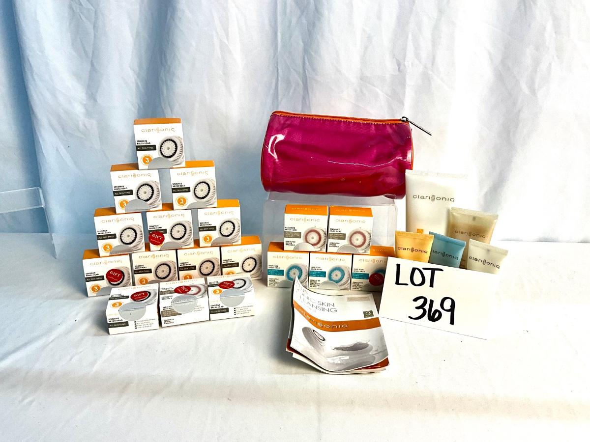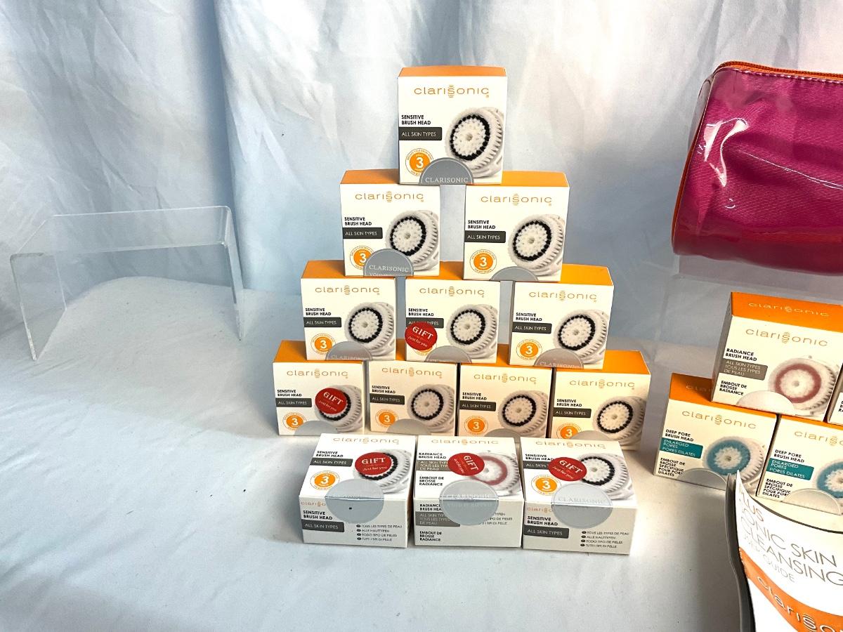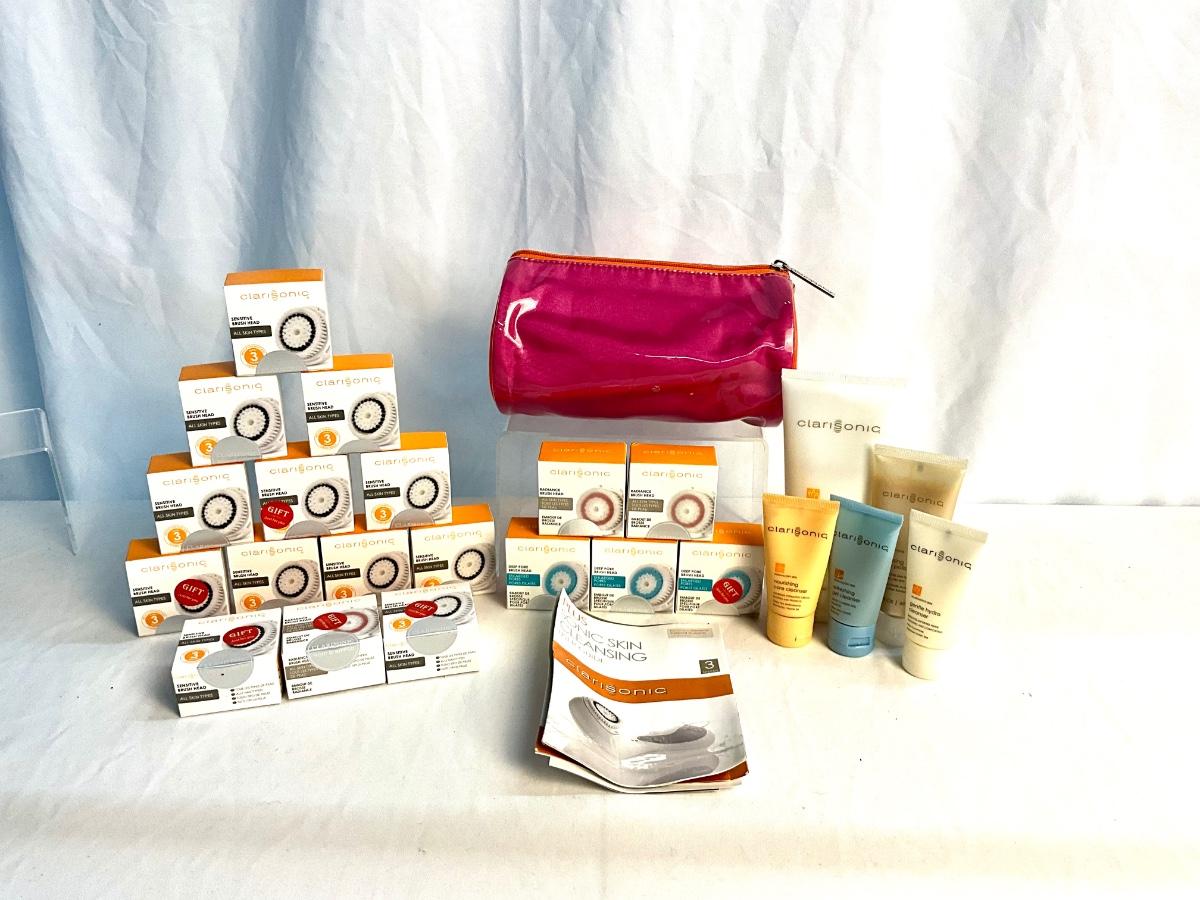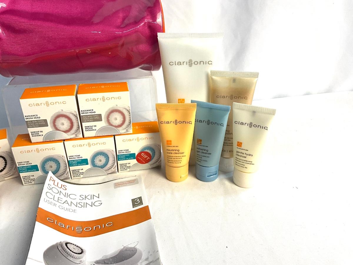 This lot contains assorted Clarisonic cleansing creams, cleansers and lotions with a carrying case. There are 18 replacement brush heads. (12 x sensitive brush heads, 3 x radiance brush head, 3 x deep pour brush head) All items are new, the actual Clarisonic device is not included, strictly replacement heads.