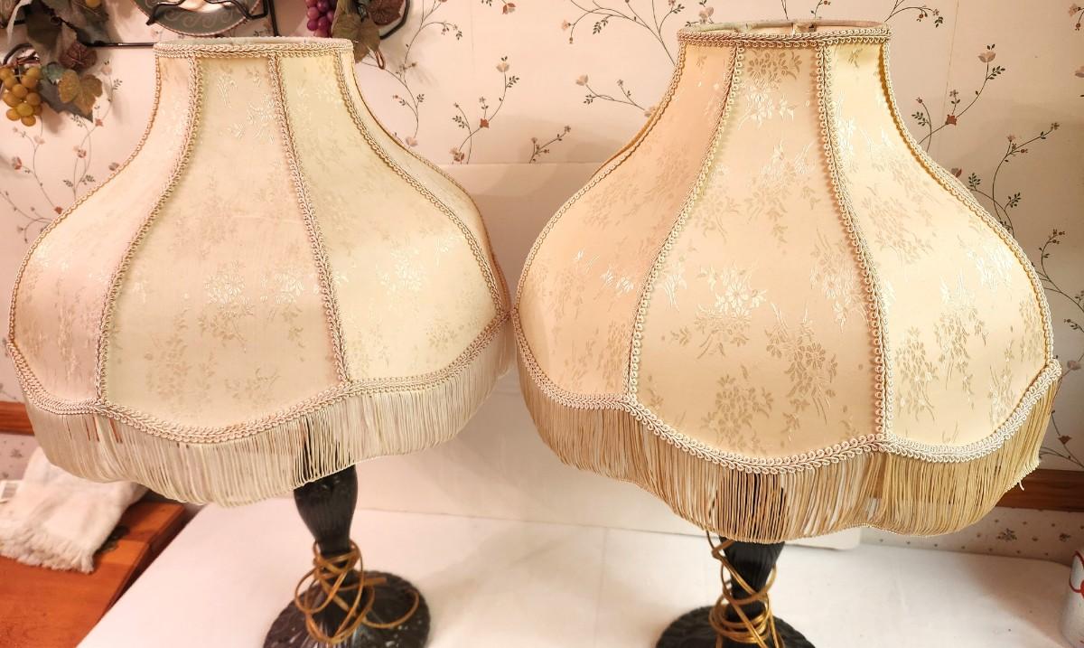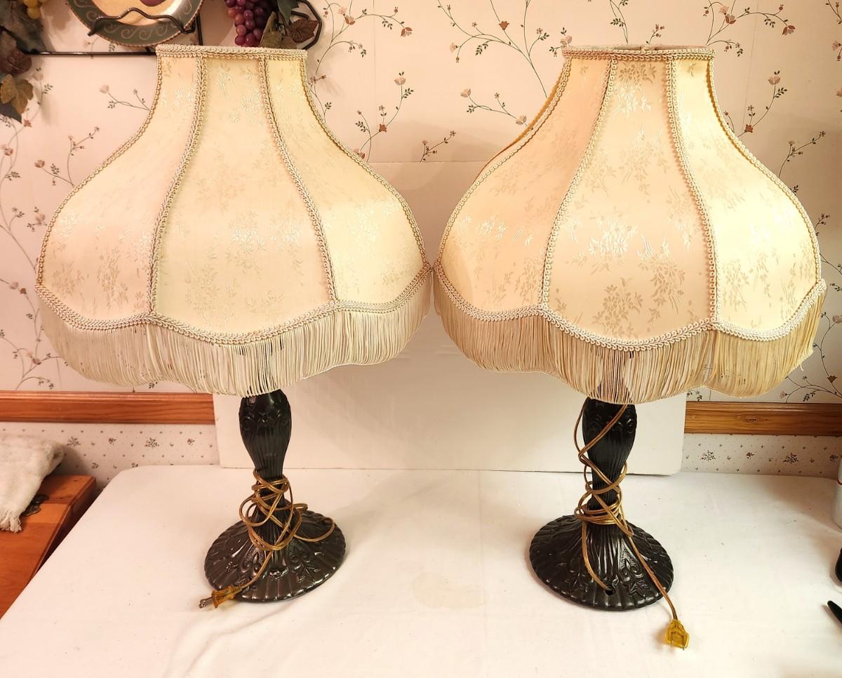 Pair of good looking decorator table lamps with fringed shades - 28" tall, both in good working condition.