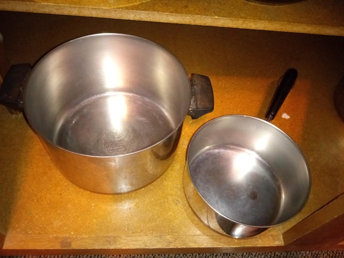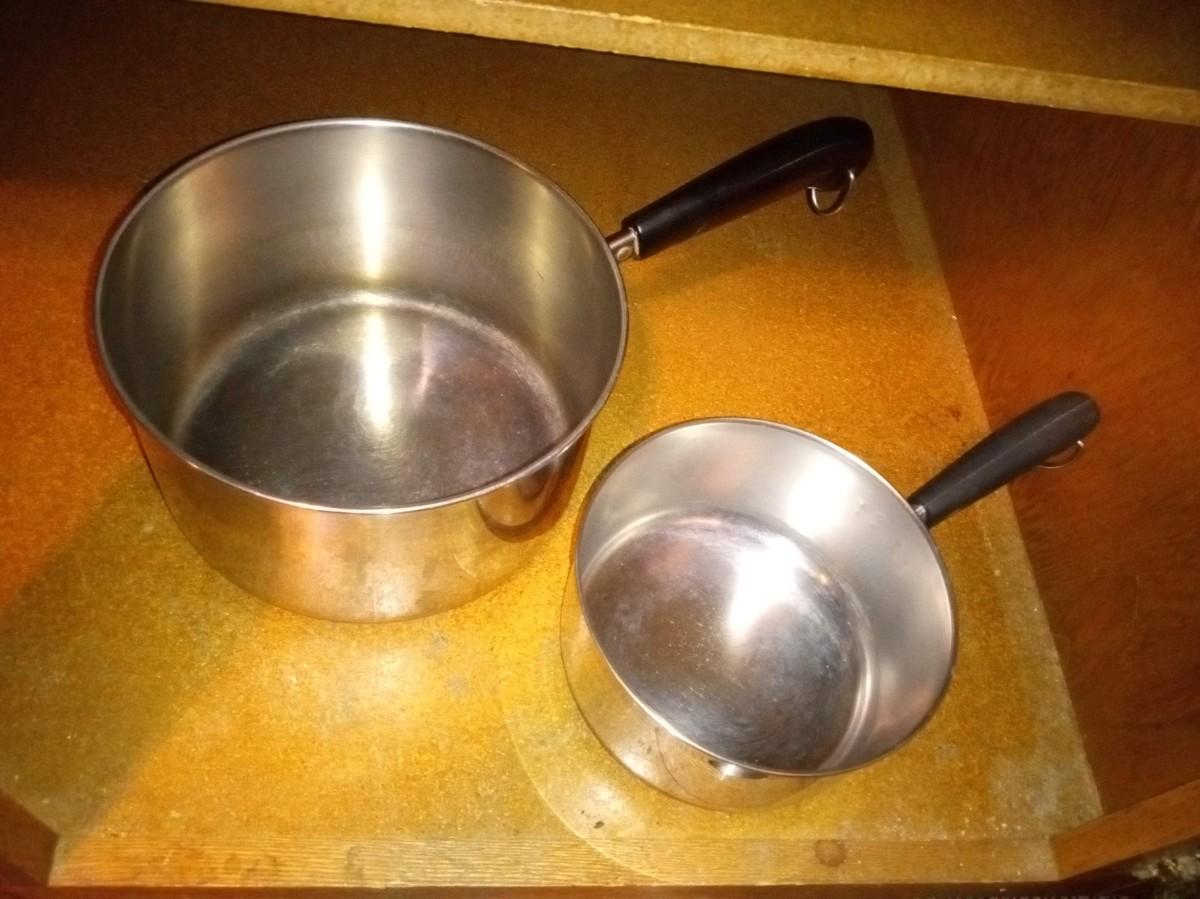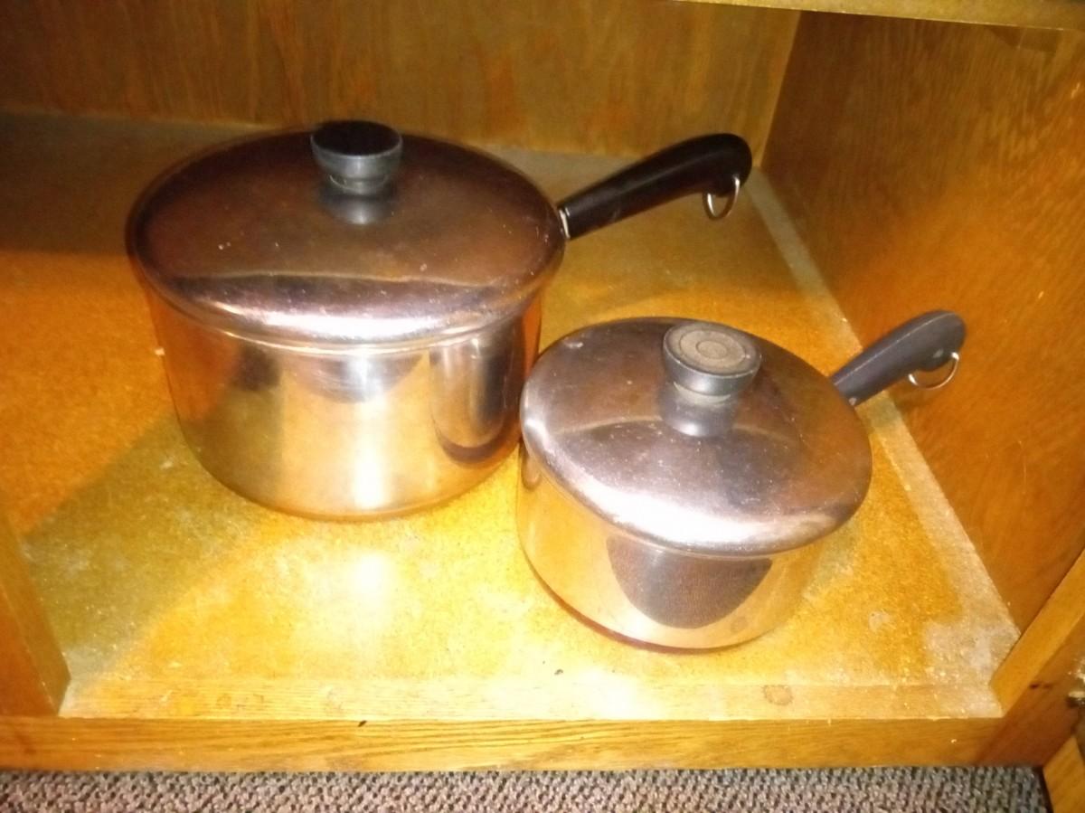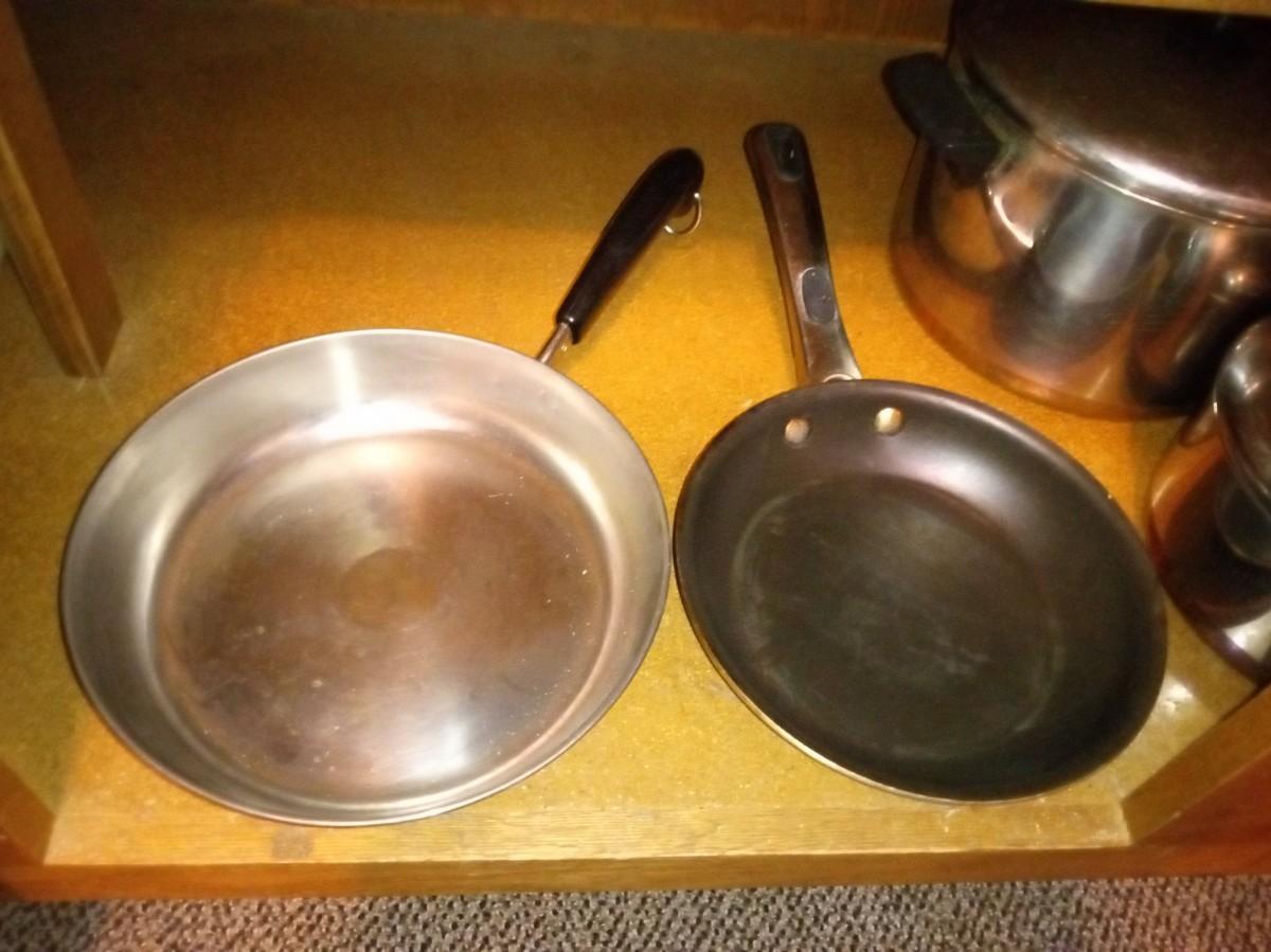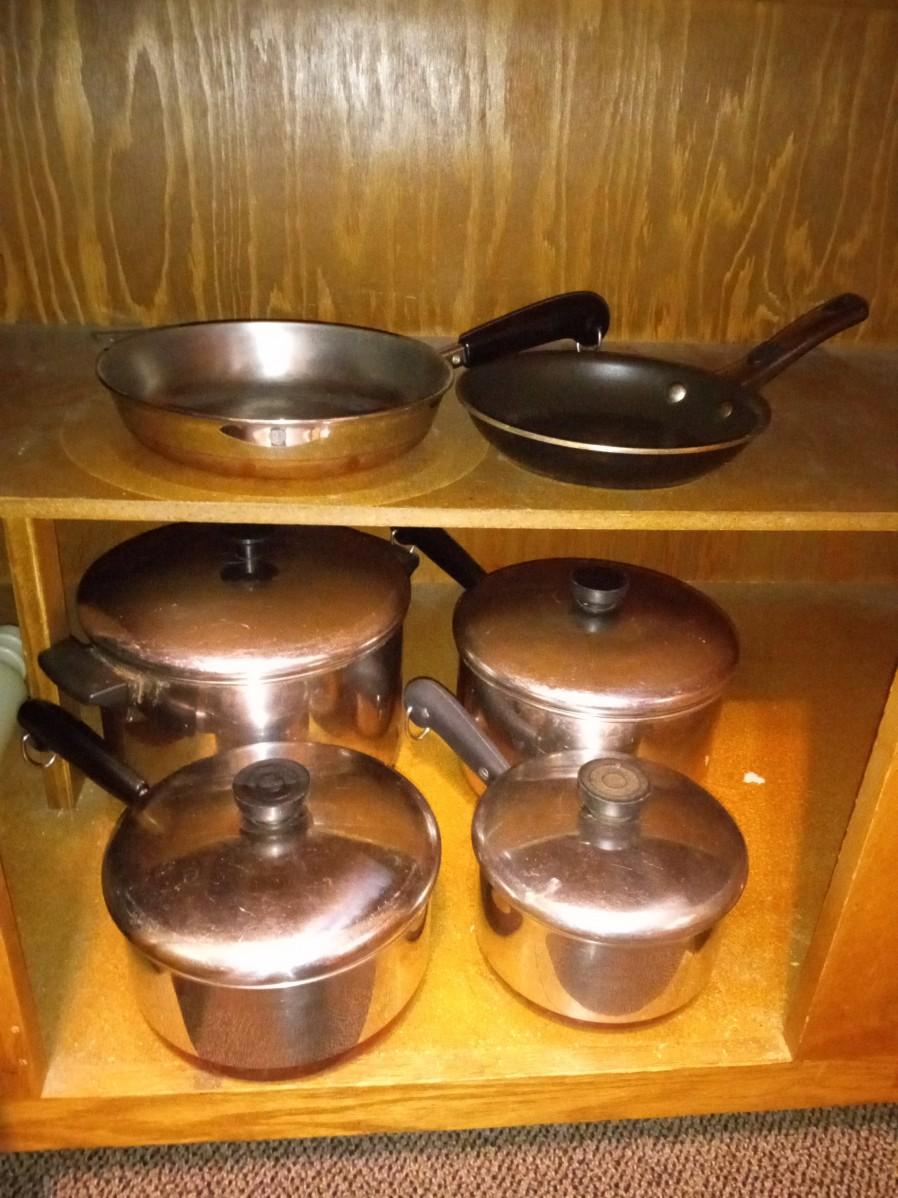 NINE PIECE REVERE WARE IN GOOD SHAPE AND A SMALL TEFLON SKILLET