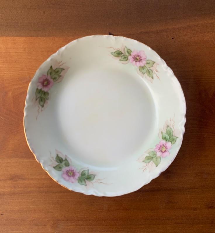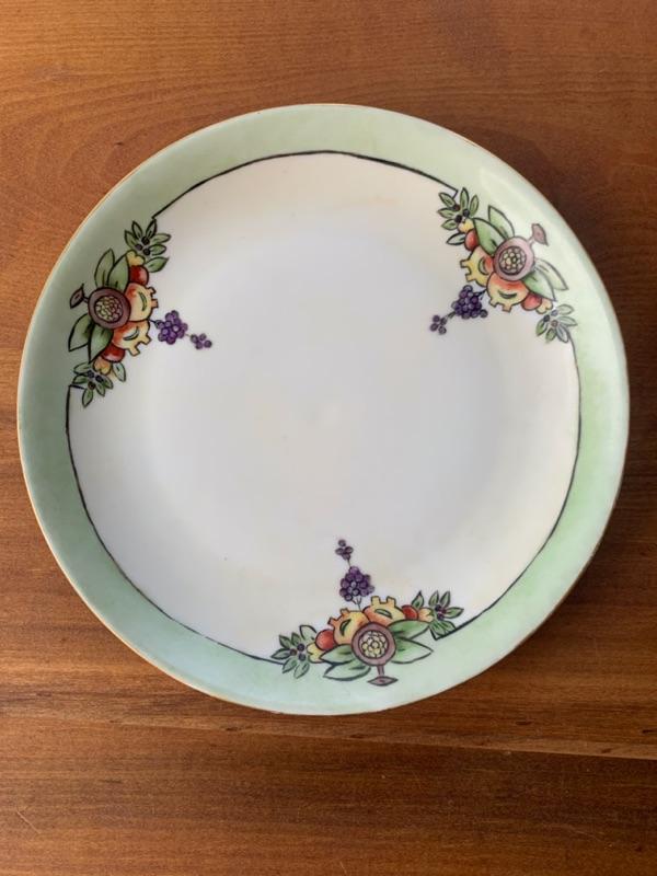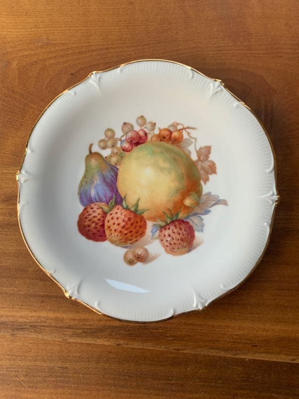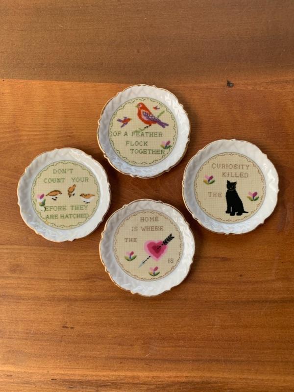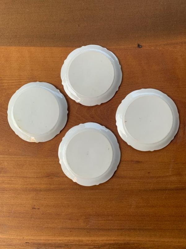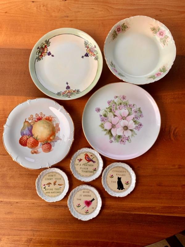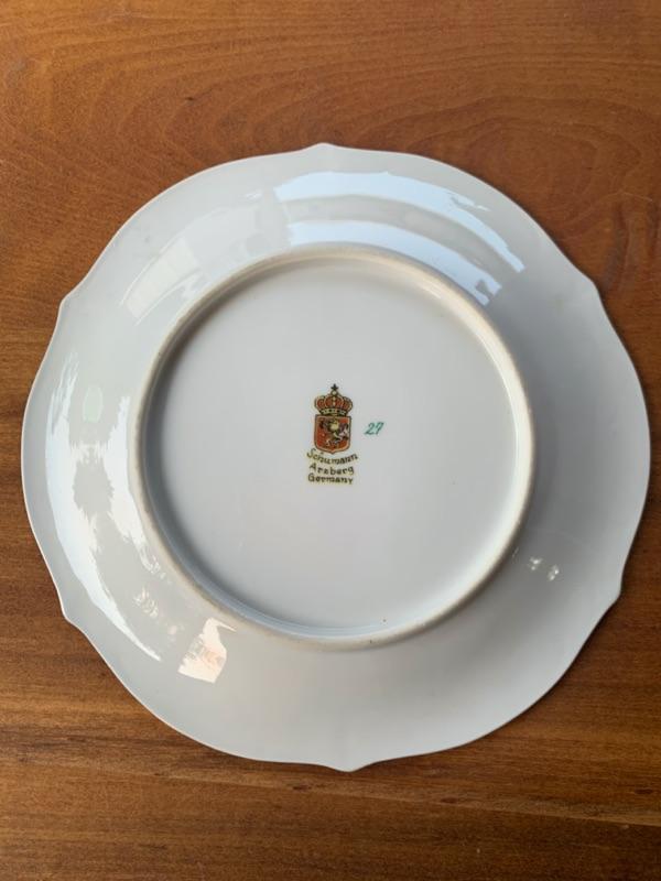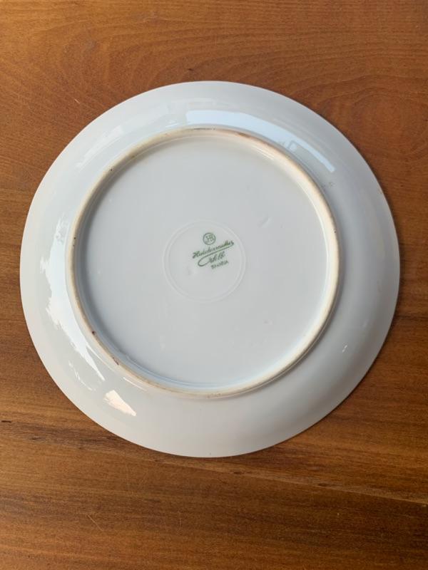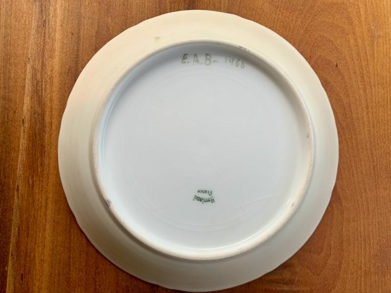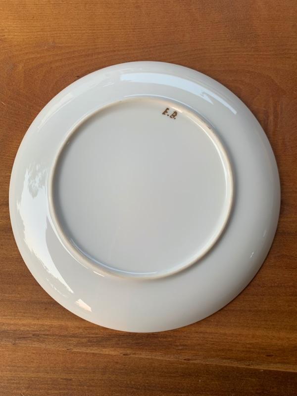 All hand painted, except for set of 4 smallest. Makers: Havilland (France) porcelain dish, signed and dated by artist (EAB 1966), Schumann Arzberg (Germany). Hutschenreuther Selb (Bavaria), No maker stamp - artist signed (EB). Four small 3 1/2" plates with printed wise sayings. No cracks, chips or repairs noted on larger plates. Repair on one of the 3 1/2" plate.