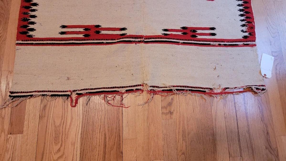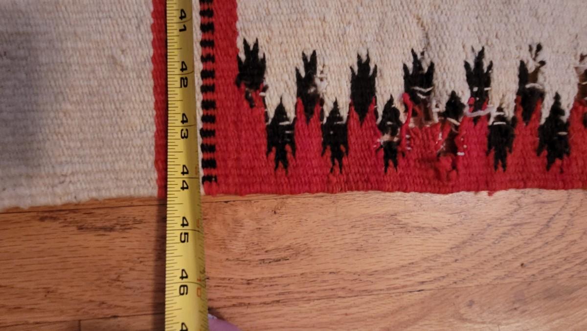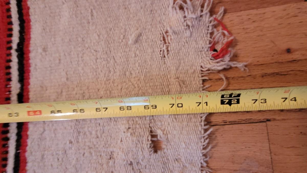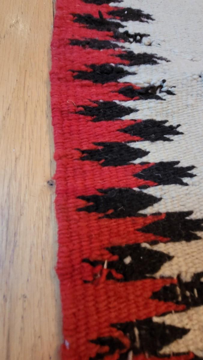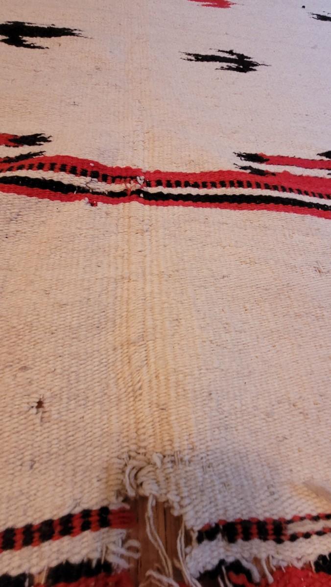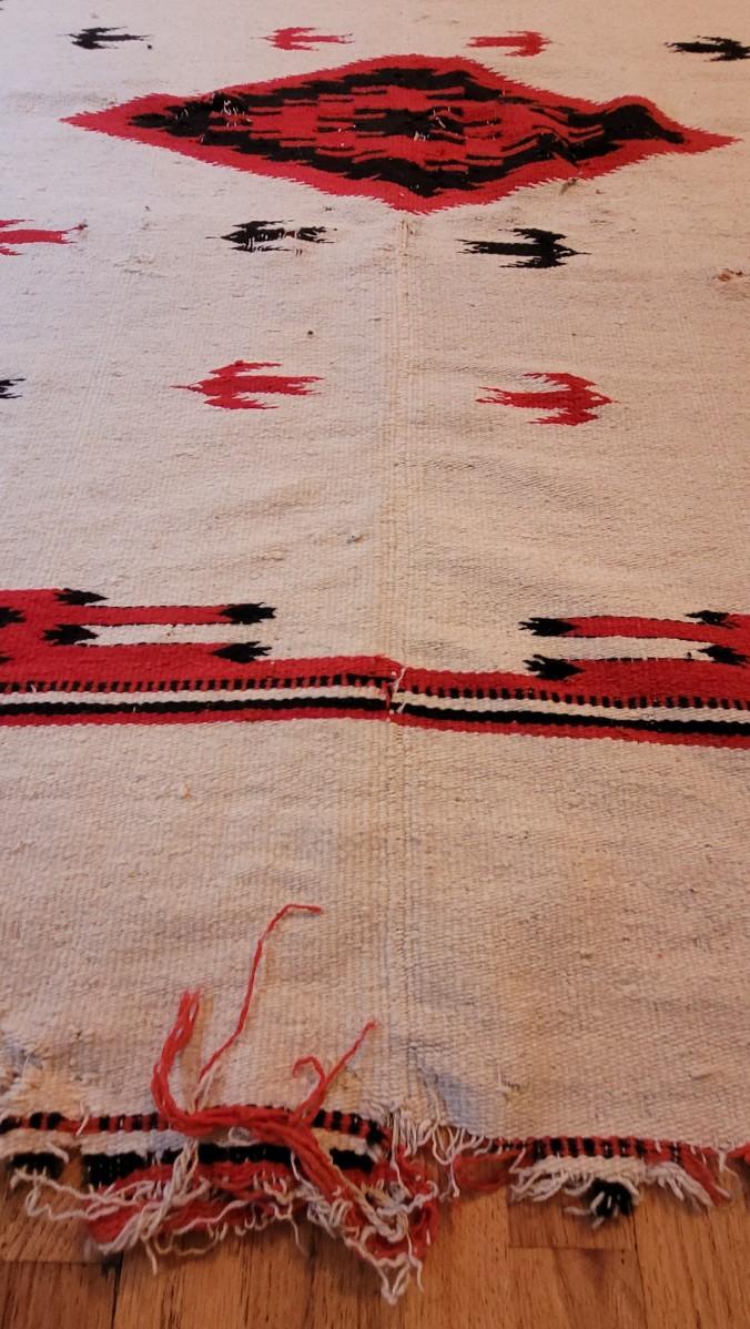 The bright red and black design are 2 separate weavings sewn together. This is a thick wool serape in the Navajo style.
