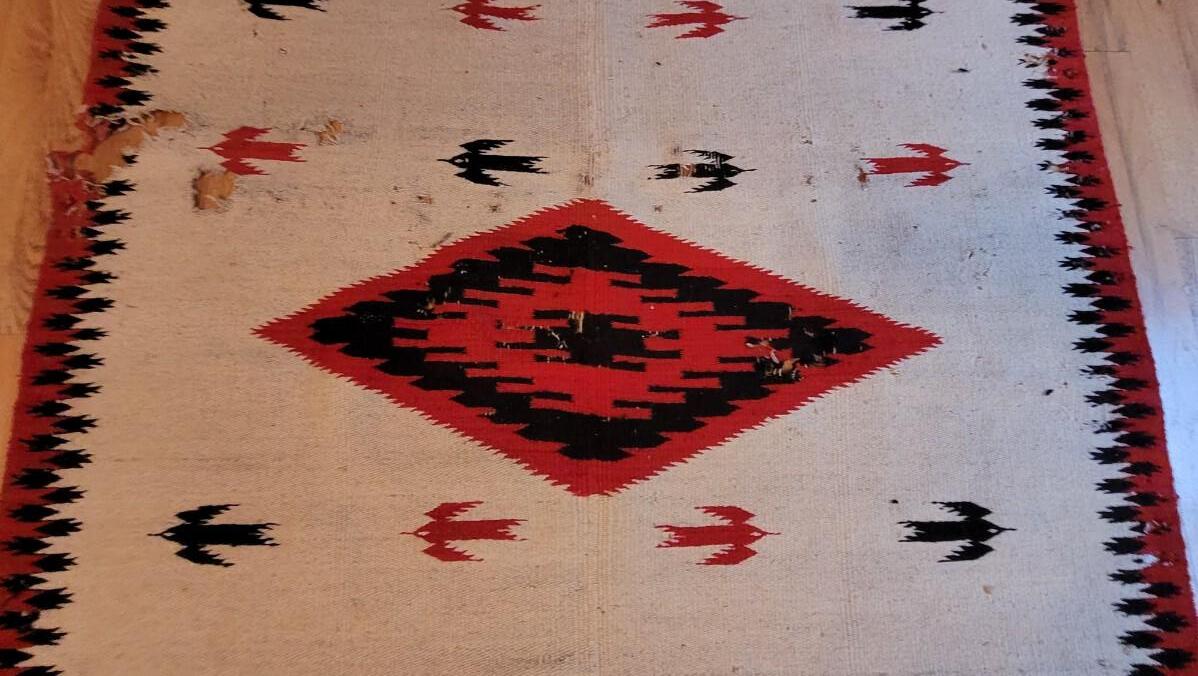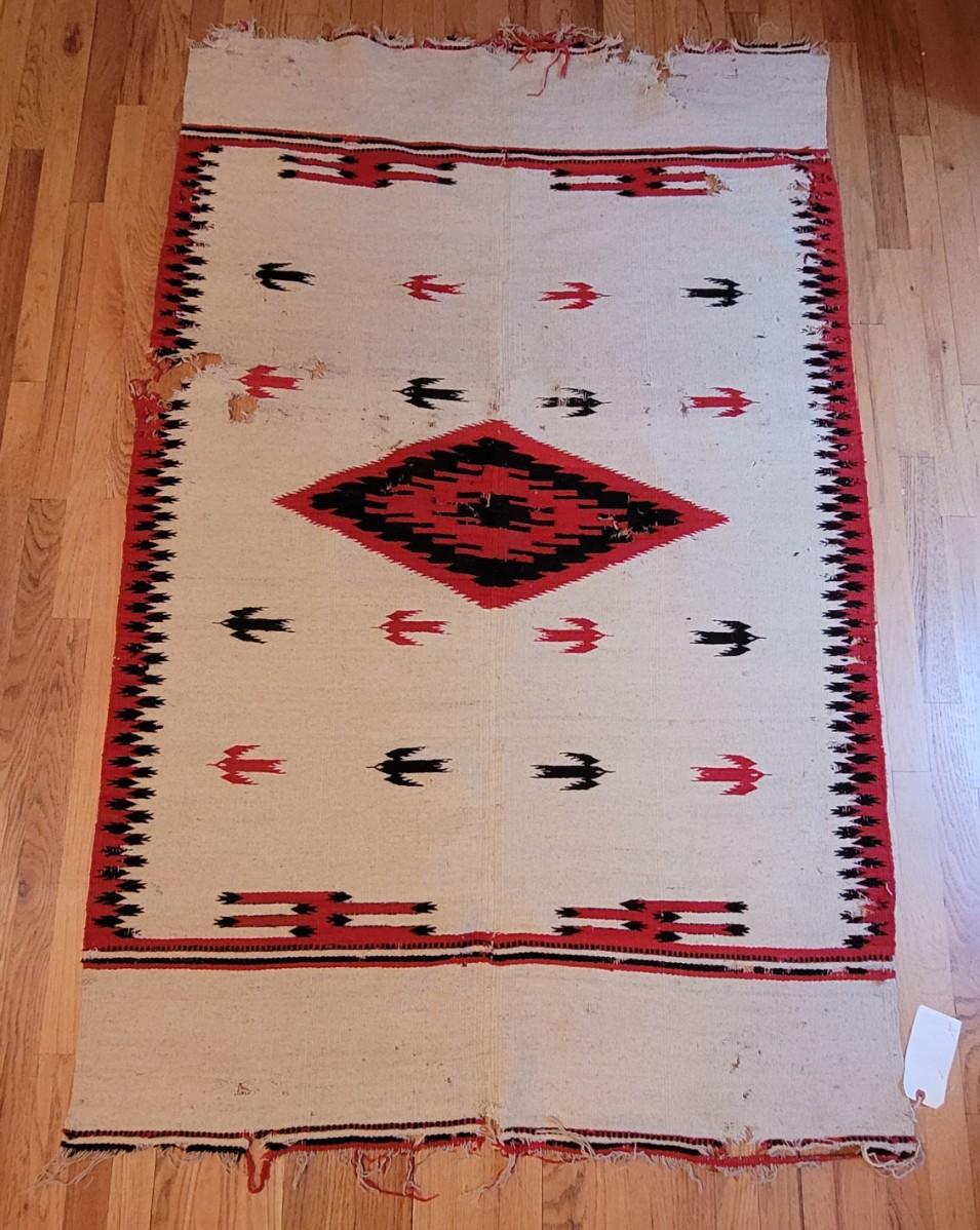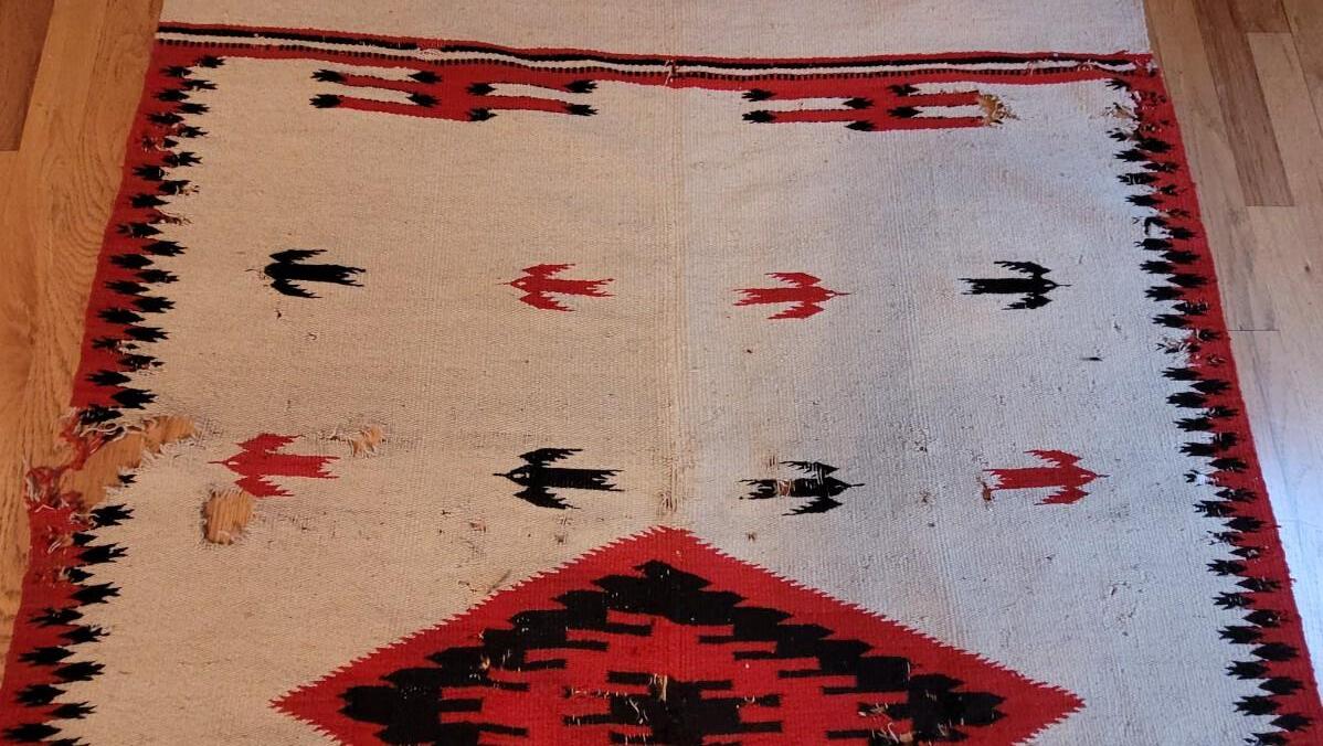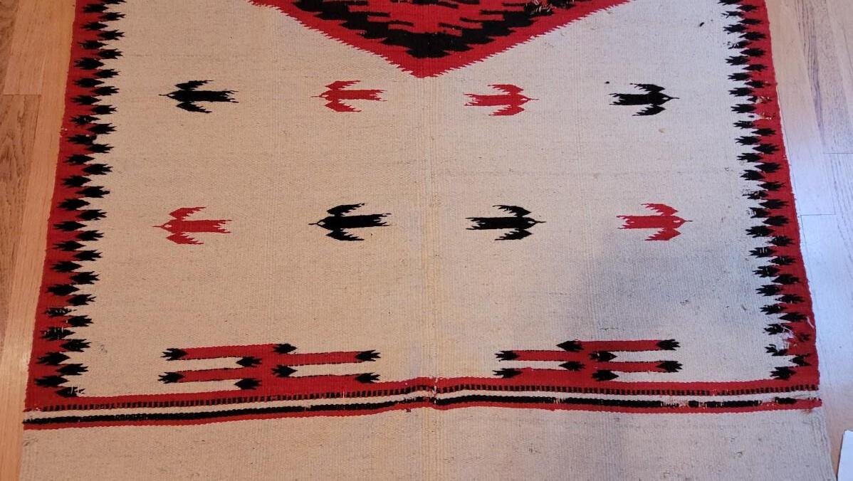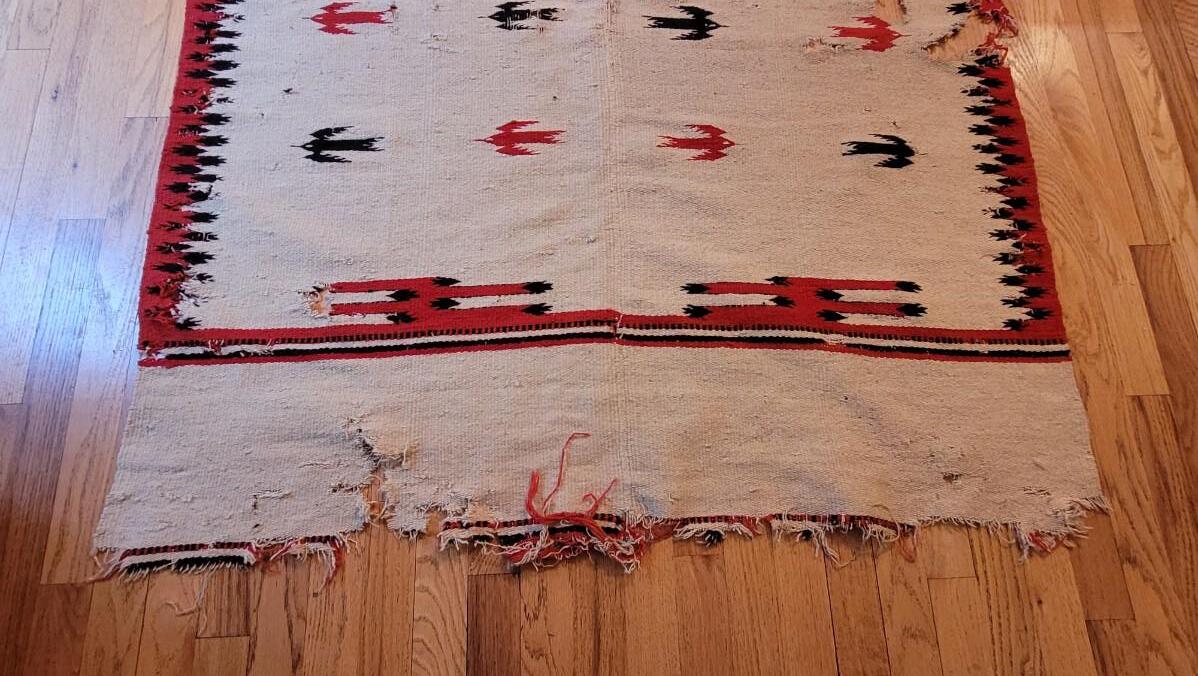 The bright red and black design are 2 separate weavings sewn together. This is a thick wool serape in the Navajo style.