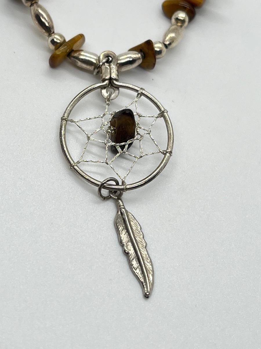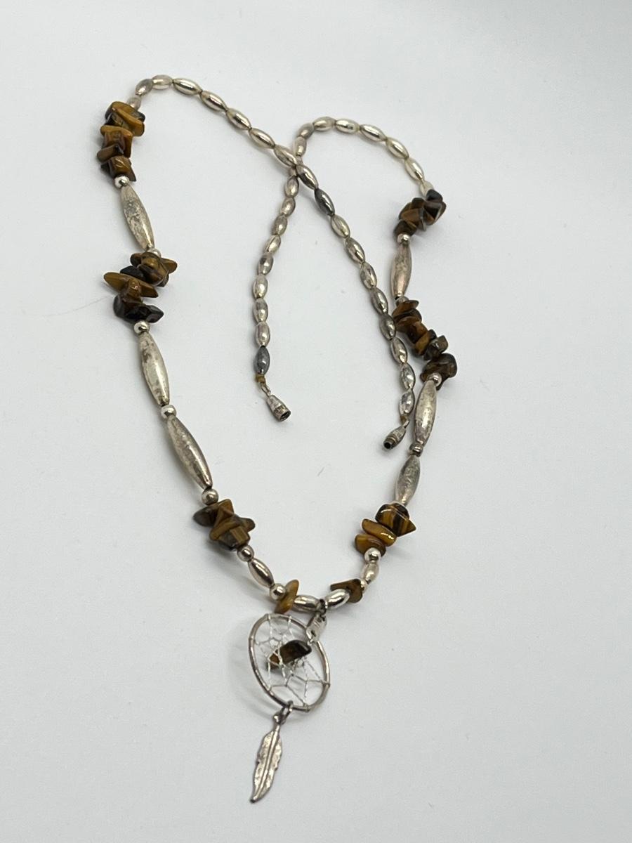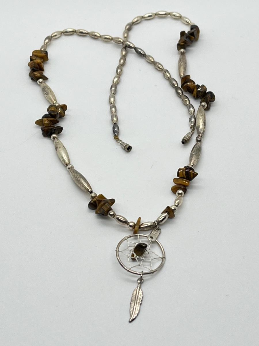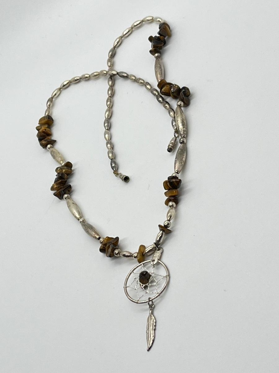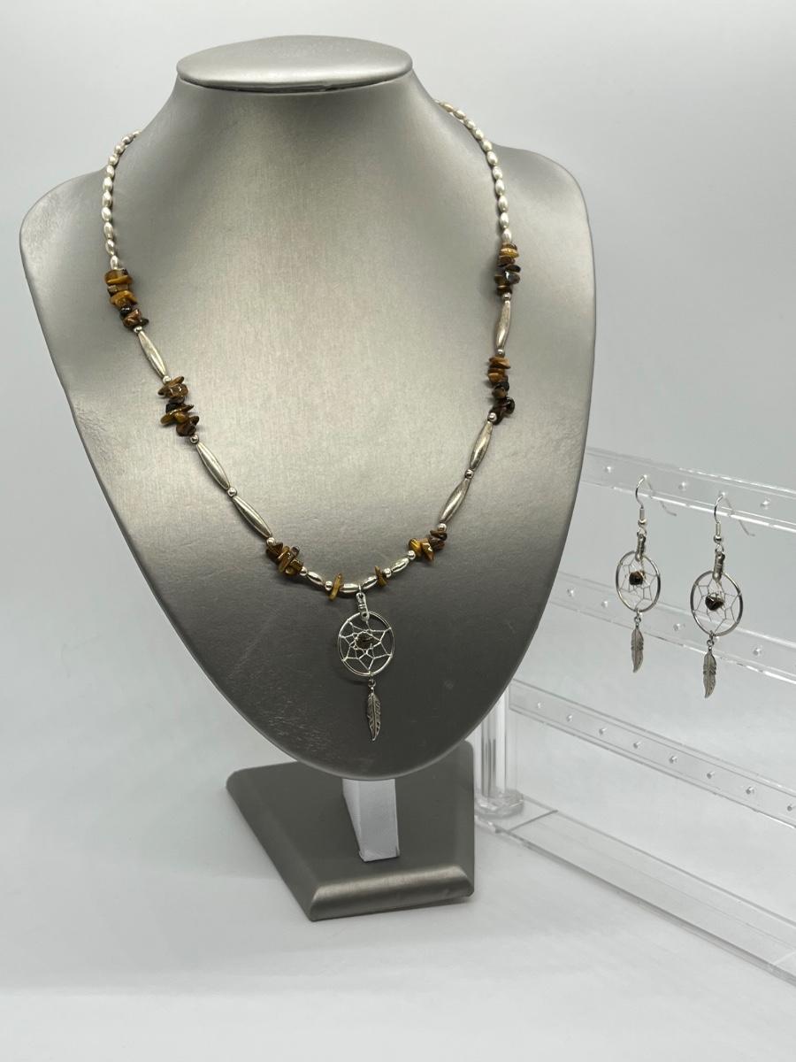 LOT 37: Dreamcatcher Necklace (22") and Pierced Earrings - Silver Beads & Tiger's Eye