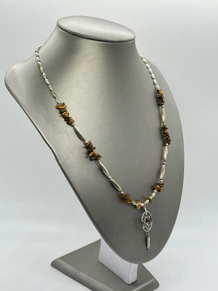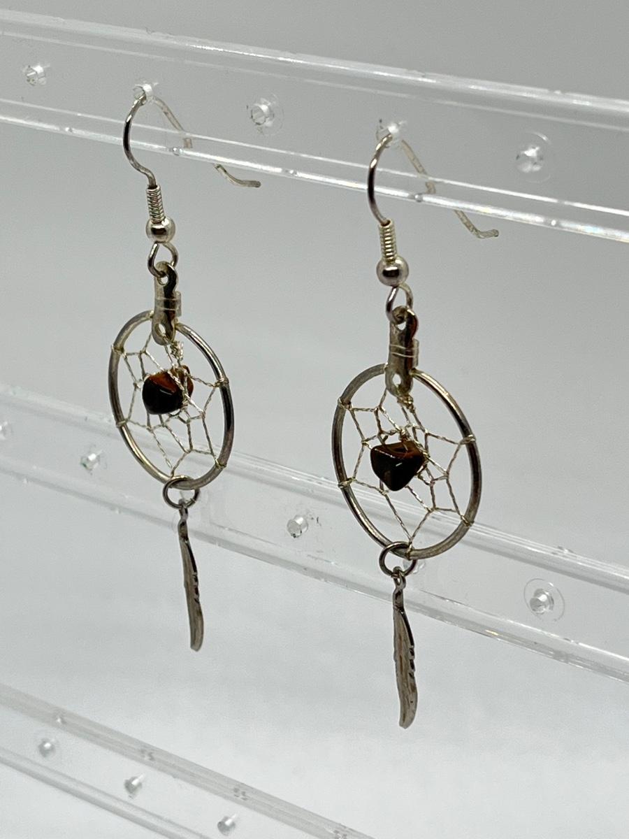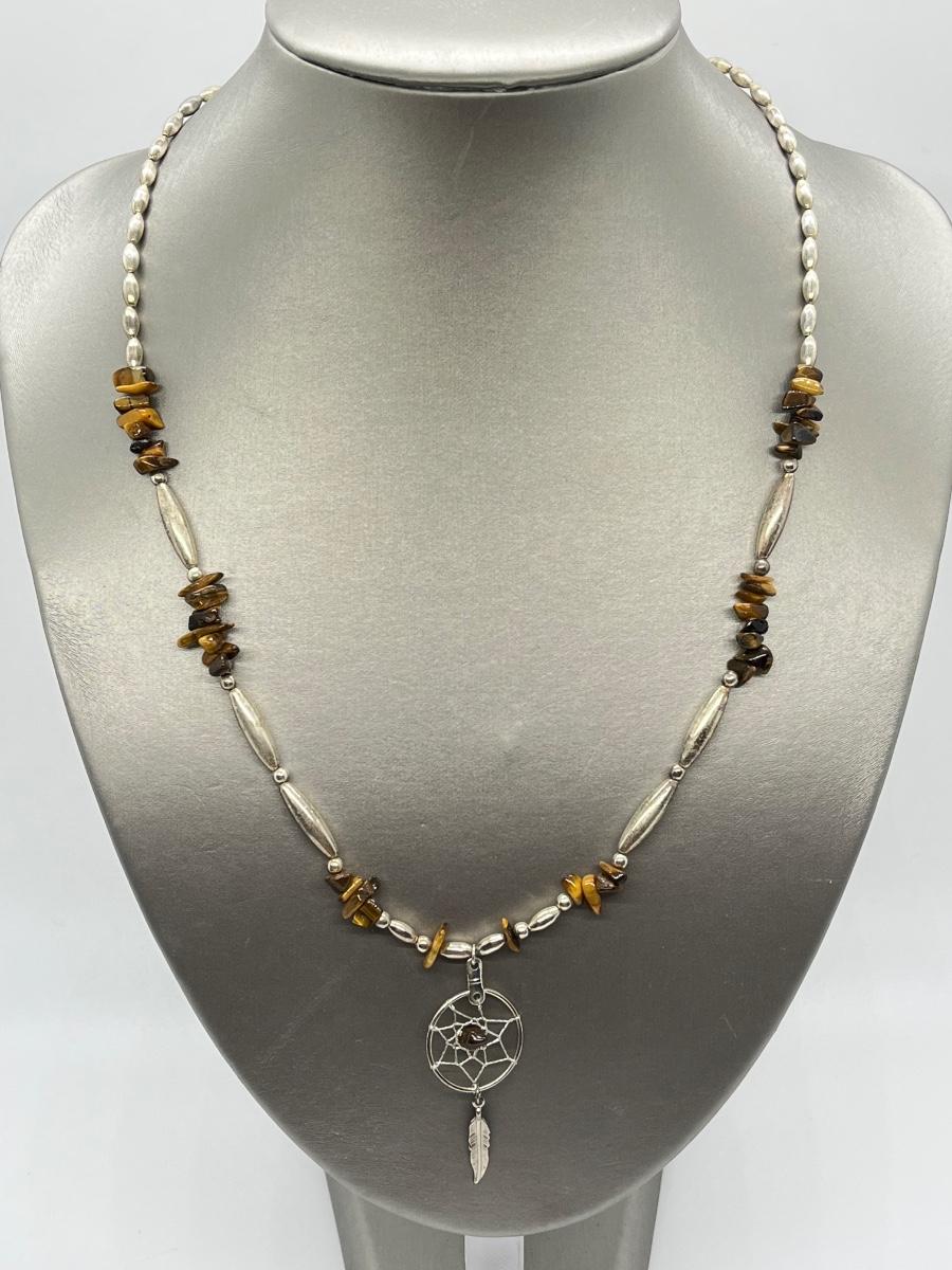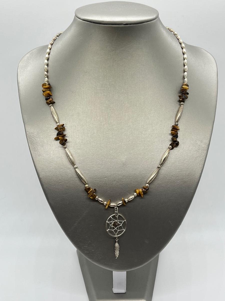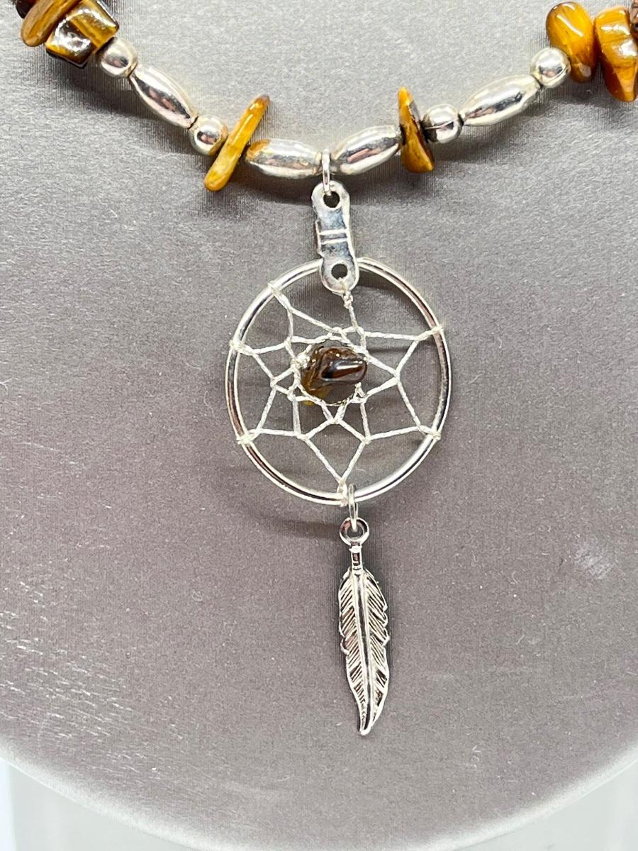 LOT 37: Dreamcatcher Necklace (22") and Pierced Earrings - Silver Beads & Tiger's Eye