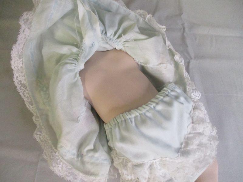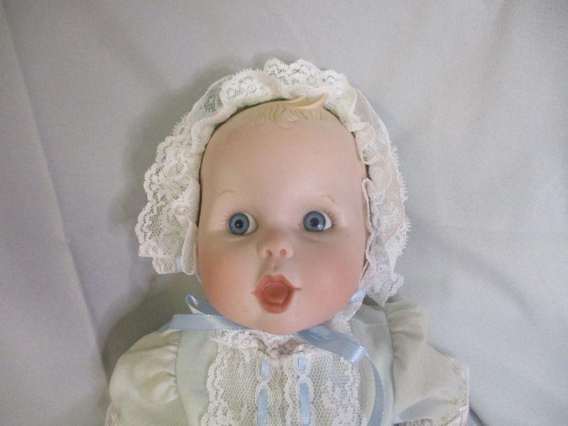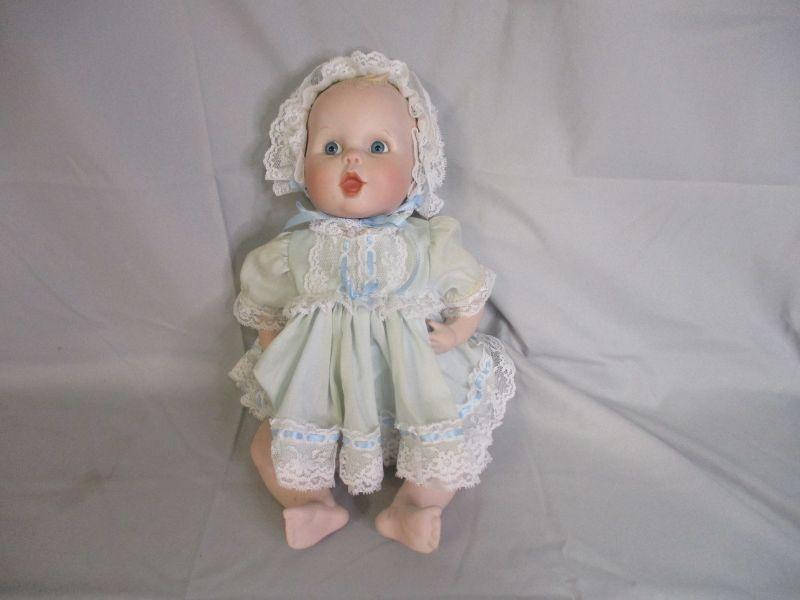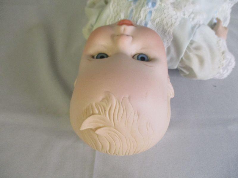This doll is all porcelain - head, arms, legs, and torso. The only issue found is that the strings holding all of the parts together is loose. The beautiful baby is about 14" long.