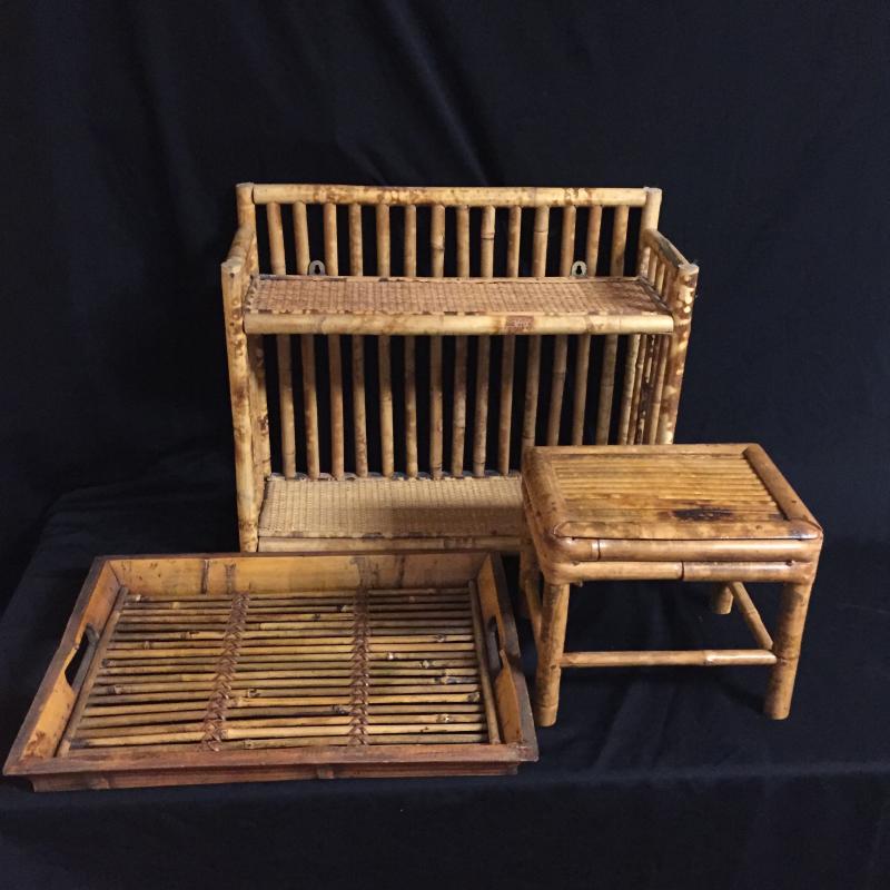 Bamboo Shelves, Ting Stool and Tray. Largest Shelf Measures 17.5”x6.5”x15”. Local Pickup Only
