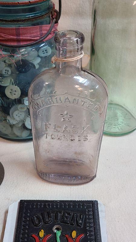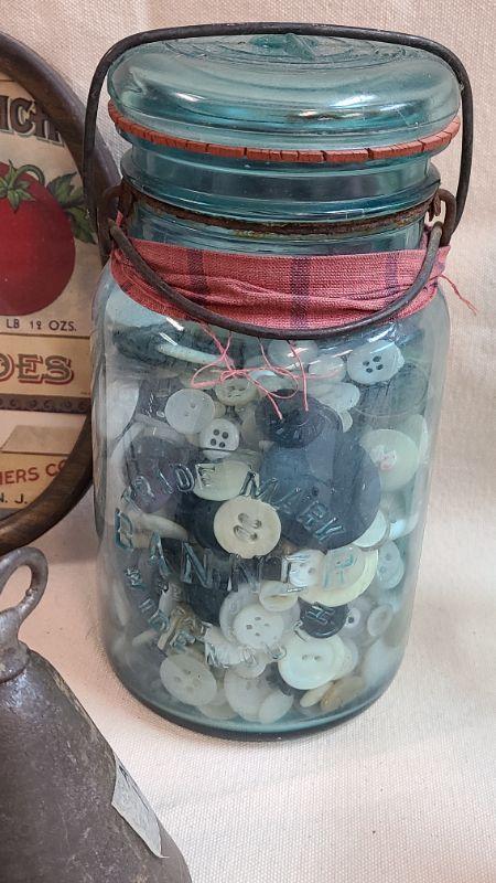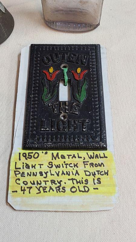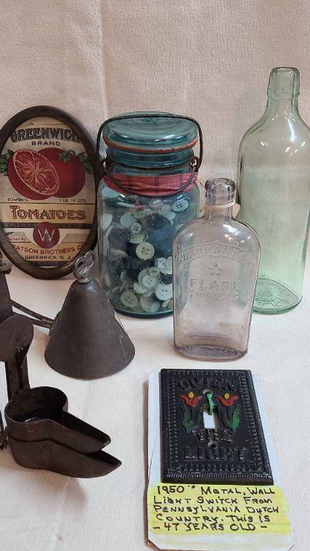 Banner Blue Canning Jar, Warranted Flask Bottle, Amish antique light switch cover, and more. Please see all pictures for condition of the items listed and what is included in the lot. Pictures will also show any measurements if taken and is the best representation of the items. Thank you for looking and have fun bidding! We appreciate Treasure Hunters!