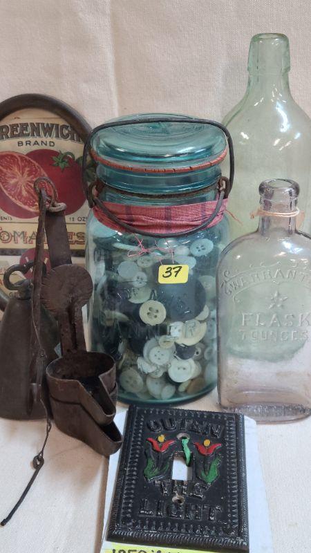 Lot 37: Bottles, Buttons, Amish Cast Switch Cover and More