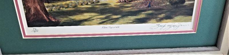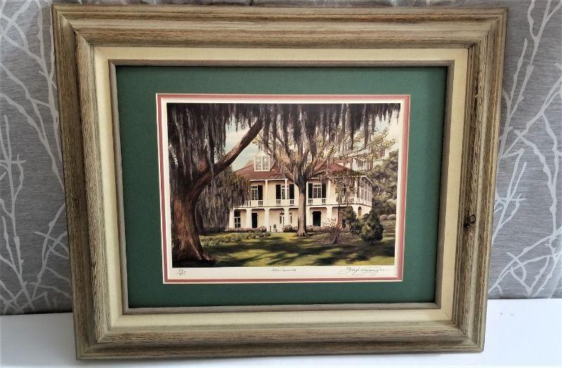 Print of "Kenilworth" Plantation by noted artist Brad Thompson. Print is signed and is #76/975. NOTE: the piece was professionally matted and framed, but there is no glass in the frame. Good condition. Measures 23.5" wide and 19.5" tall.