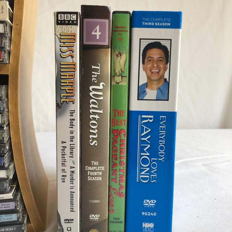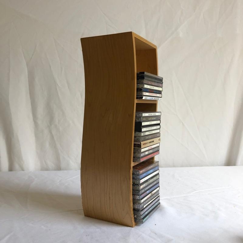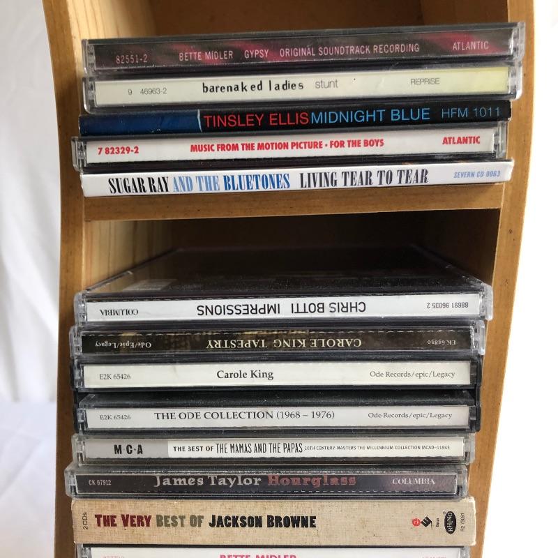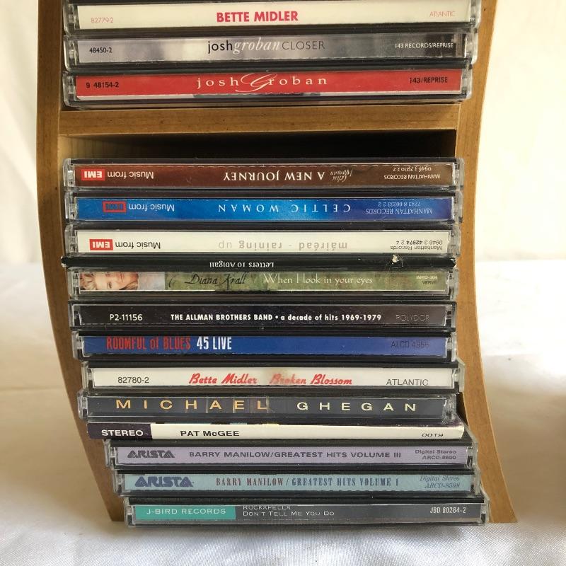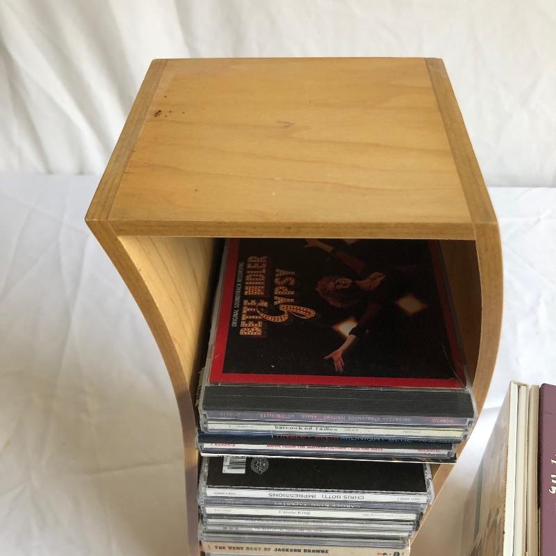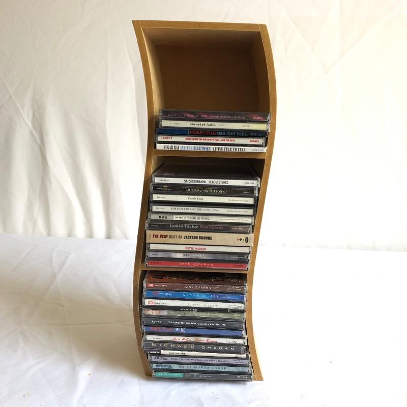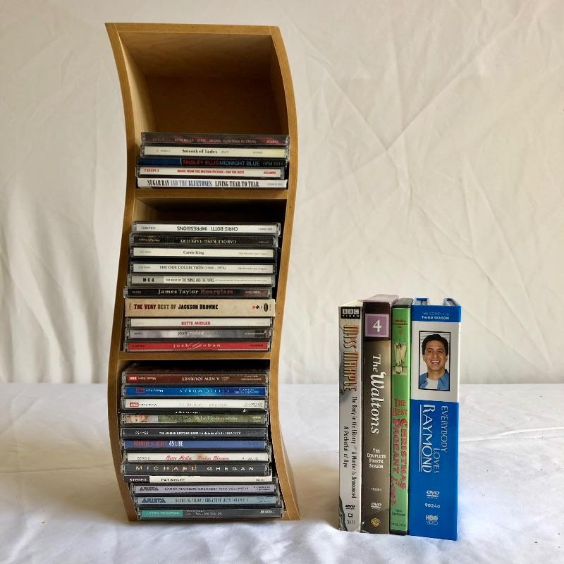 This handy and attractive small CD holder is a pine colored pressed wood with 3 compartments that holds approximately 40 CD’s. Also included are four DVD’s, all titles including the CD’s are shown in the images.