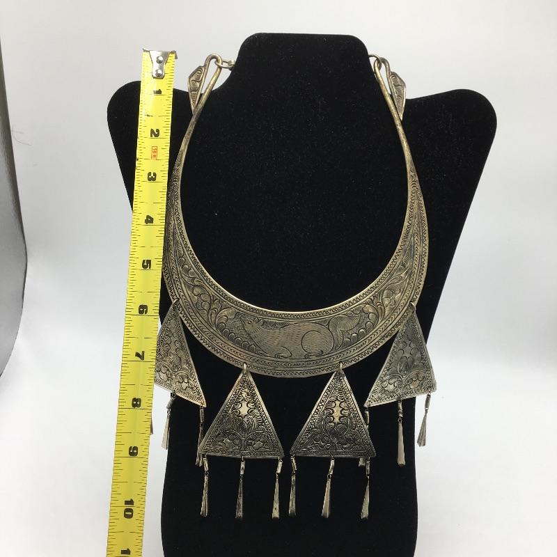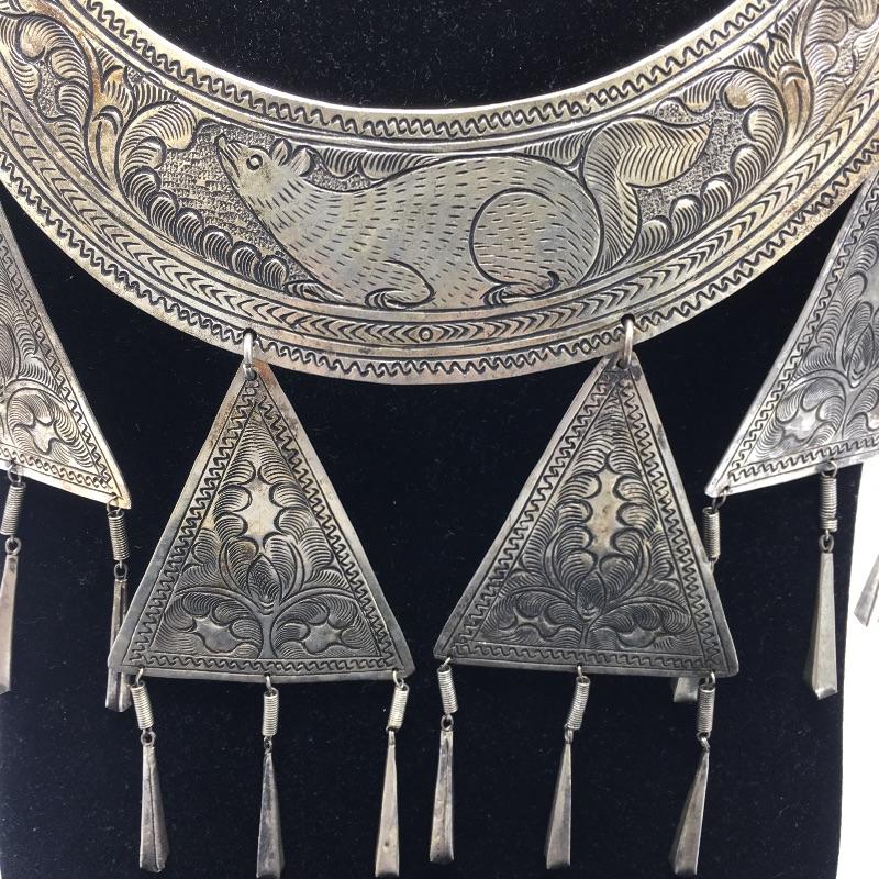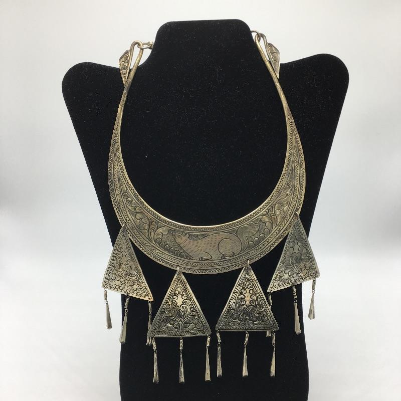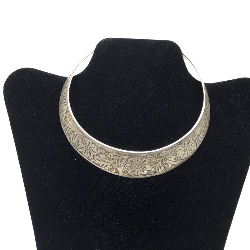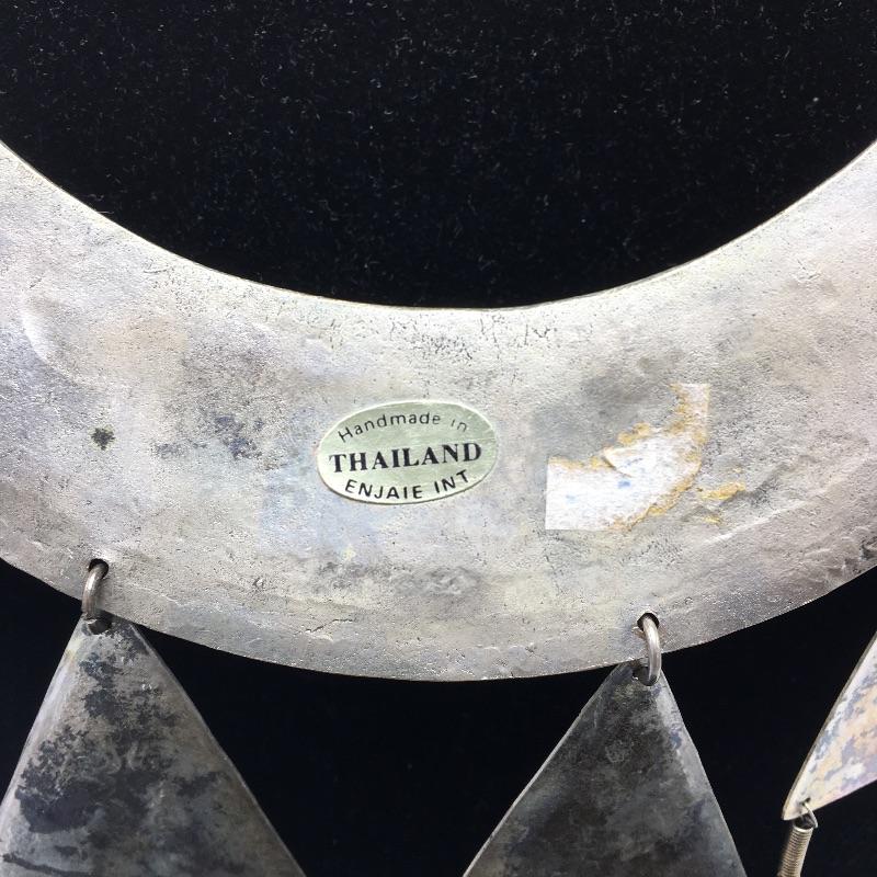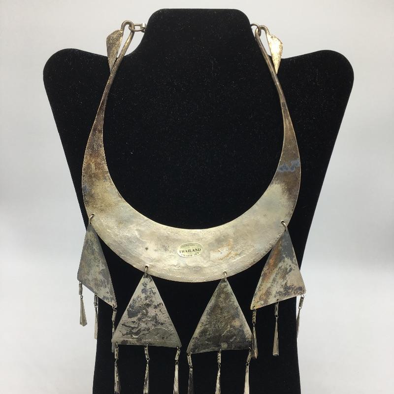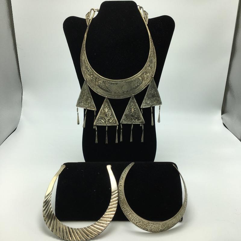 Three metal cuff necklaces. One is handmade in Thailand with four hanging triangles and the other two are made in India with different designs on them. Show off your collarbone with these beauties.