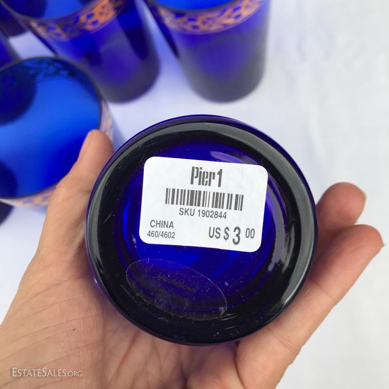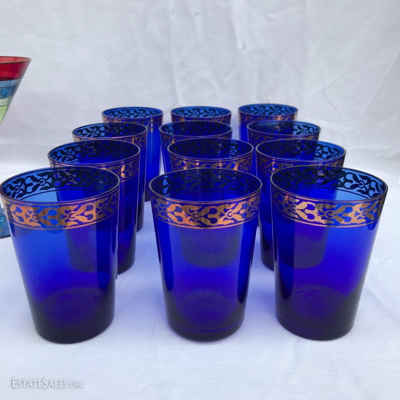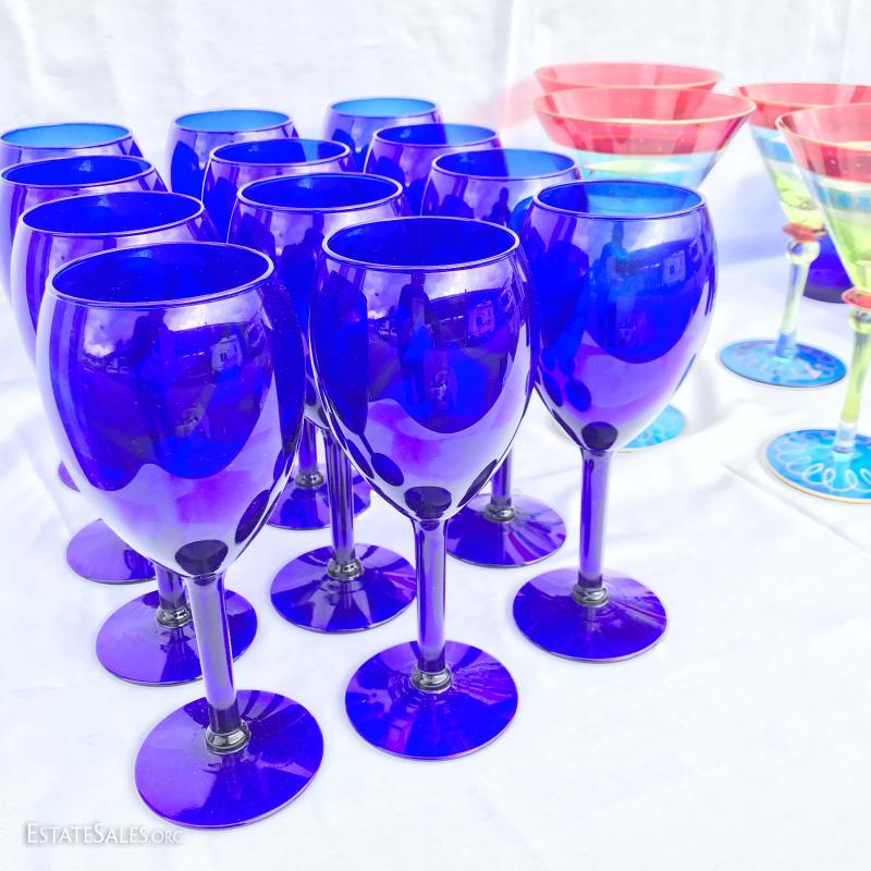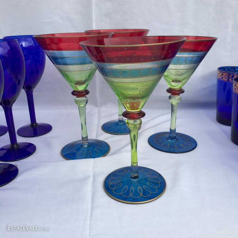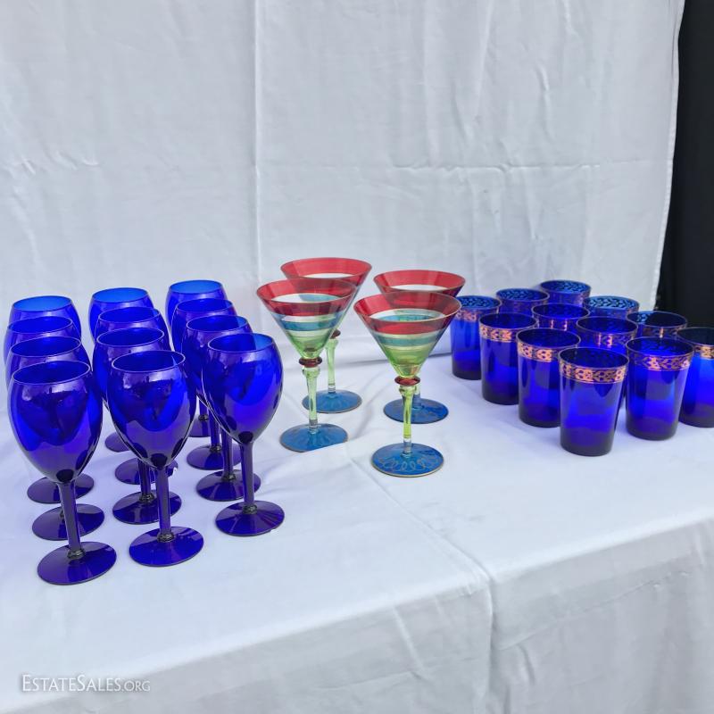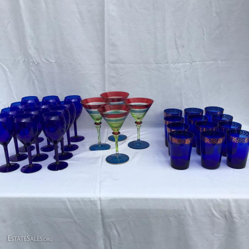 Gorgeous cobalt blue wine glasses, gold trimmed tumblers, and colorful martini glasses. 12 tumblers. 12 wine glasses. 4 martini glasses. Blue Glassware was purchased at Pier One. No shipping. Local pick up only in Asheville, NC.