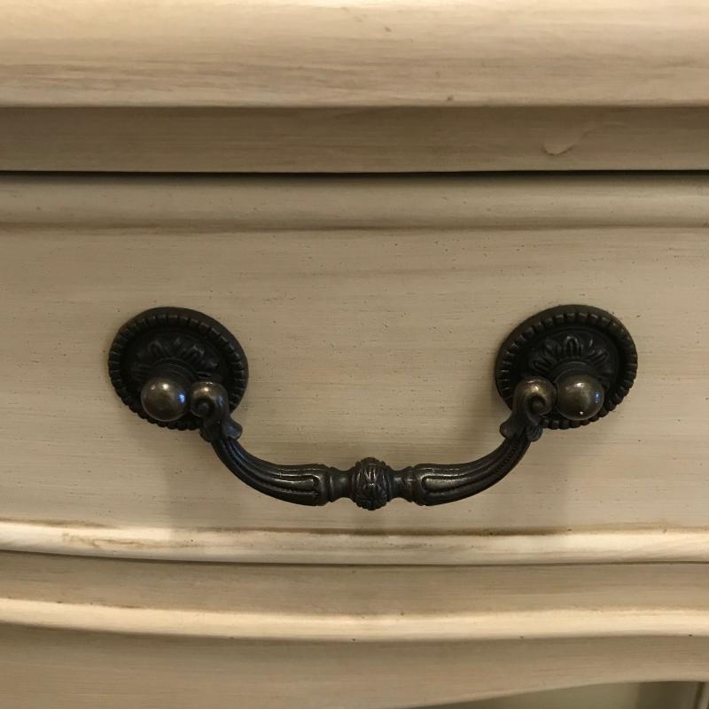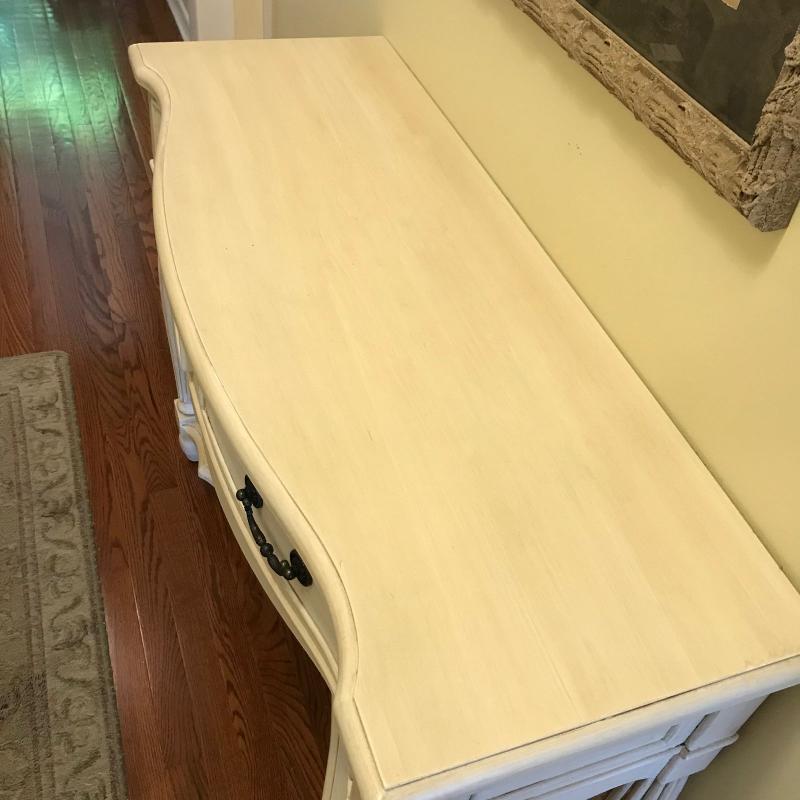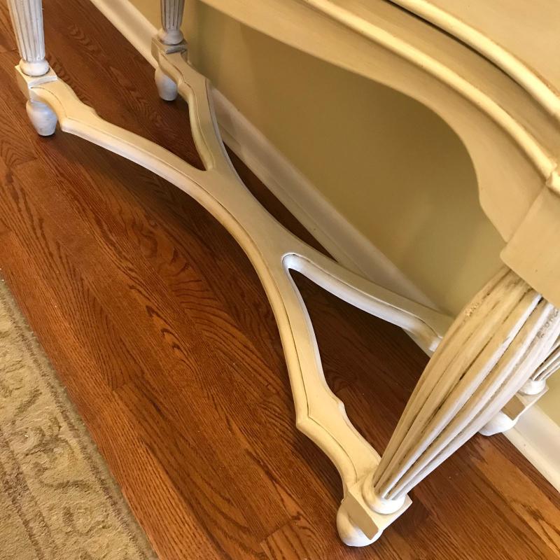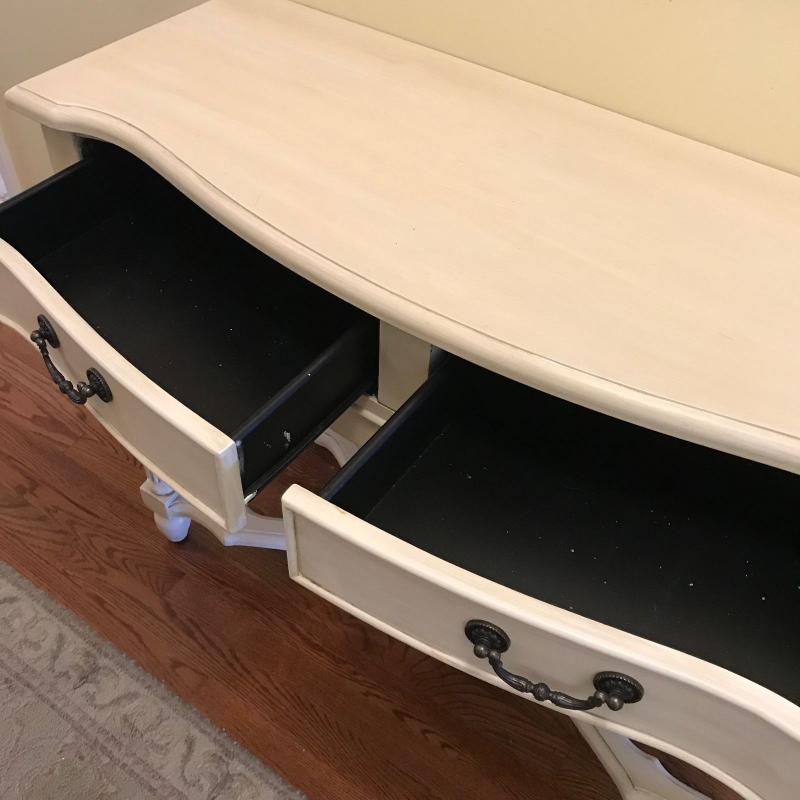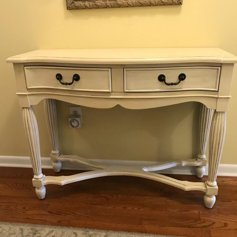 Cream colored hall table. Two drawers. Measures 42” x 16” x 33”. No shipping.