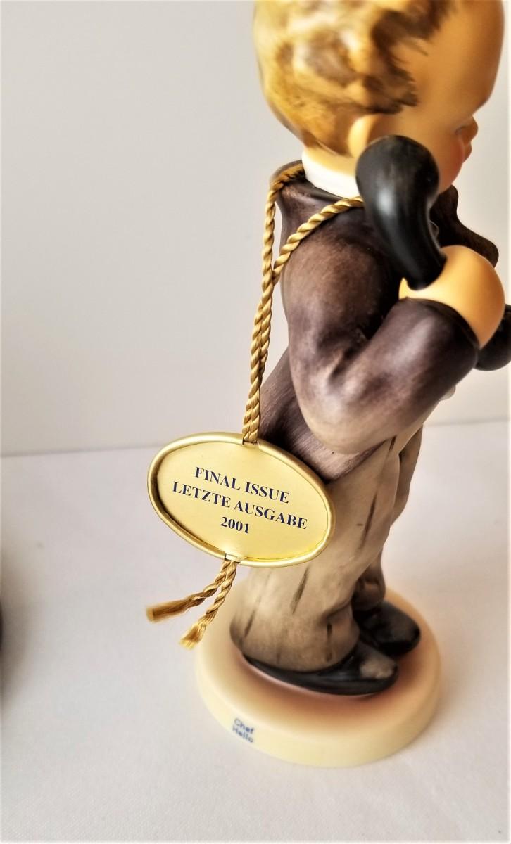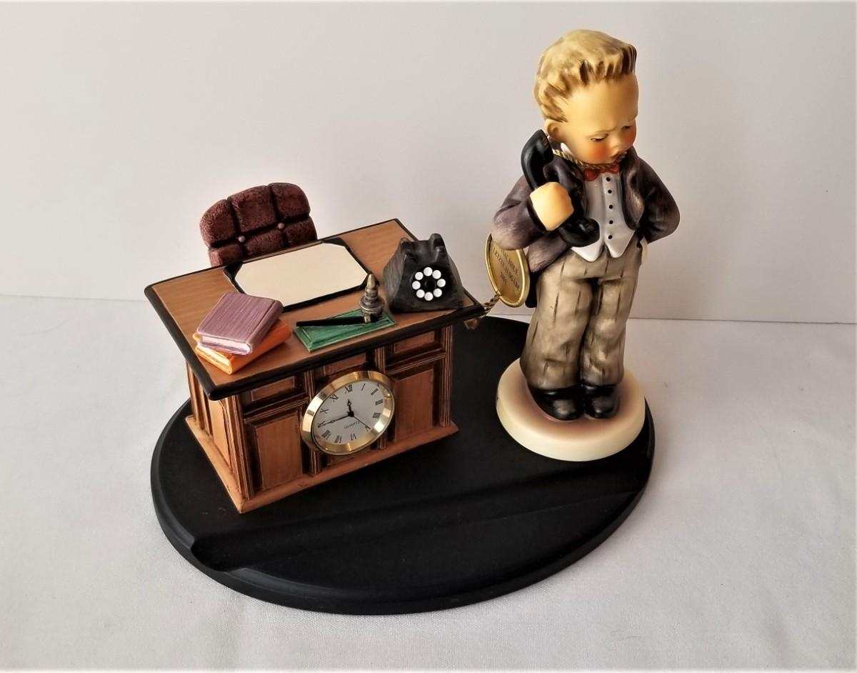 This Goebel Hummel "Just Business" figurine has two pieces with the stand - quartz clock in desk needs a battery. Figure with phone stands 5.5" tall. Dated 2001. Good condition.