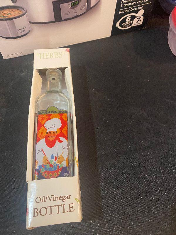 New Crock Pot slow cooker, Kitchen storage containers and an oil & vinegar bottle.