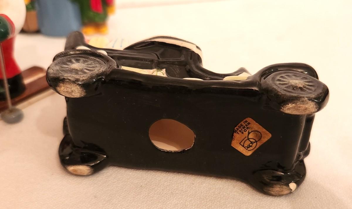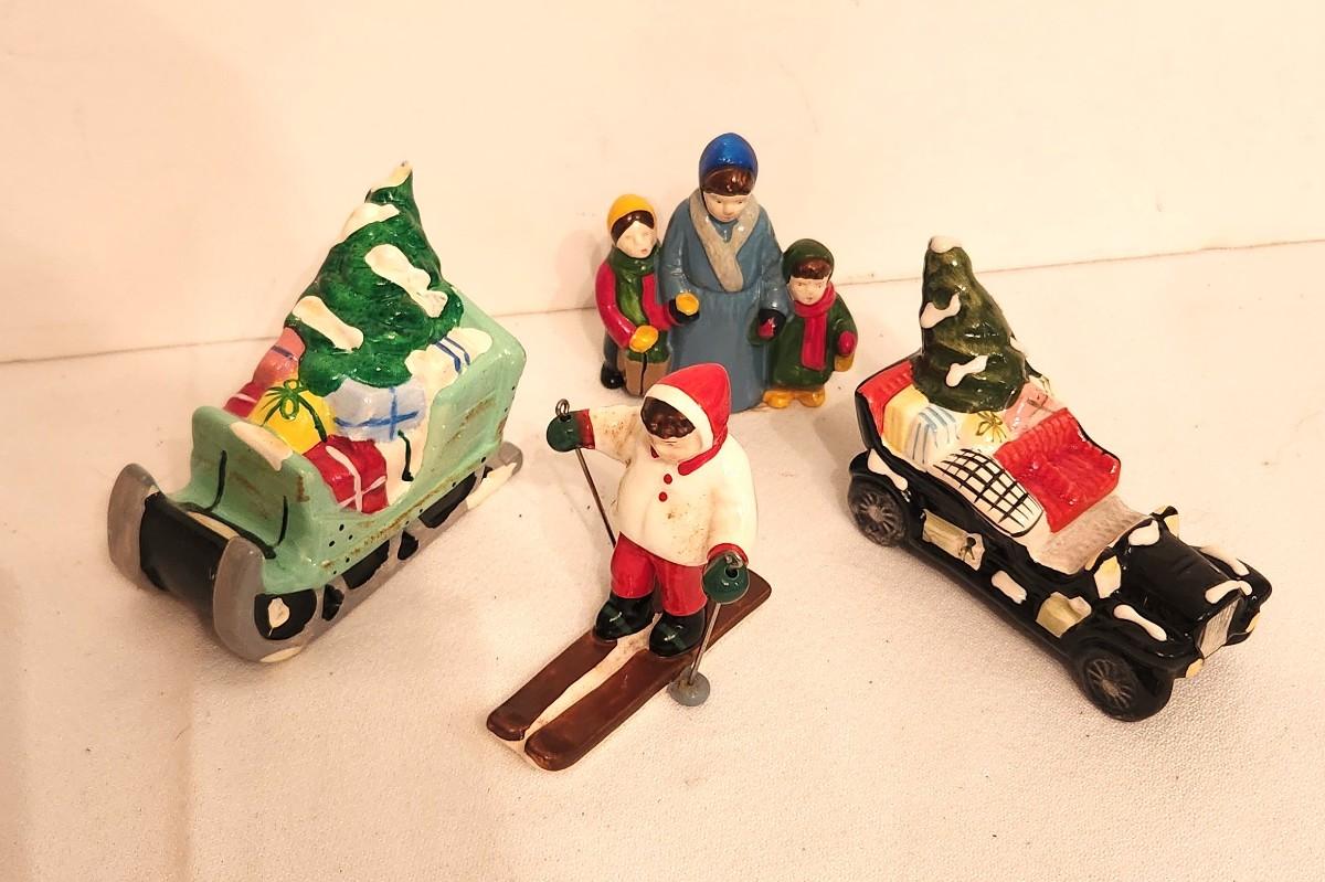 Nice lot of 4 different early Dept 56 Snow Village accessories. You get all you see here: Skier, Mom w/kids, Black car w/tree, and sleigh with tree. All in good condition. No box.