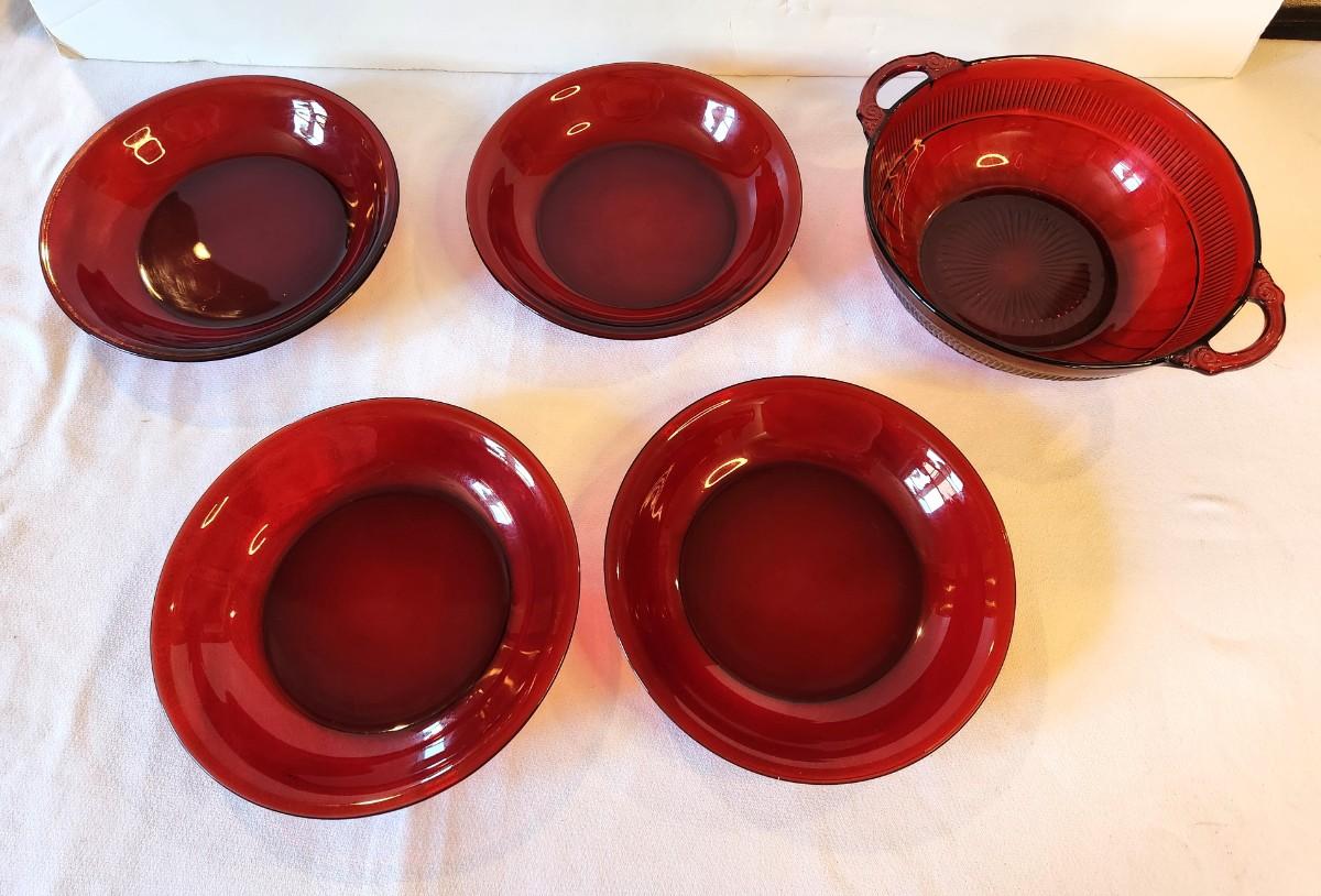 Lot of Vintage Ruby Red Glassware - 4 shallow bowls (probably salad bowls), and 1 handled serving bowl. Handled bowl measures 9.75" across handle to handle. All in good condition.