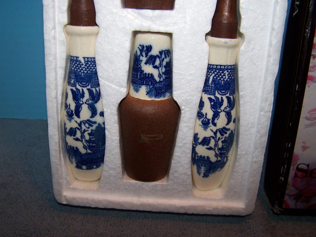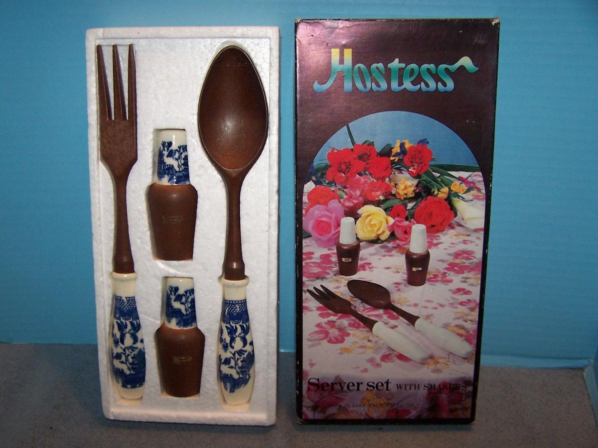 GREAT VINTAGE BLUE WILLOW HOSTESS SET IN BOX... THE BLUE WILLOW PARTS ARE CERAMIC AND THE DARK PARTS ARE WOOD... FORK/SPOON--11'' TALL... BOX HAS SOME LIGHT WEAR, BLUE WILLOW VERY SLIGHT WEAR...